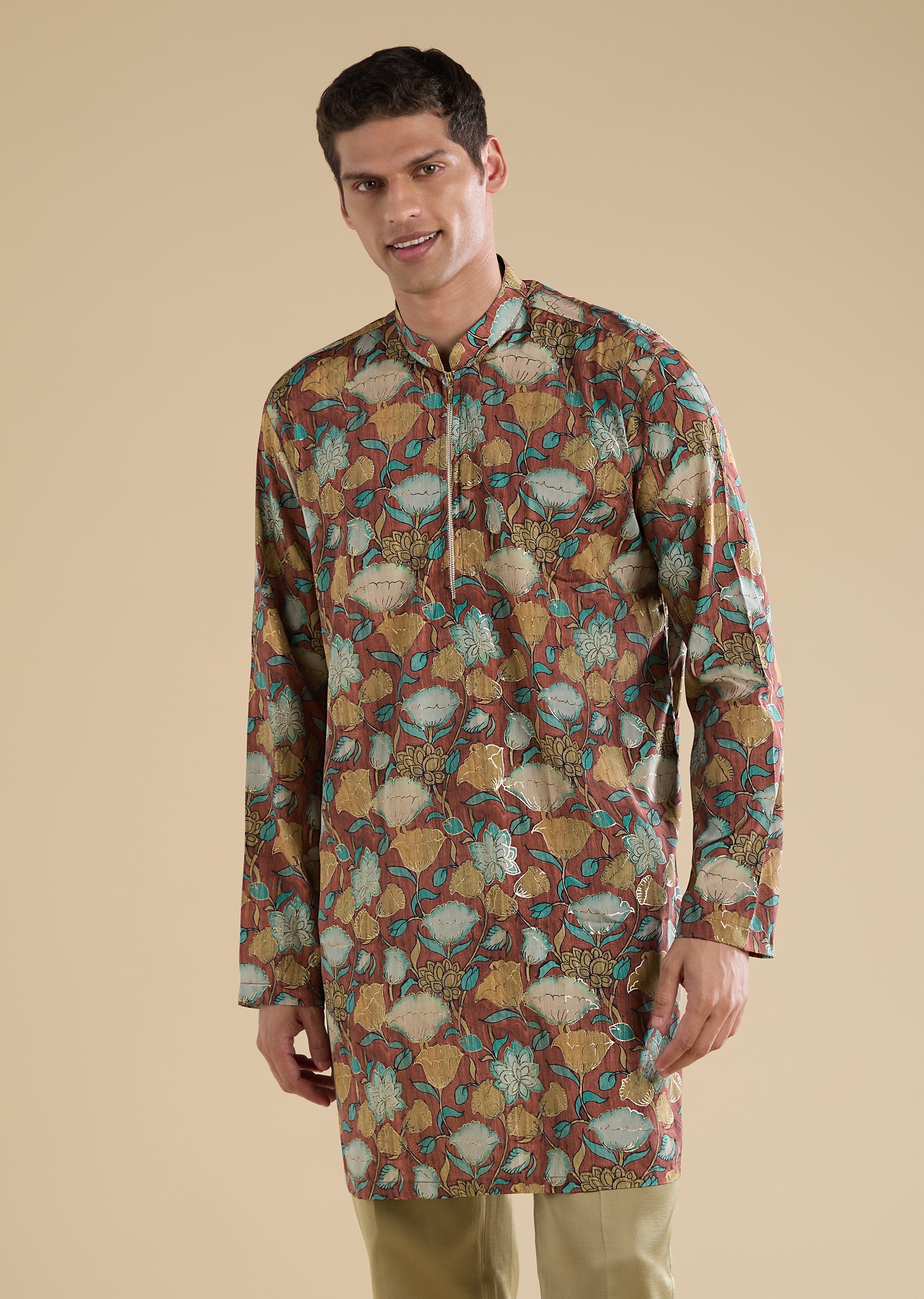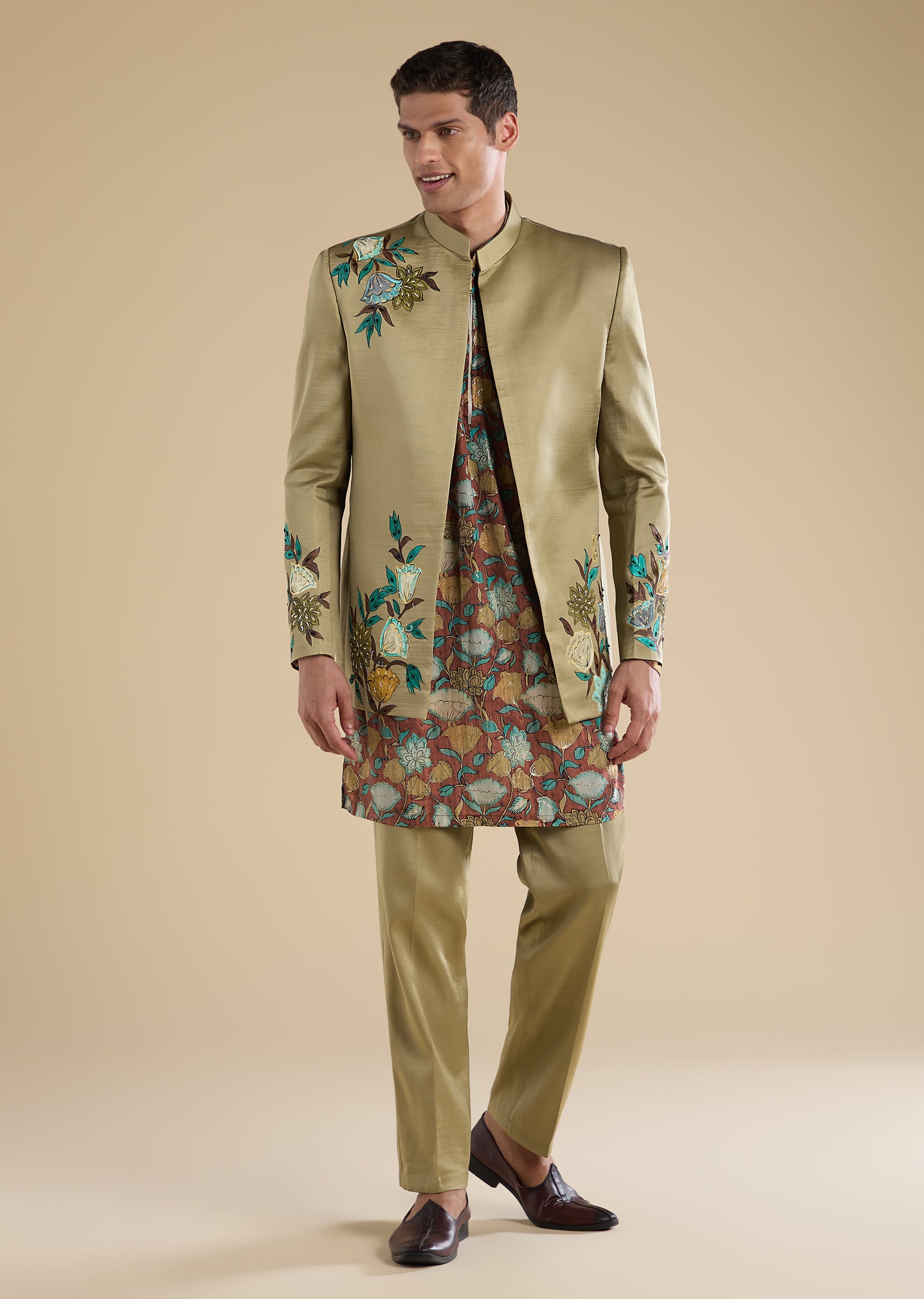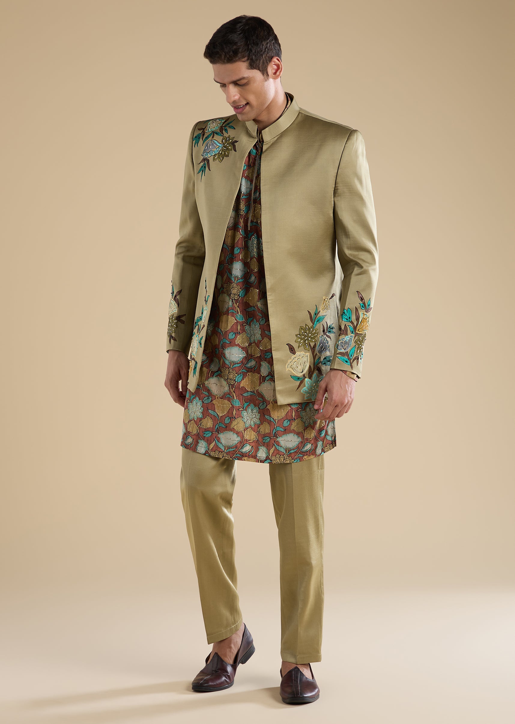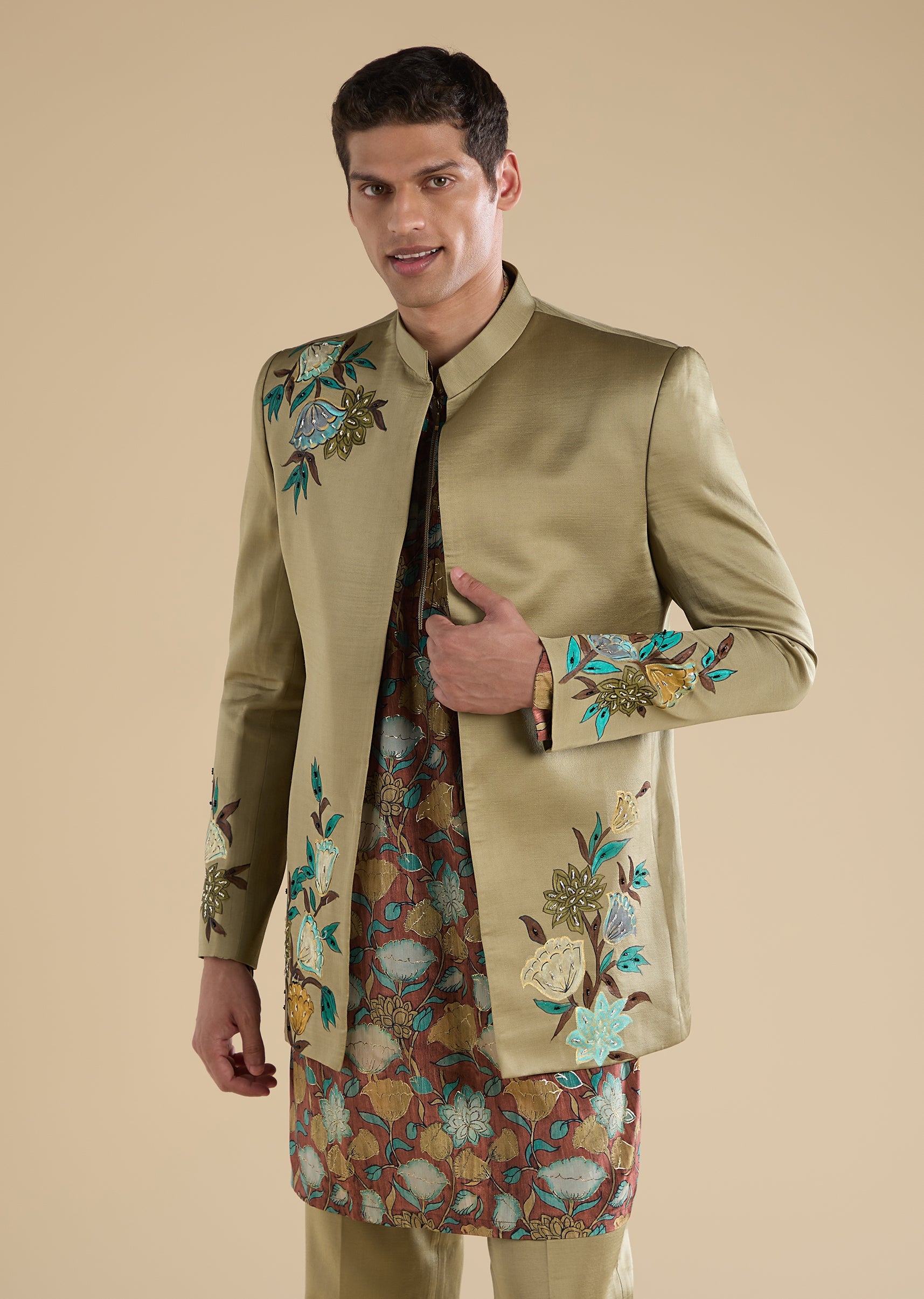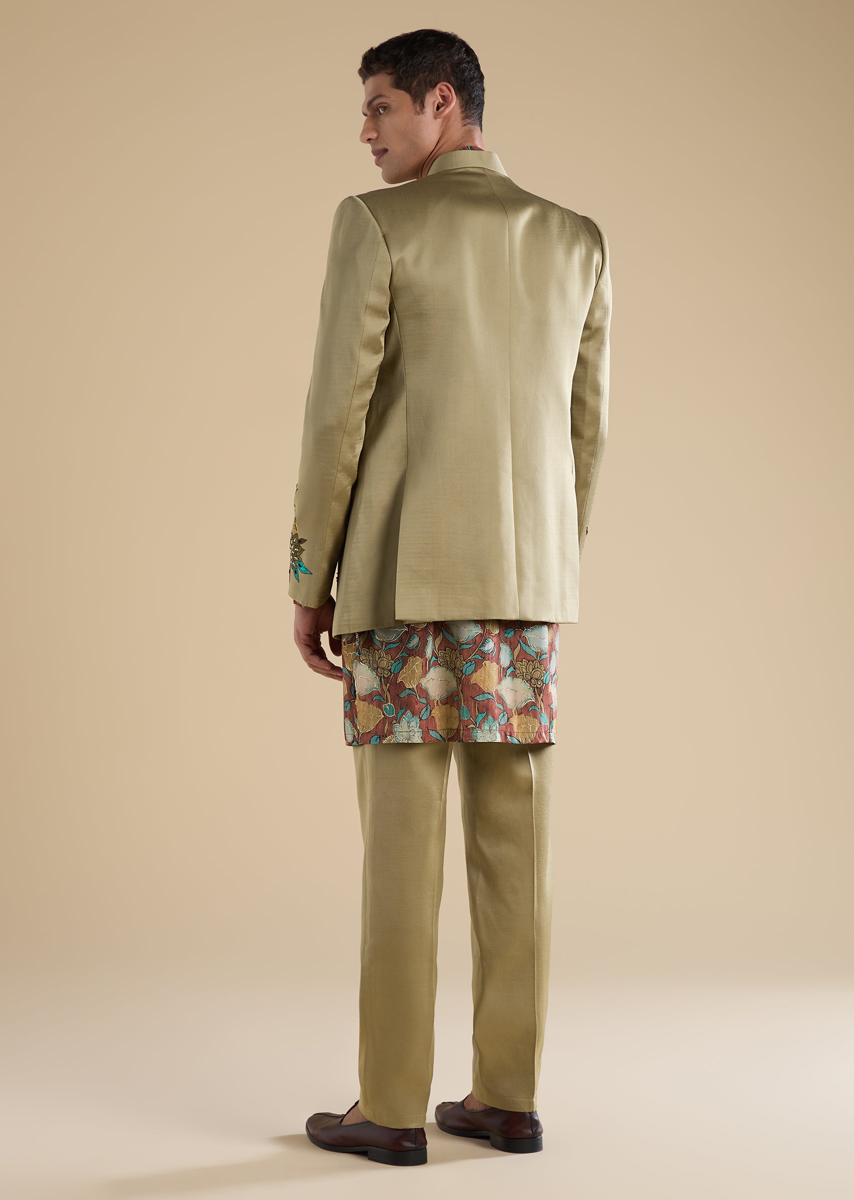 Classic and festive with a refined traditional touch, this green Jodhpuri set is crafted in a silk–linen blend for a rich yet breathable feel. Featuring a mandarin collar, full sleeves, and side slits, the silhouette is elevated with elegant hand-printed motif detailing that adds depth and character. Paired with straight-fit trousers, this ensemble is ideal for mehendi, engagement, and sangeet celebrations—perfect for groomsmen and groom’s brothers seeking timeless sophistication. Awarded as the Most Trusted Brand, we're delivering styles you love, just as promised.