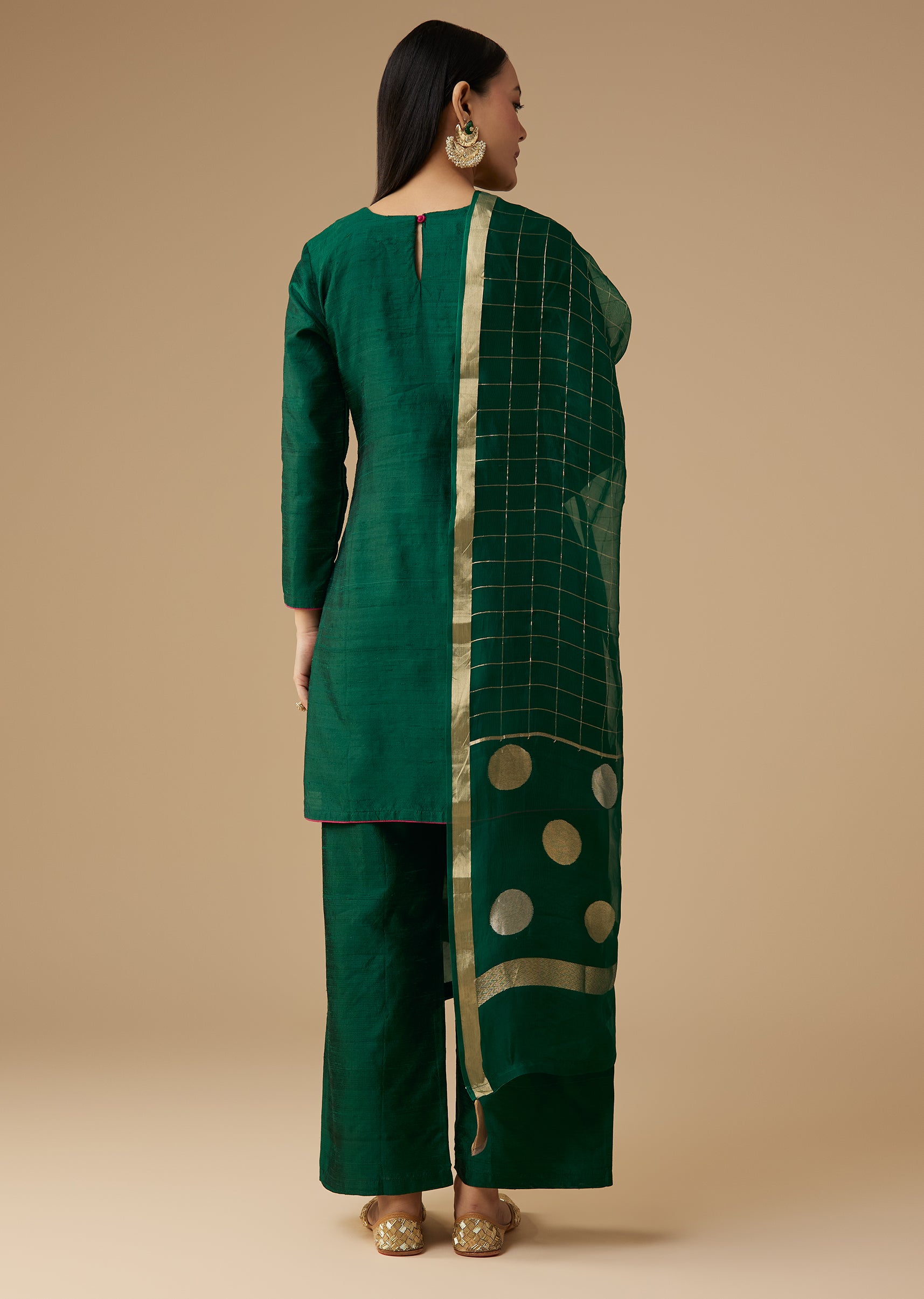 Step into elegant festivity with this green pure raw silk kurta set, adorned with intricate zardosi and cutdana work that lends a rich, traditional sparkle. The pure raw silk fabric enhances the outfit with a luxurious sheen, while the coordinated pant and dupatta create a refined, balanced silhouette. Perfect for weddings, festive gatherings, or special occasions, this ensemble blends classic craftsmanship with graceful sophistication. Awarded as the Most Trusted Brand, we're delivering styles you love, just as promised.
