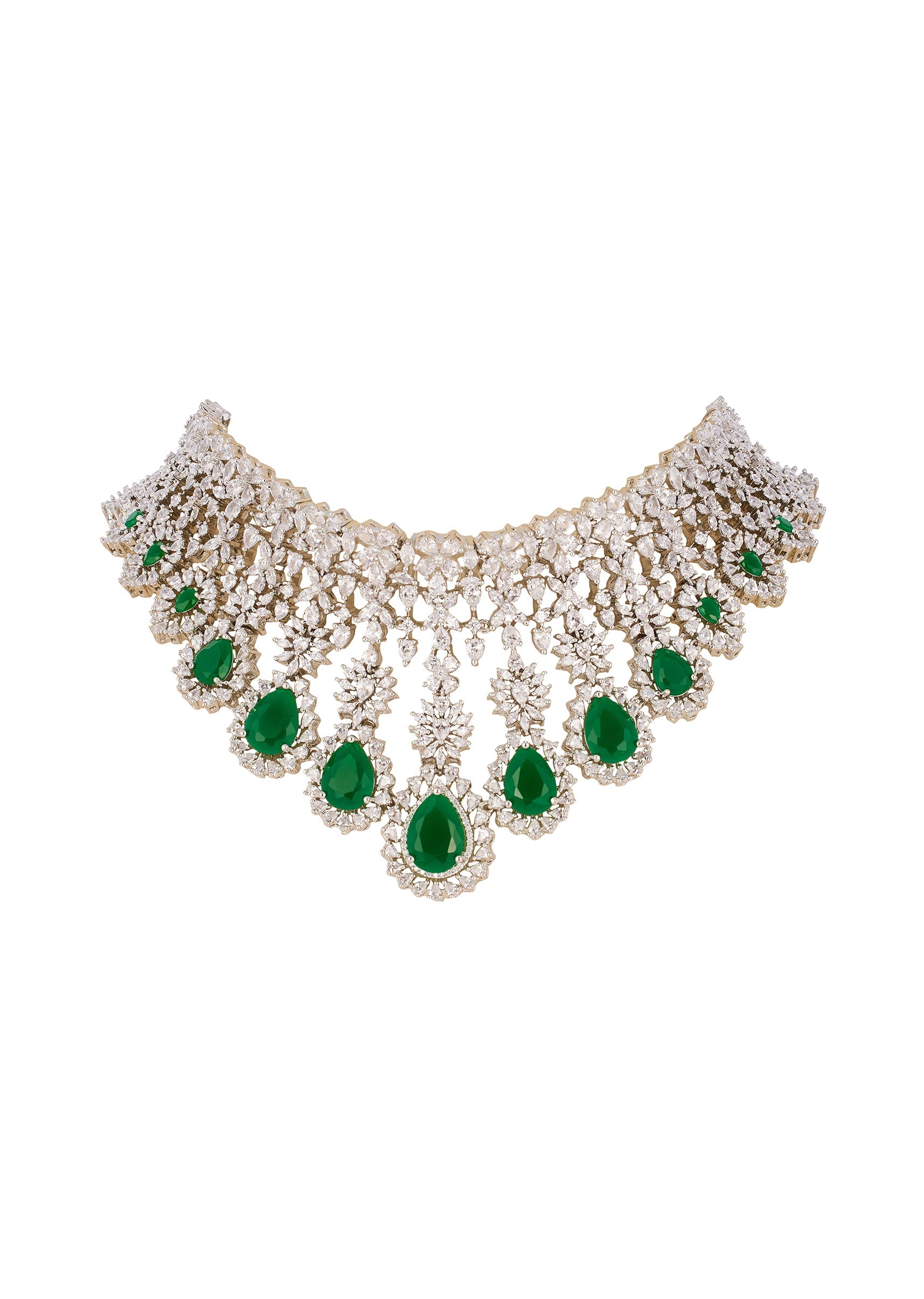Green Rhodium Plated Cz Diamond Necklace Set with Anti Tarnish Finish