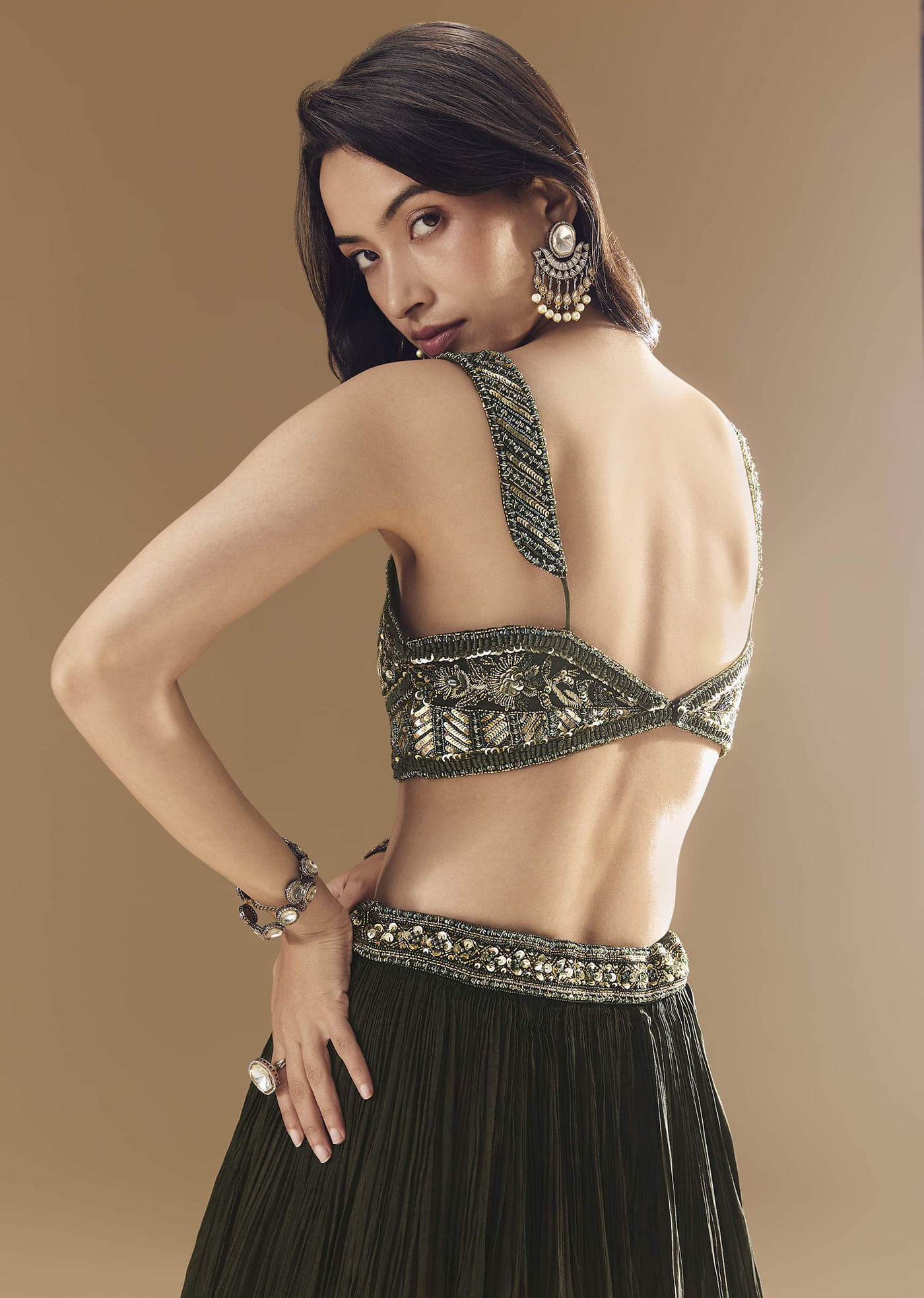 Designed for the modern bridesmaid, this green ruched lehenga set strikes the perfect balance between elegance and contemporary charm. The lehenga features soft ruching that flatters the silhouette, while the... More Product Details
