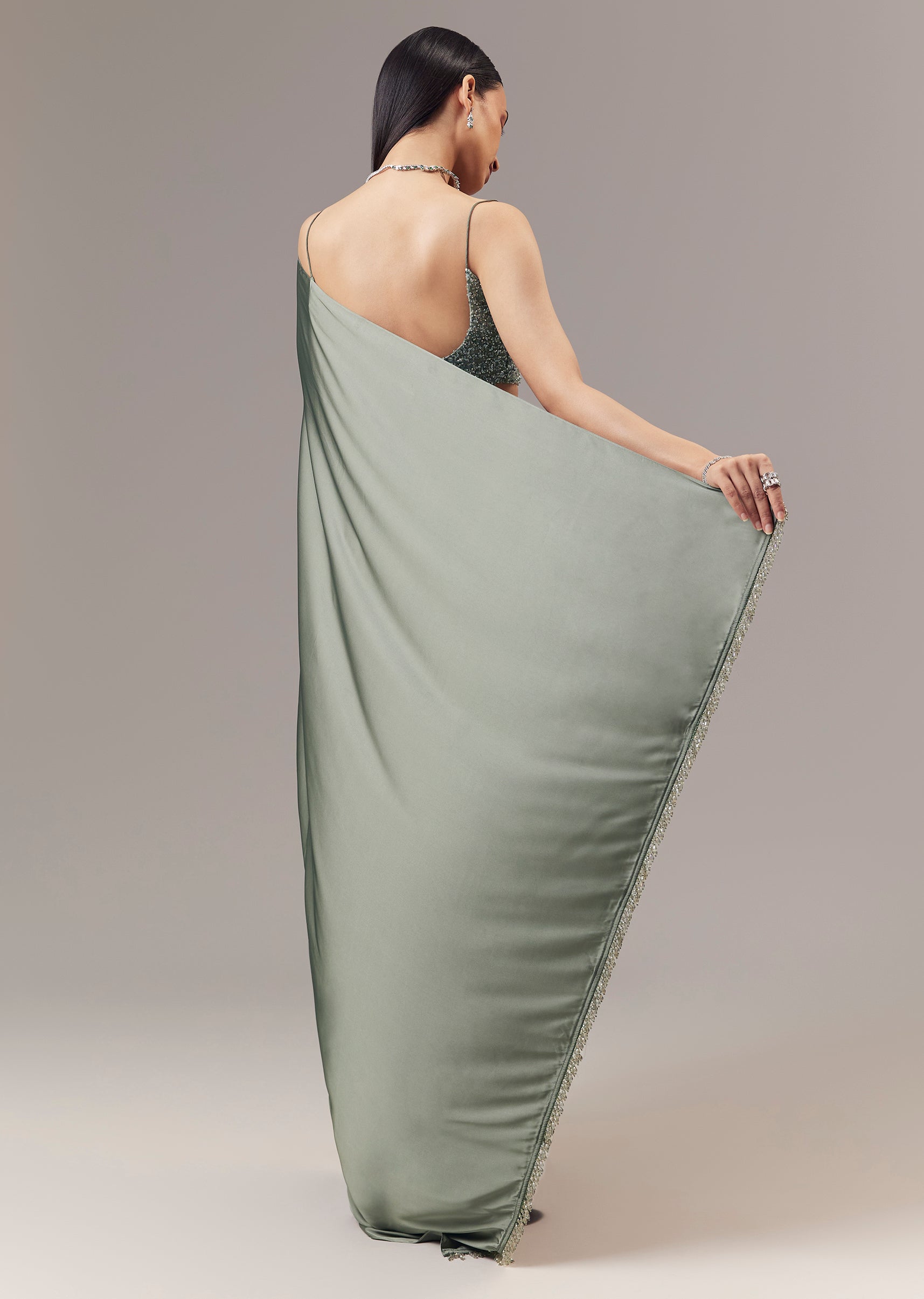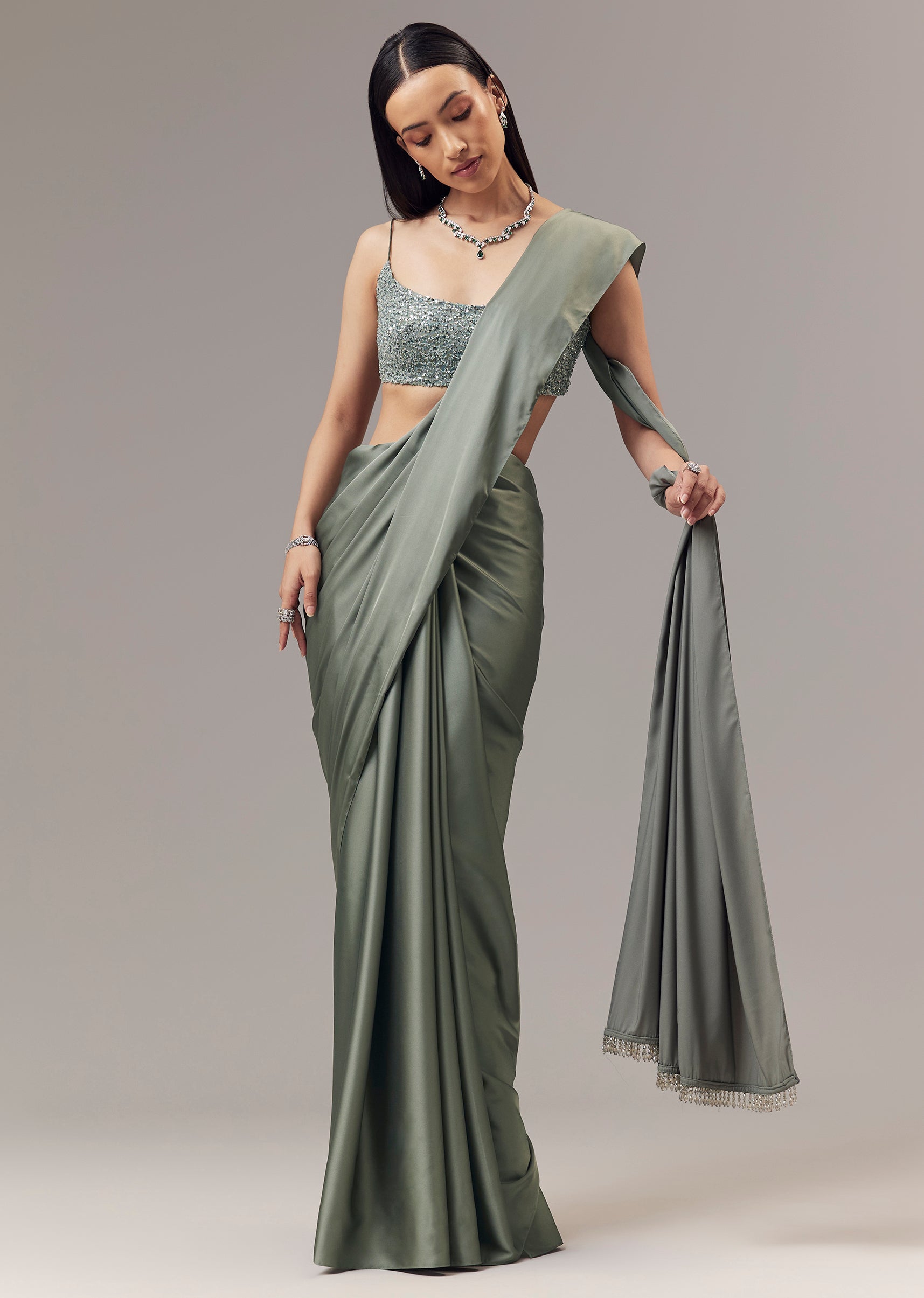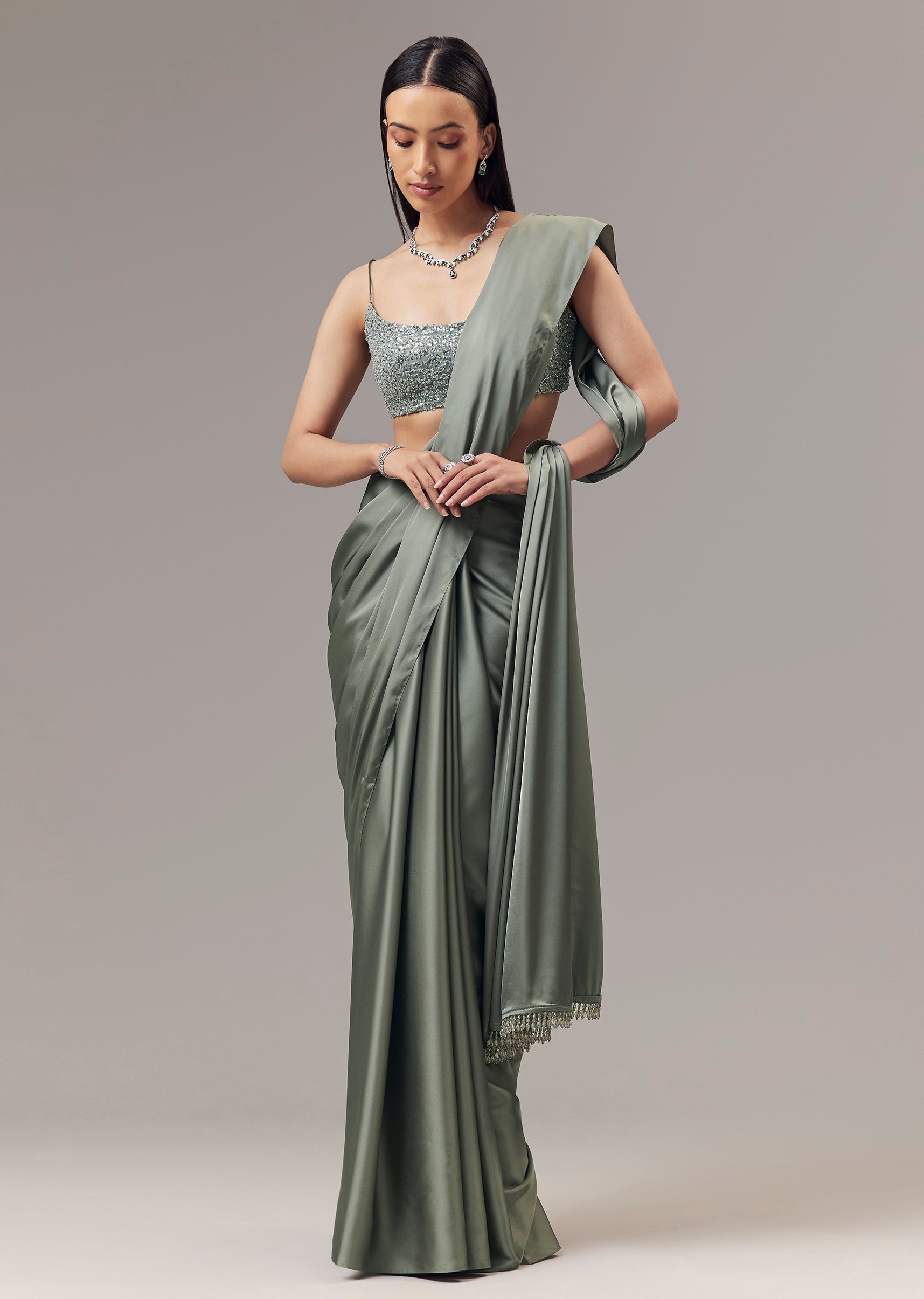 A graceful green saree crafted in a smooth satin blend, designed for party and cocktail occasions as a guest. The saree features a fluid open drape with a soft sheen... More Product Details