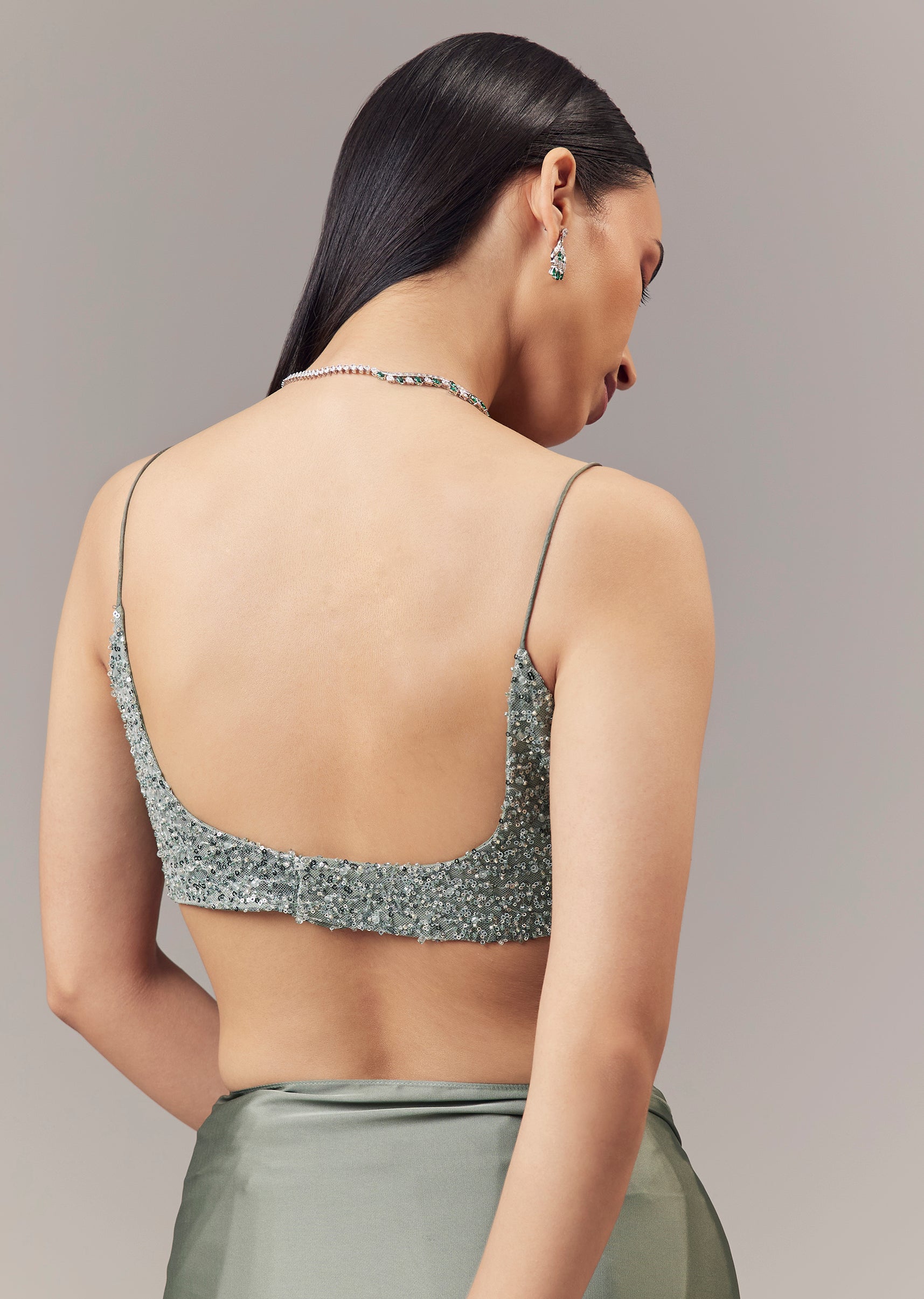 Style it with statement earrings and strappy heels to highlight the rich green tone and embellished blouse.