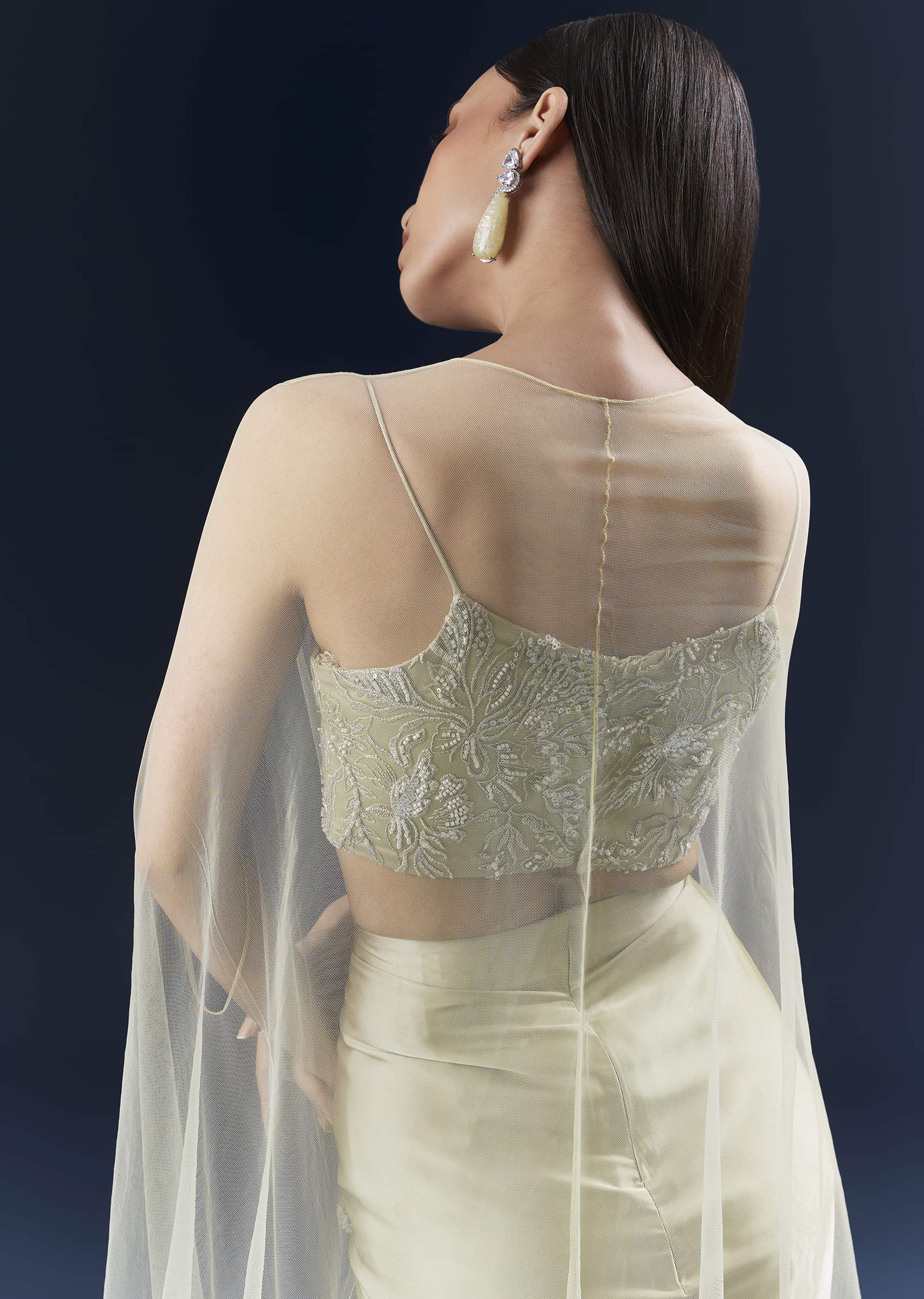 For layered shine with runway ease, this green satin crop top and drape skirt set combines a green embroidered blouse, a fluid drape skirt, and a light cape that frames... More Product Details