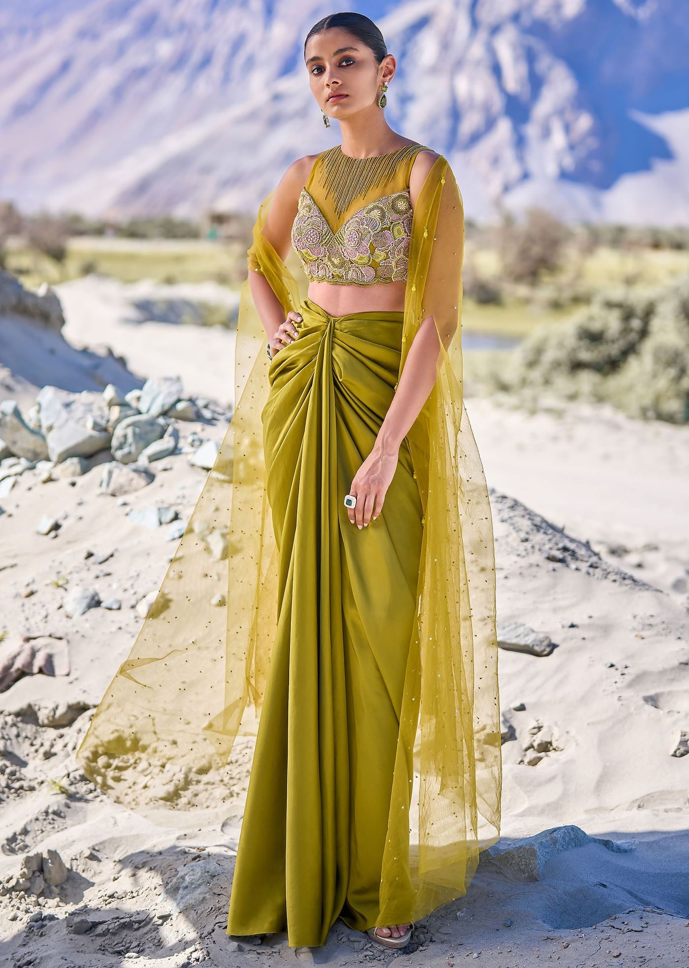 Green Satin Drape Skirt With Embroidered Blouse And Net Cape