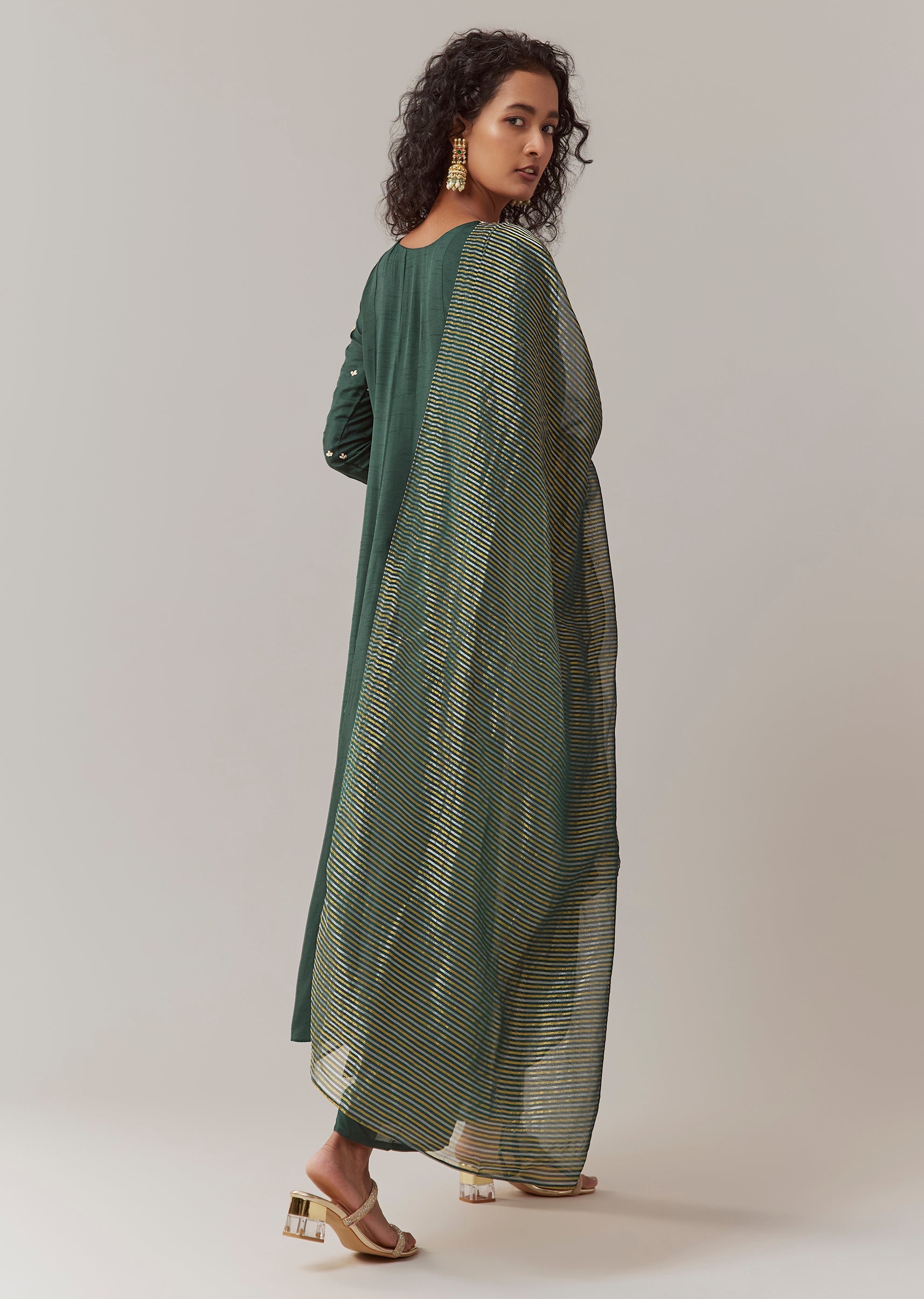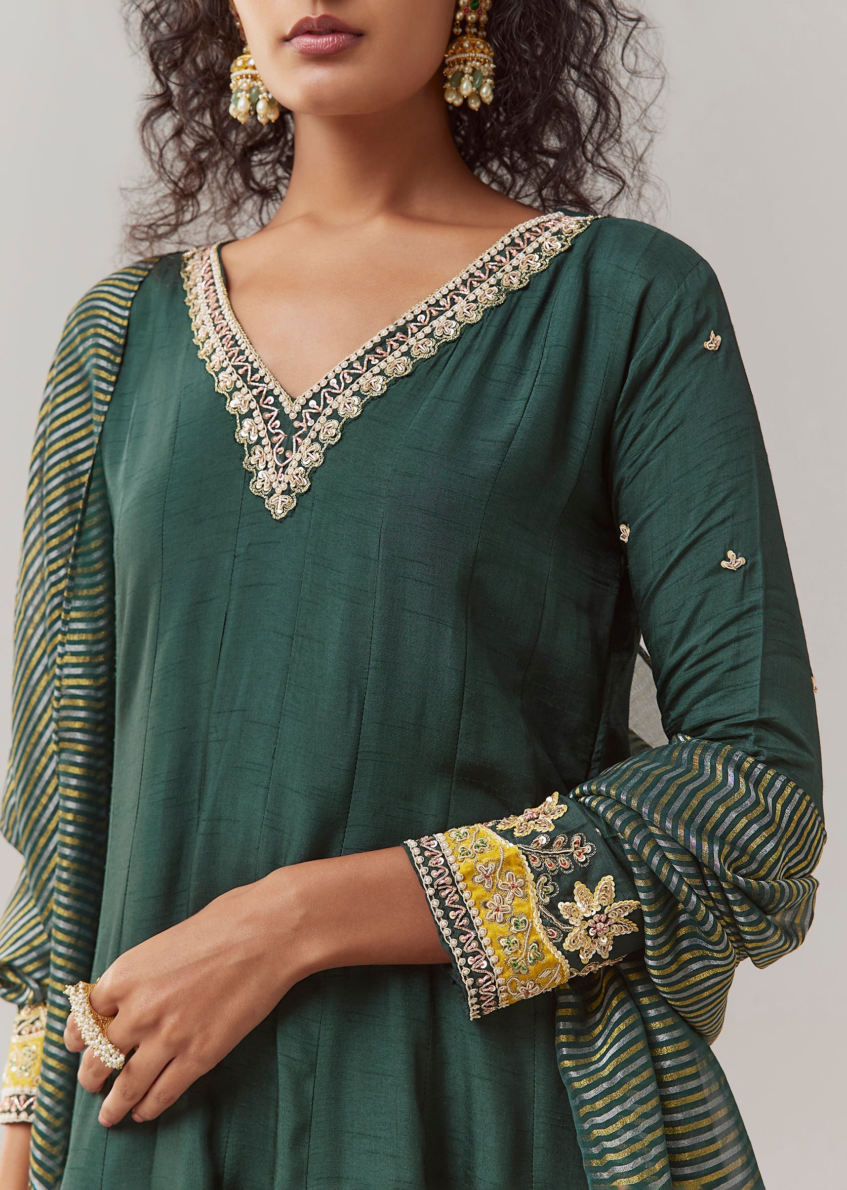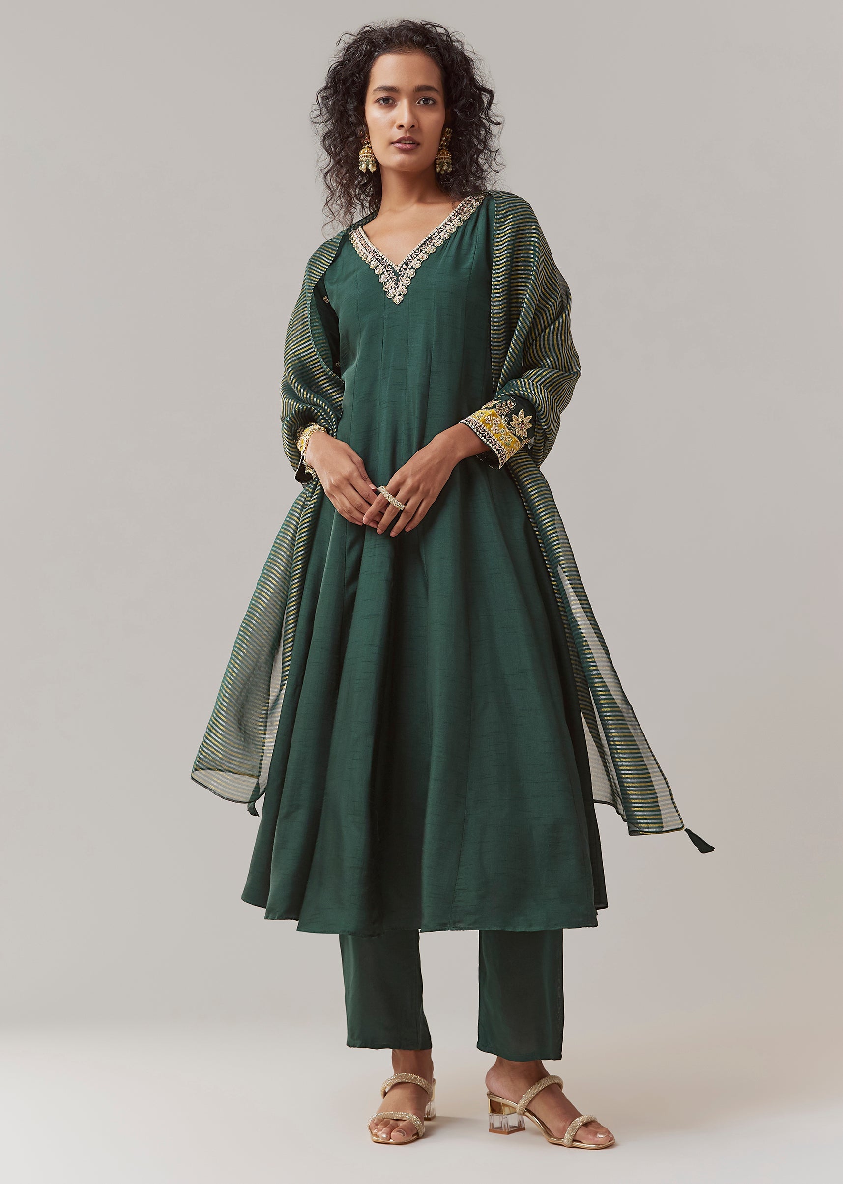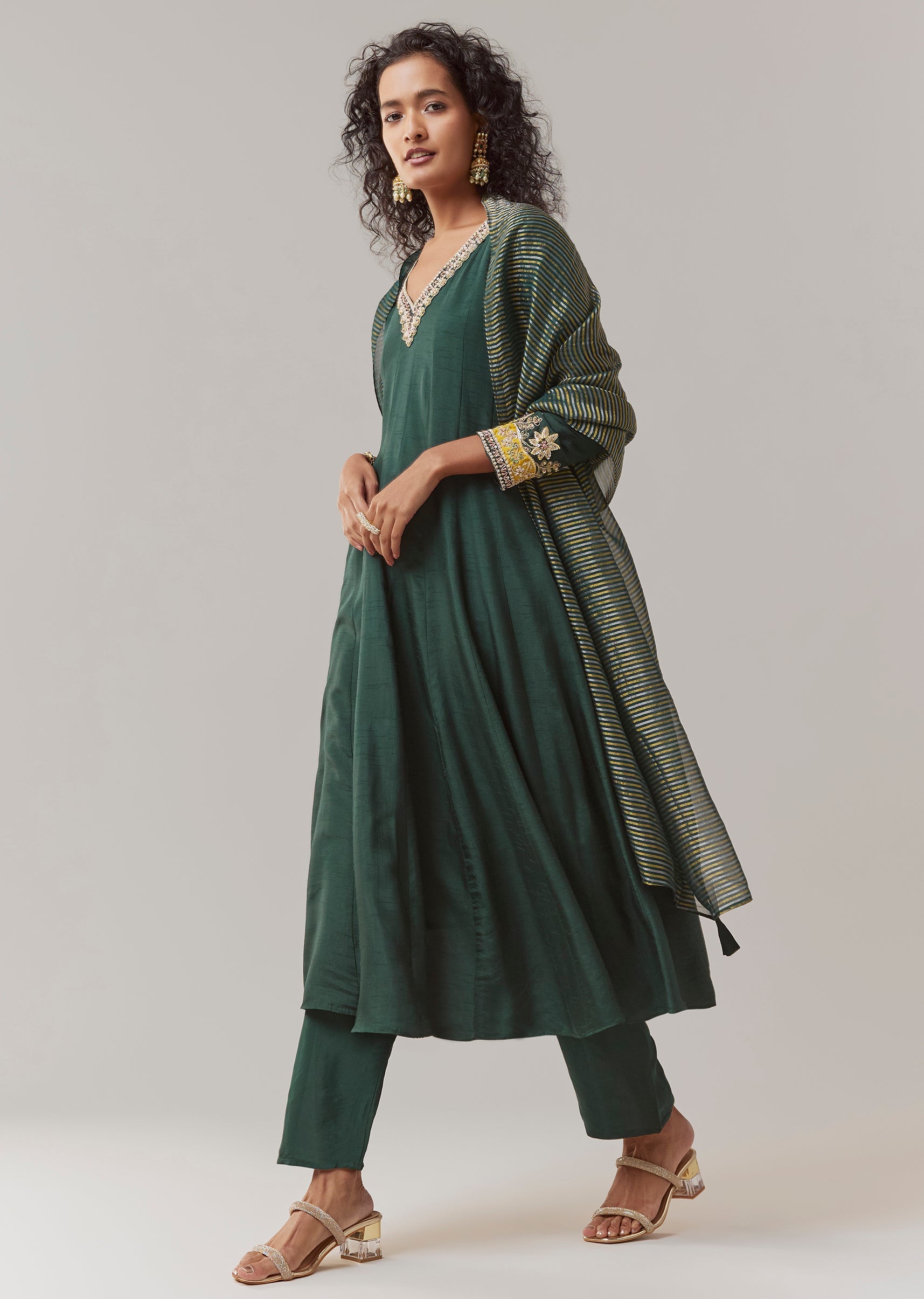 Designed for moments that call for quiet luxury, this silk anarkali showcases exquisite zardosi, sequins, and moti embellishments with timeless finesse. The refined V neckline and 3/4th sleeves lend a... More Product Details