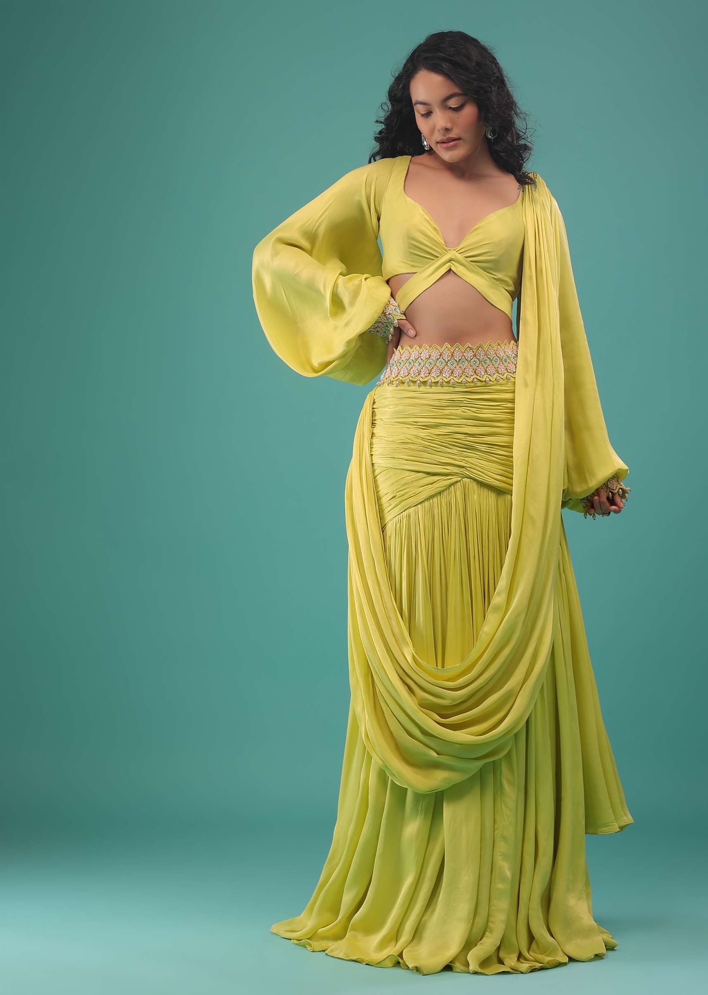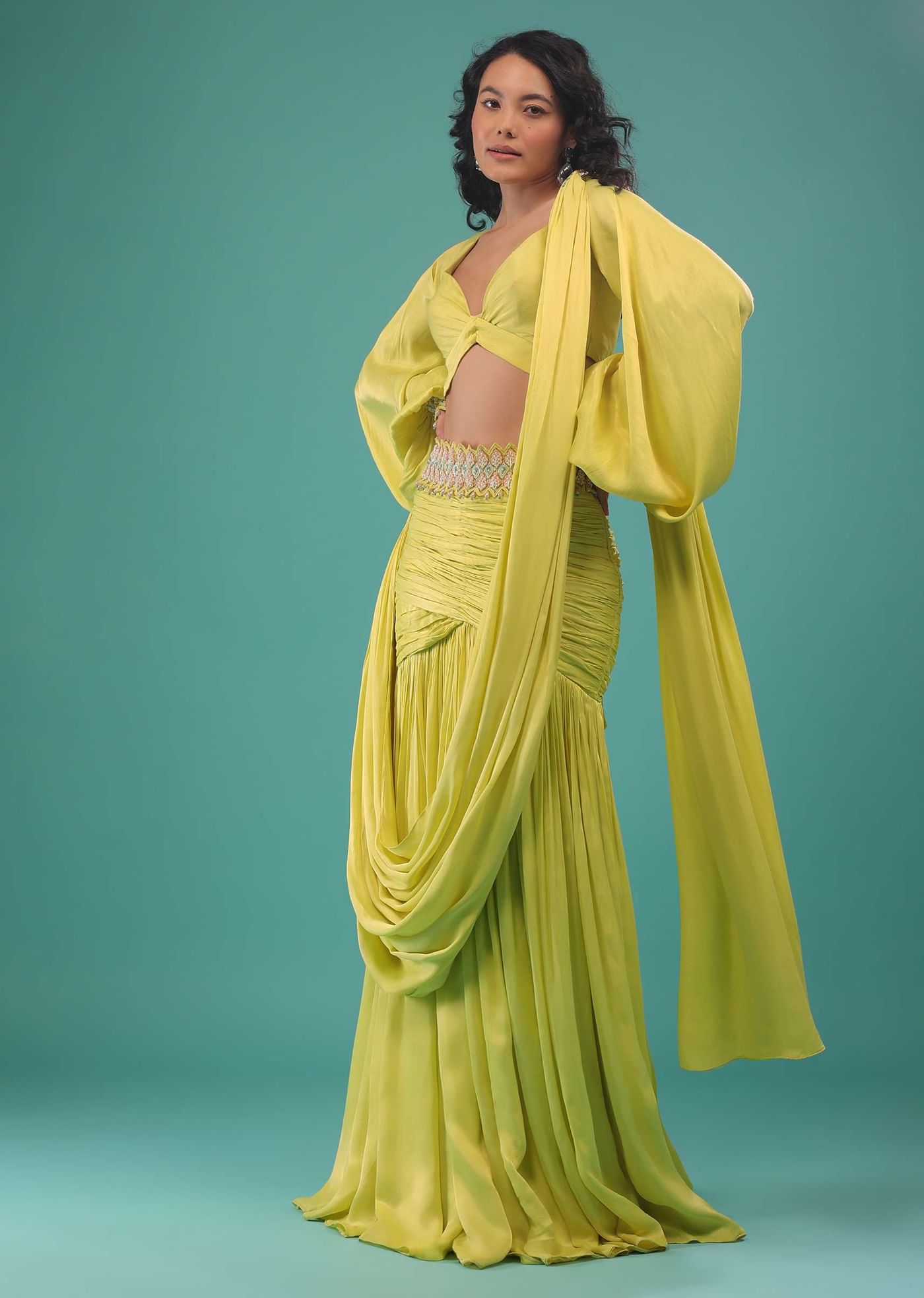 Green sheen yellow ready to wear saree with sequins, cut dana, and beads embroidery. The outfit is fabricated in satin. The ready to wear saree has a side zip closure... More Product Details