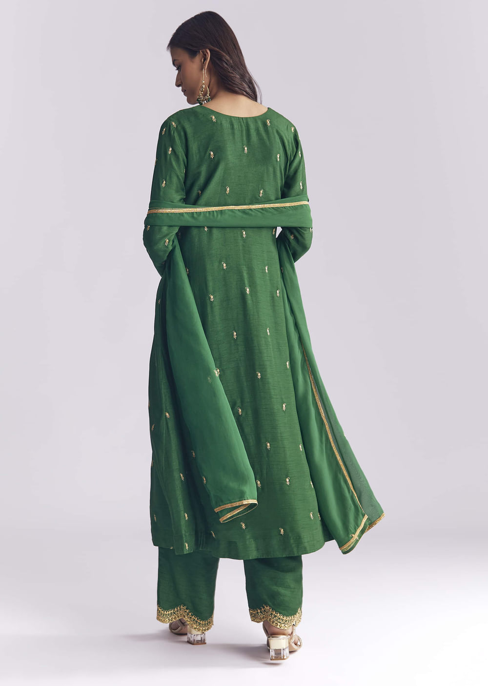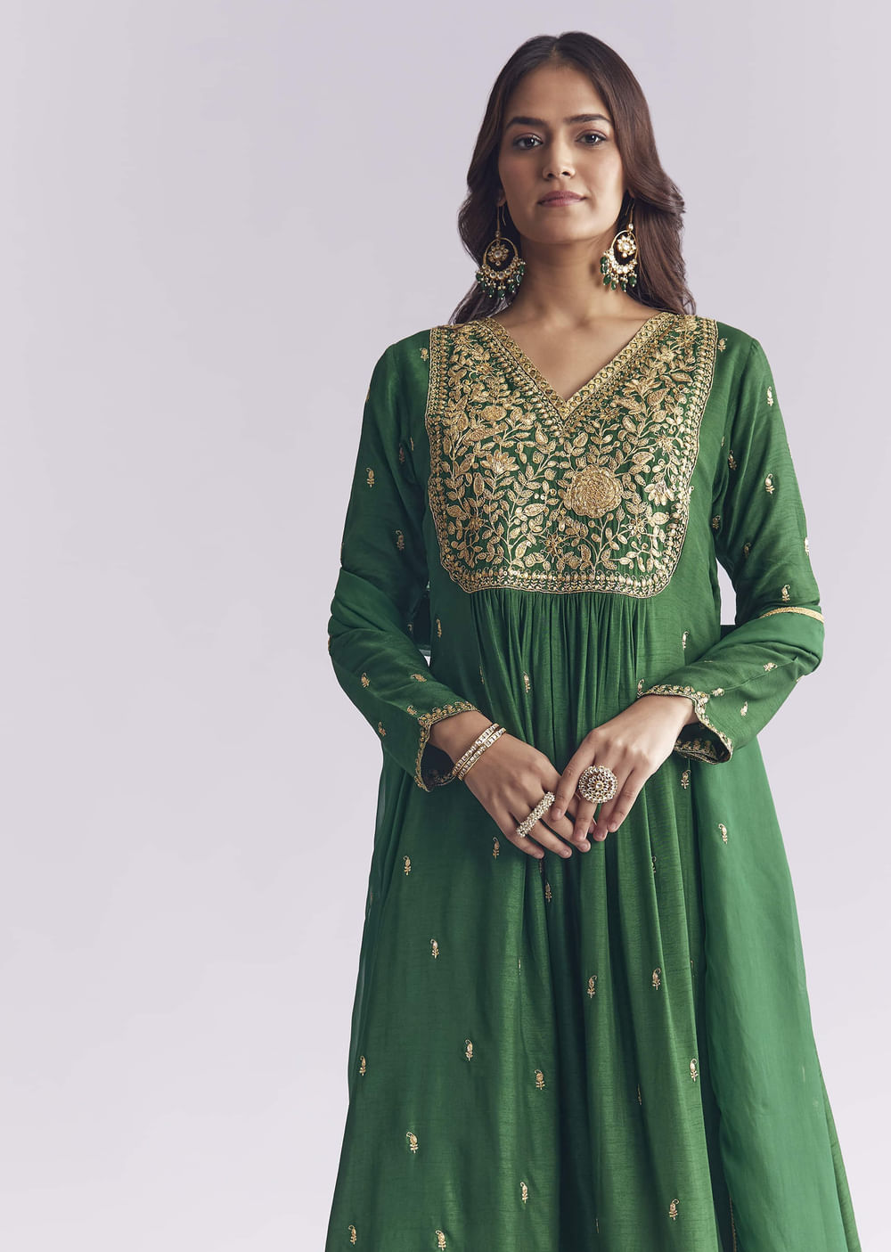 For graceful colour that photographs beautifully, this green silk anarkali suit blends soft lustre with curated craft. Zari thread work traces the bodice and panels to keep the look polished... More Product Details