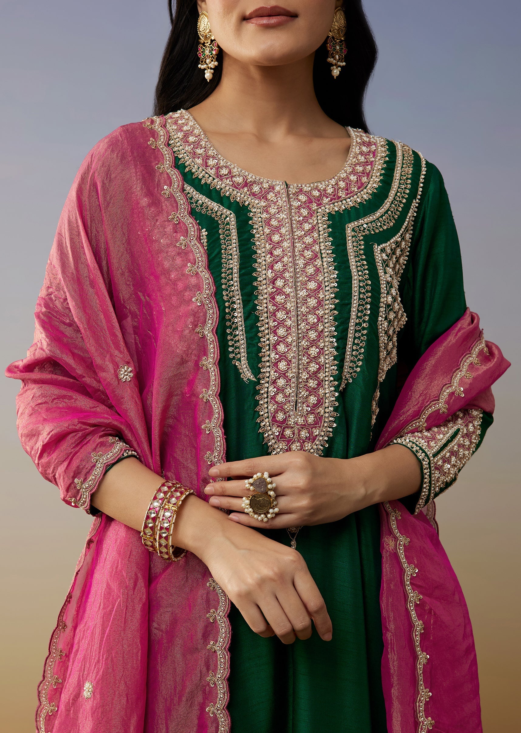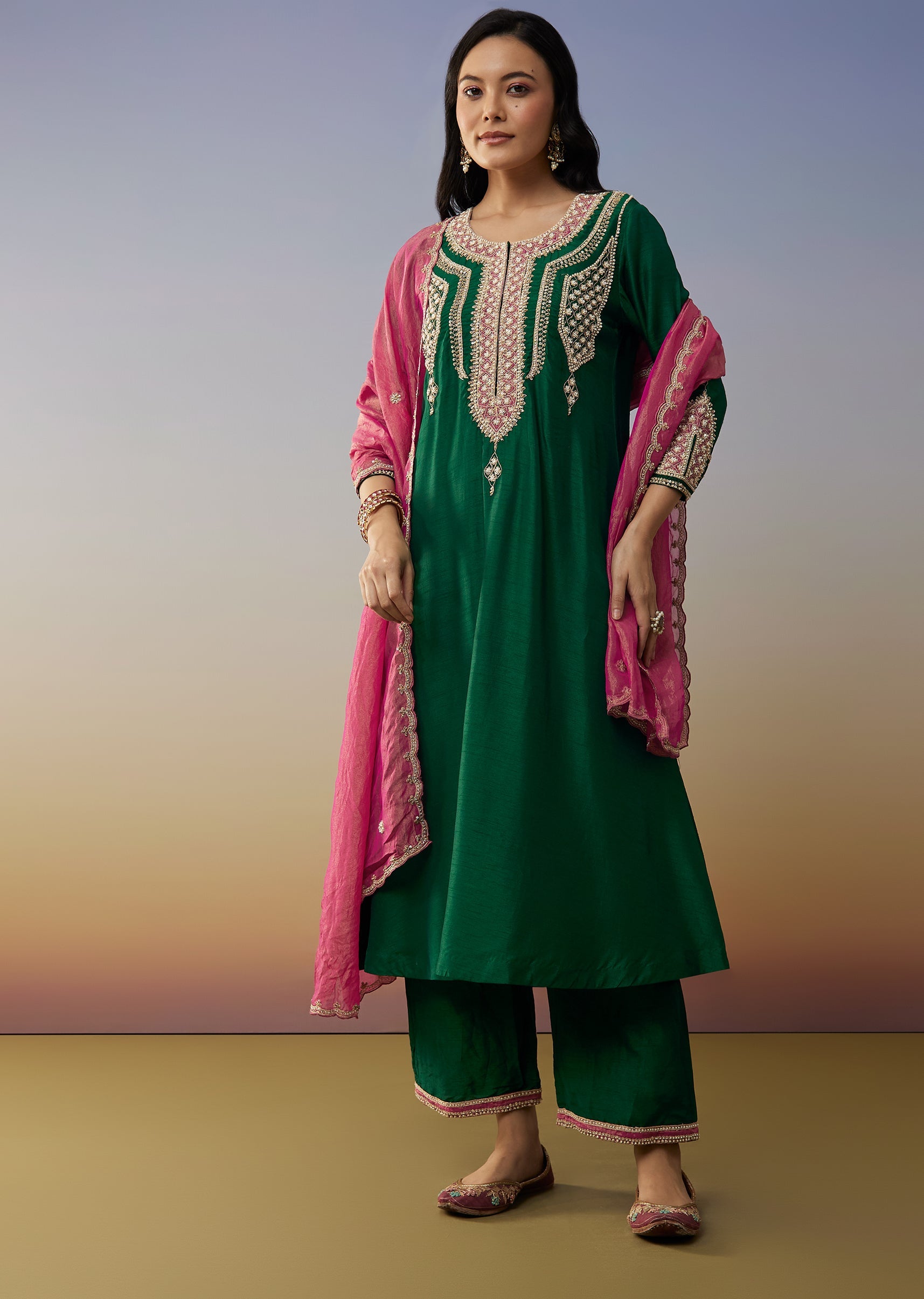 Green Silk Anarkali Suits with Moti and Sequins Work