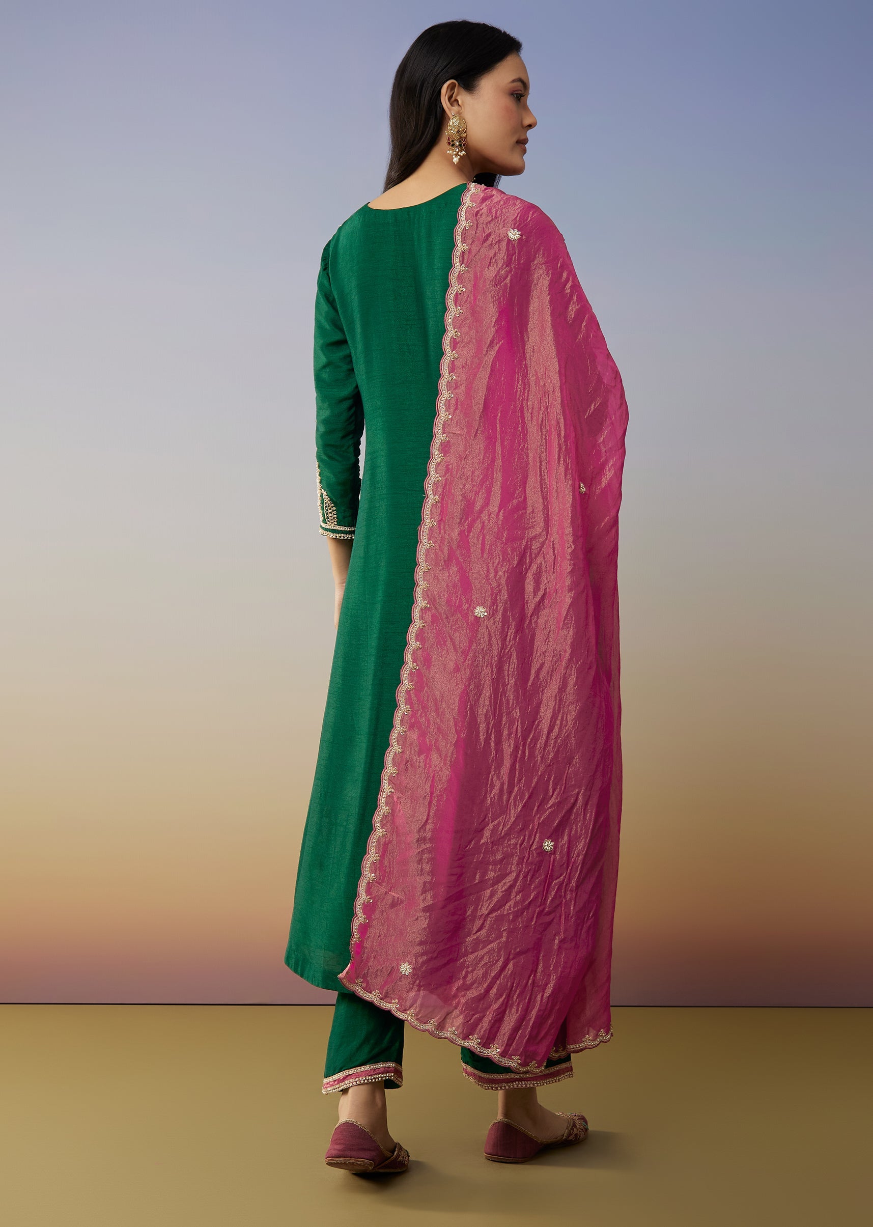 This green anarkali suit brings a refreshing festive charm to mehendi and wedding celebrations. Designed in a 45 inch a line silhouette it features a beautifully crafted patch yoke enhanced... More Product Details