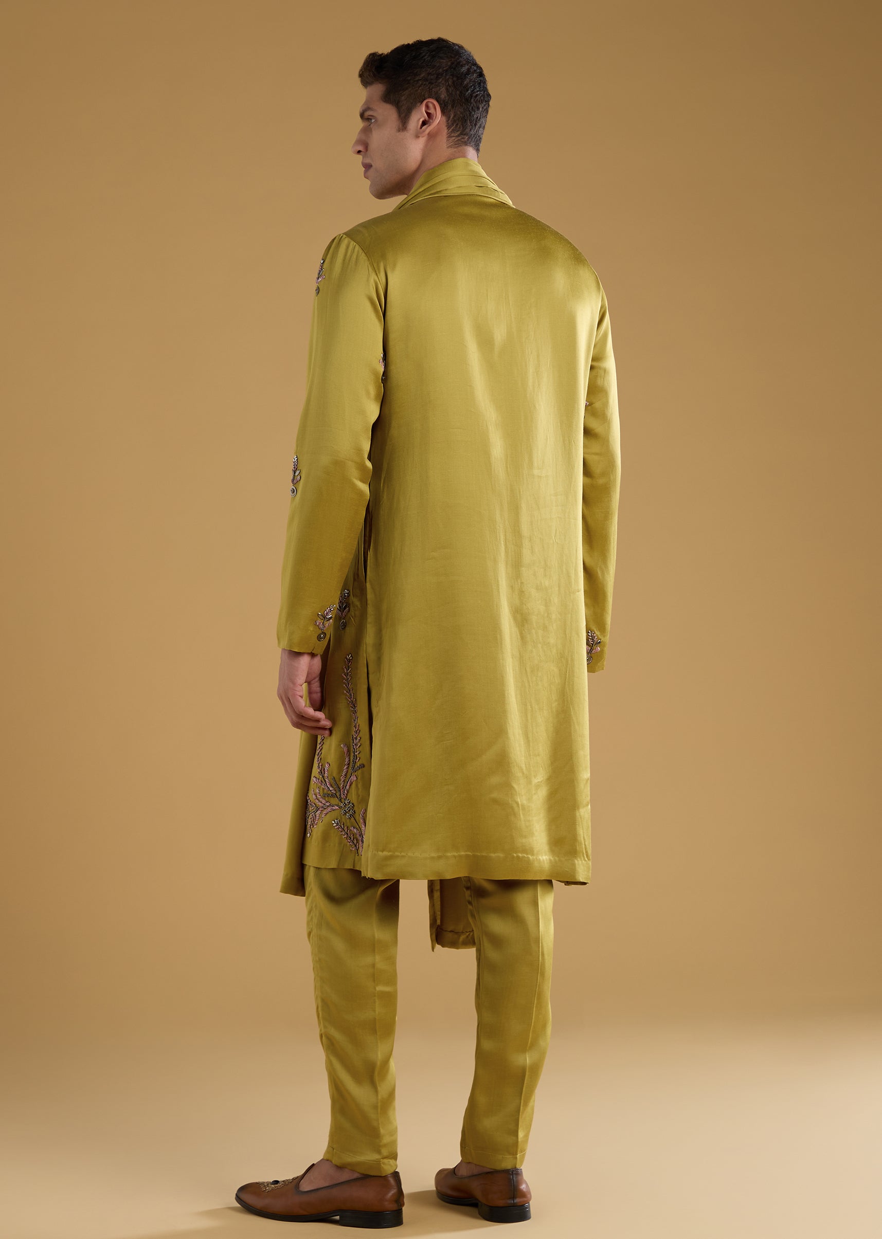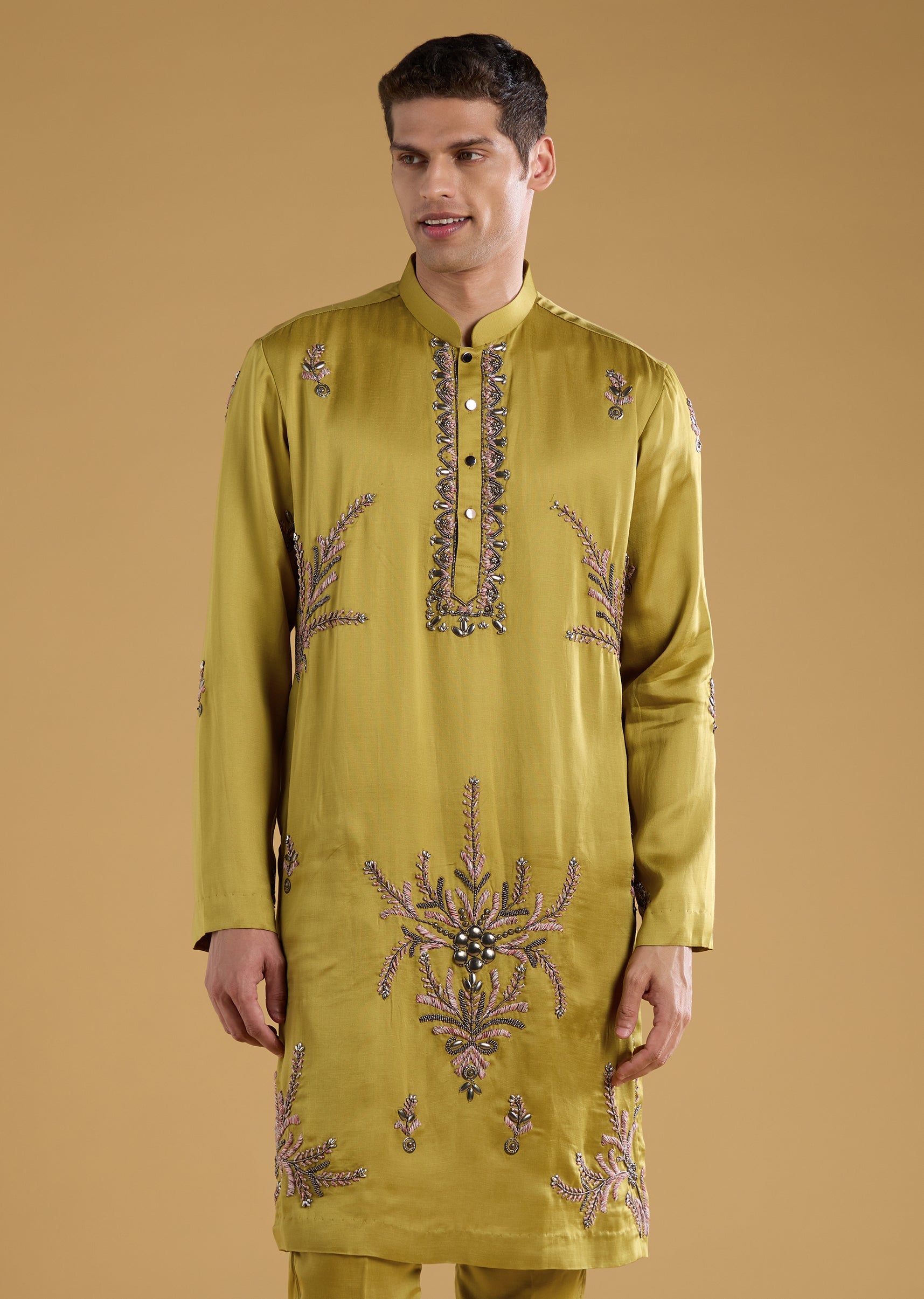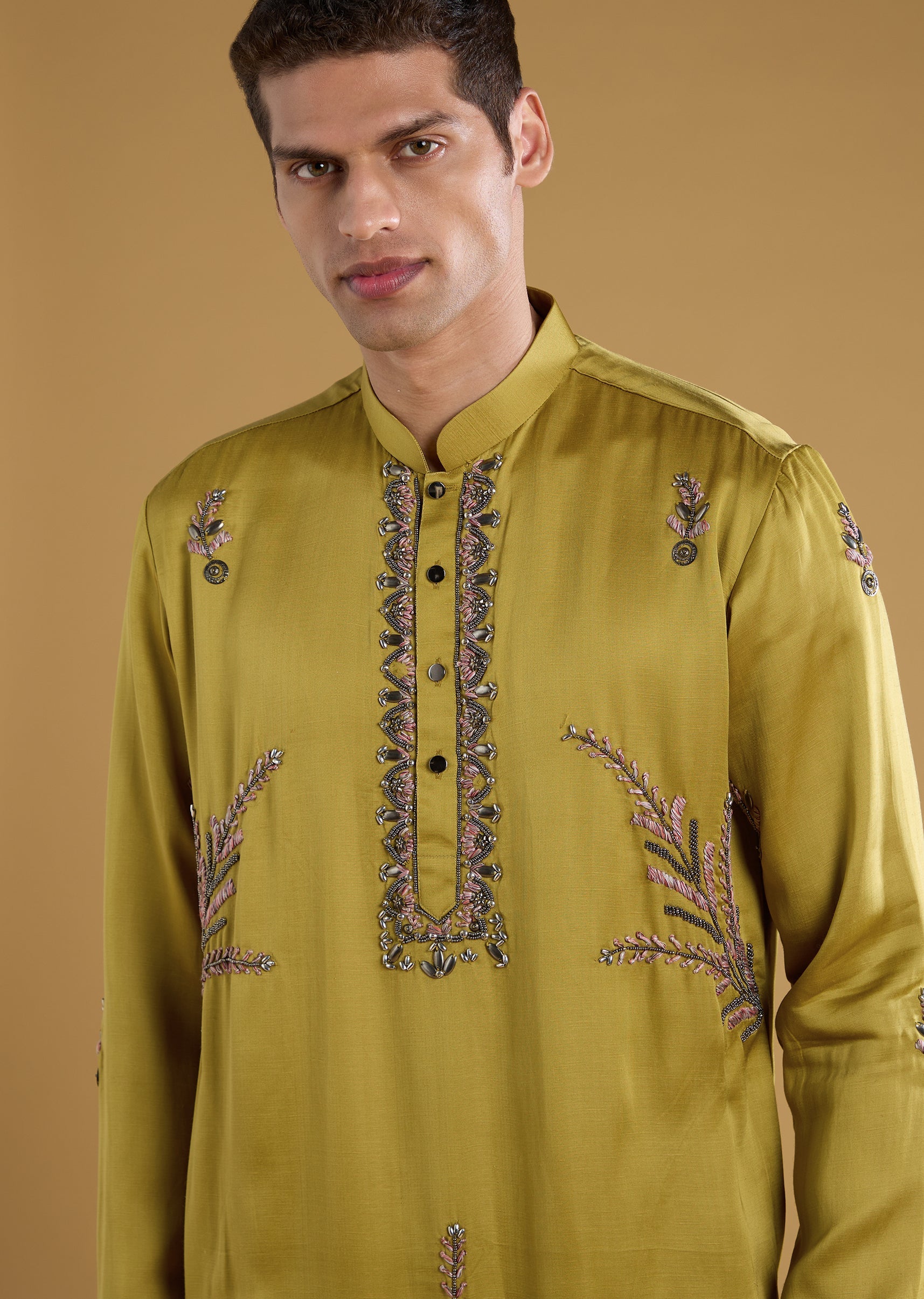 Green Silk Bead Work Men's Kurta Set with Dupatta