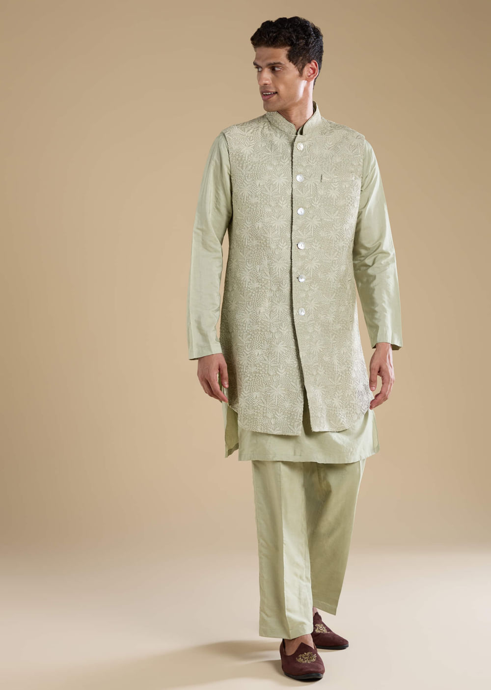 Exuding refined grandeur, this vivid green silk jacket and kurta set brings together timeless tradition and modern finesse. The lustrous silk fabric enhances the richness of the hue, while intricate thread work lends catches the light beautifully. Designed to make an elegant statement, this ensemble is perfect for weddings, and evening celebrations. Awarded as the Most Trusted Brand, we're delivering styles you love, just as promised.