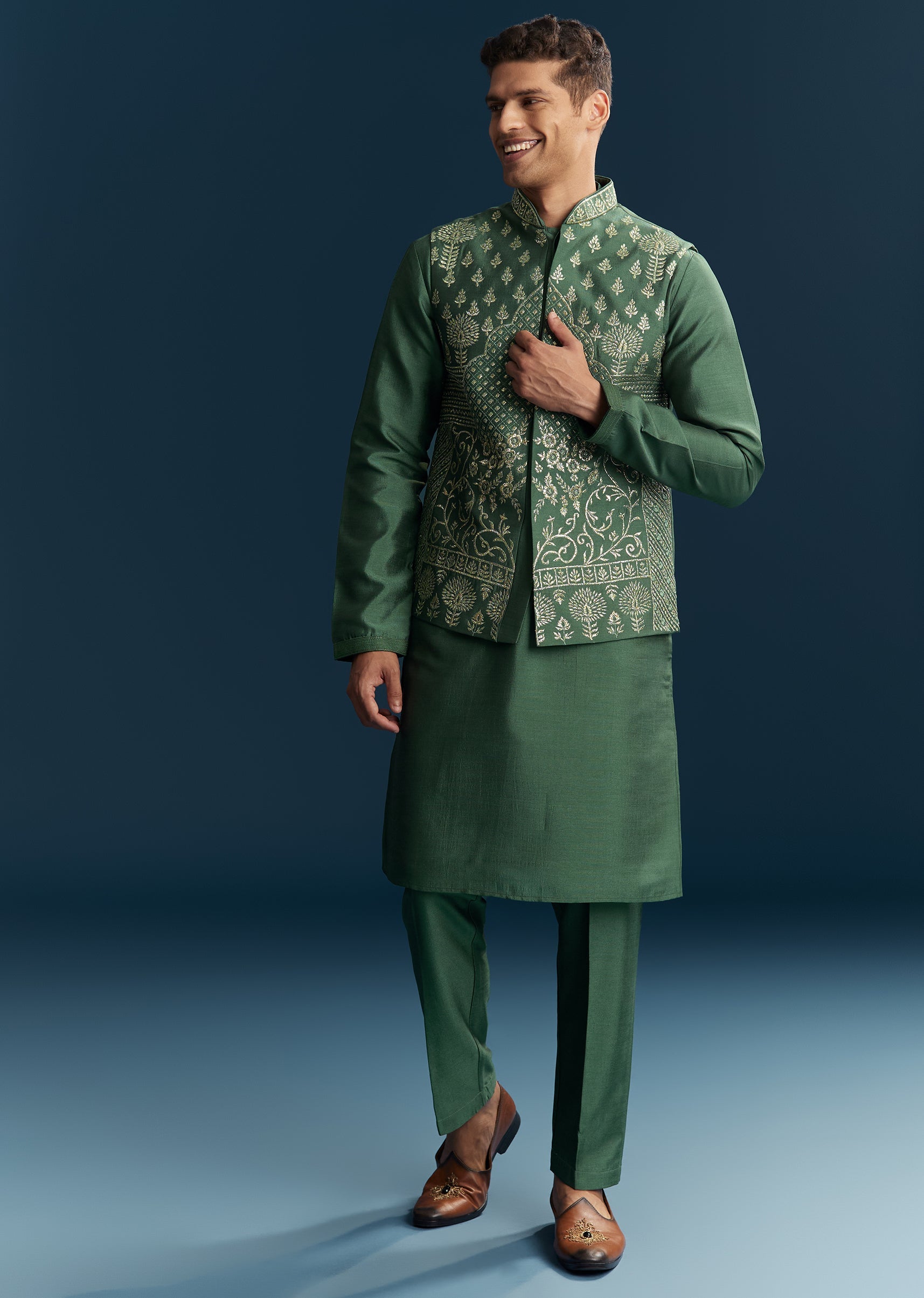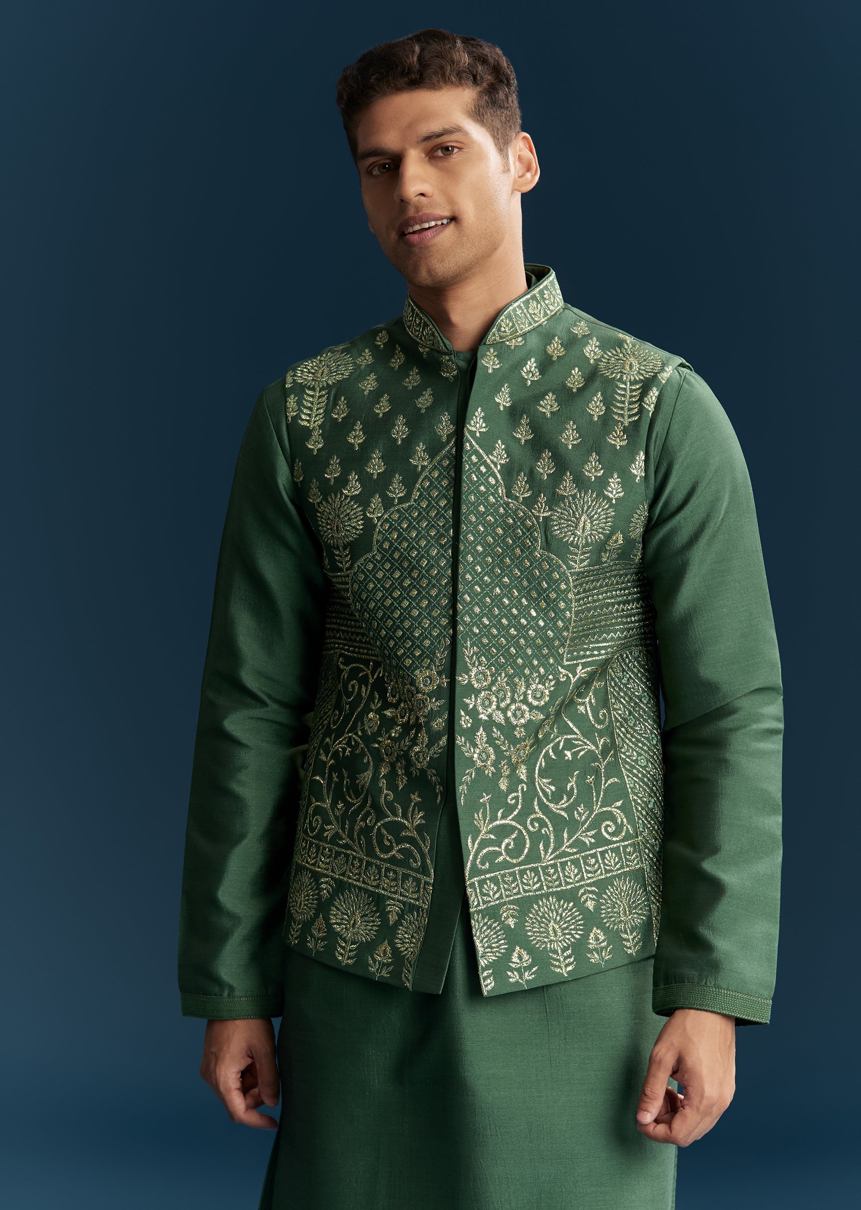 Green Silk Kurta Jacket Set With Thread Detail Work