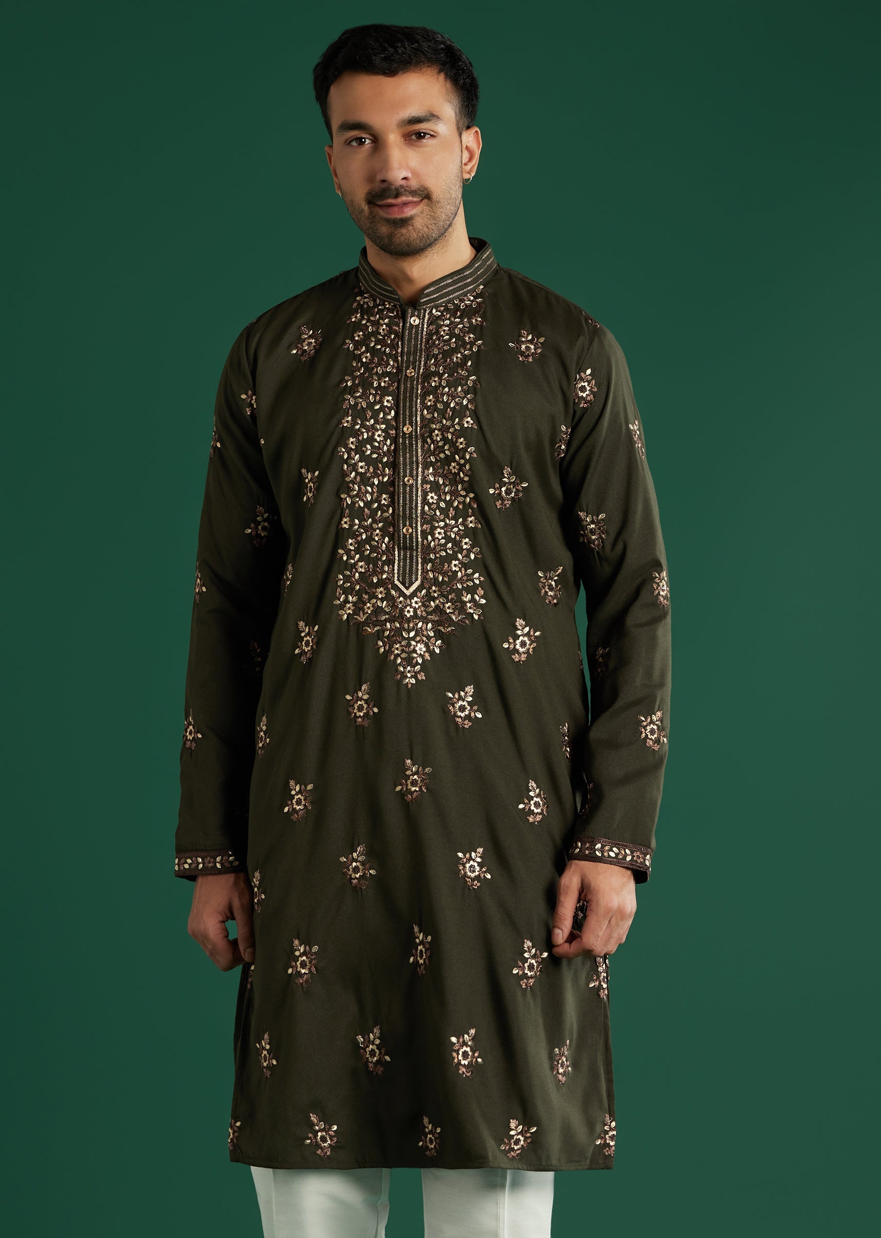 Grounded elegance comes through as this green art silk men’s kurta set works gold and brown resham across the chest, neckline, and sleeves in floral-meets-geometric motifs. The deeper tone pairs neatly with white trousers after dark. Put it front row for festive functions when you want classic craft with presence. Awarded as the Most Trusted Brand, we're delivering styles you love, just as promised.