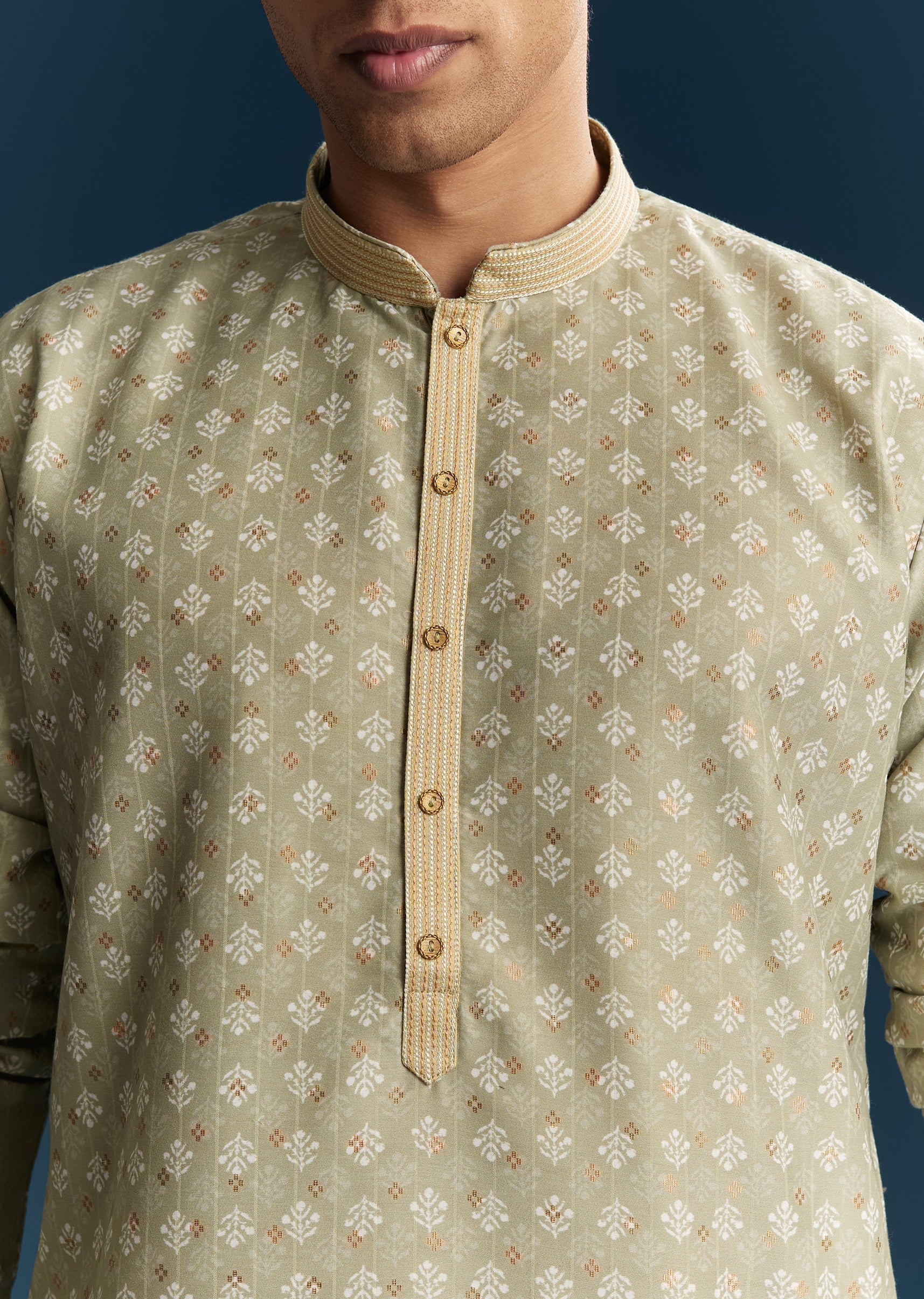 Fresh and understated, this green men’s kurta set in soft pastels is perfect for casual festive occasions. Crafted in smooth silk fabric, it features minimal thread detailing that adds subtle... More Product Details