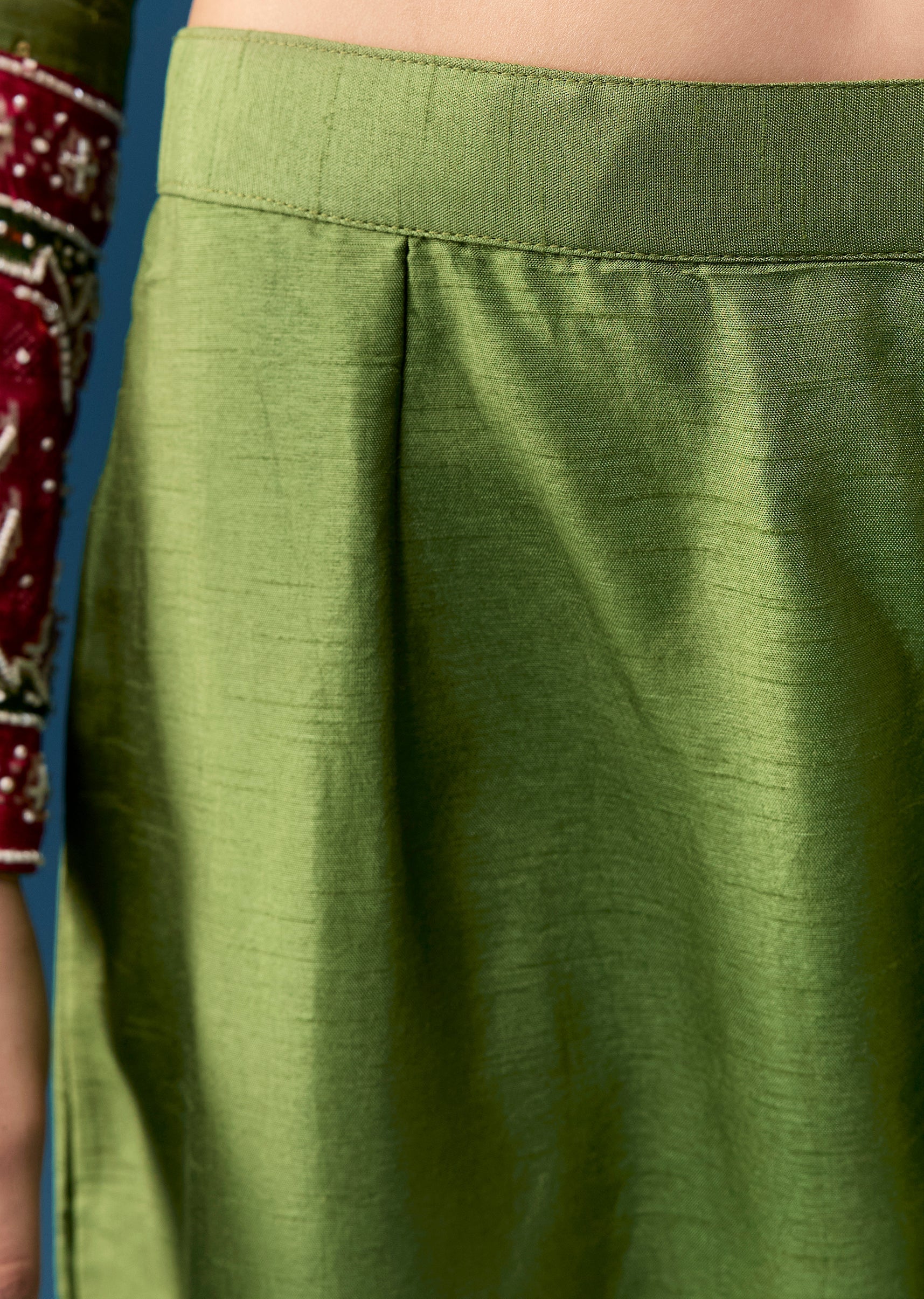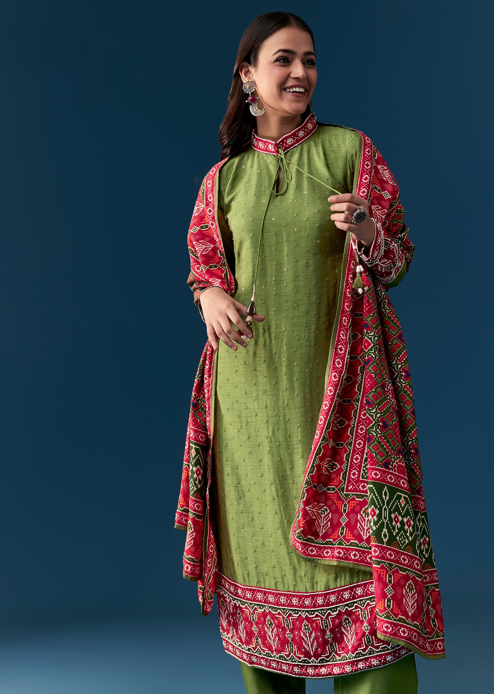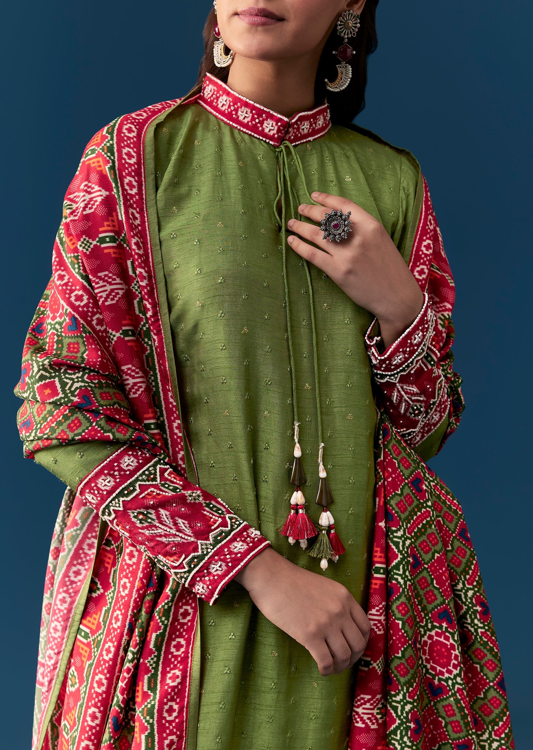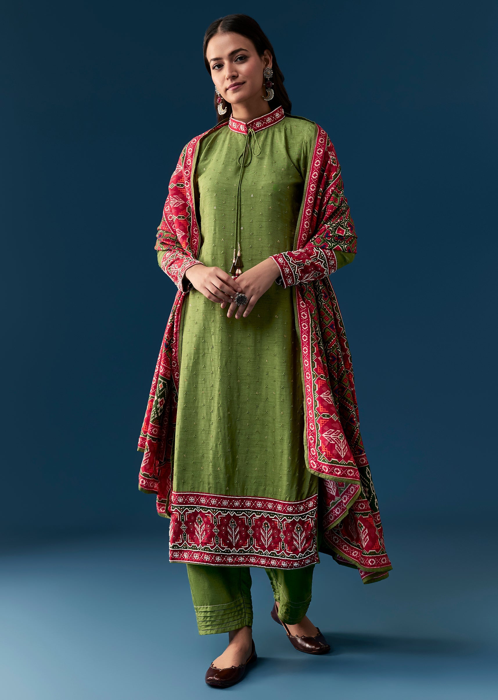 A serene blend of comfort and elegance this green silk kurta set is designed in a straight casual silhouette adorned with delicate resham butti and cut dana work. The full sleeves and mandarin collar offer a refined finish making it perfect for intimate festive moments casual gatherings or daytime celebrations. The set is elevated with a striking patola print dupatta that adds a vibrant traditional touch. A drawstring closure on the kurta and a side zip on the bottoms ensure ease functionality and comfort throughout the day. Awarded as the Most Trusted Brand, we're delivering styles you love, just as promised.