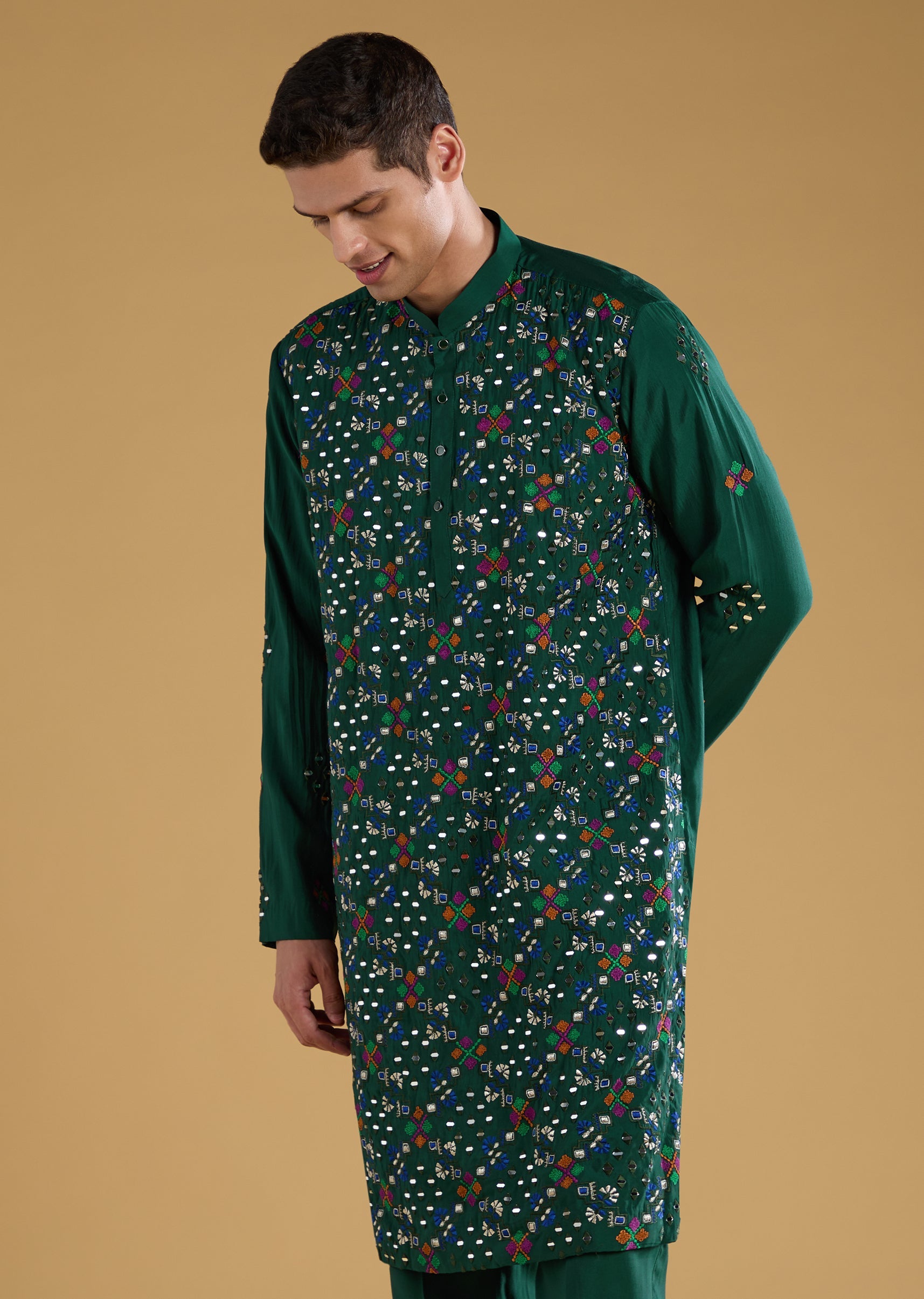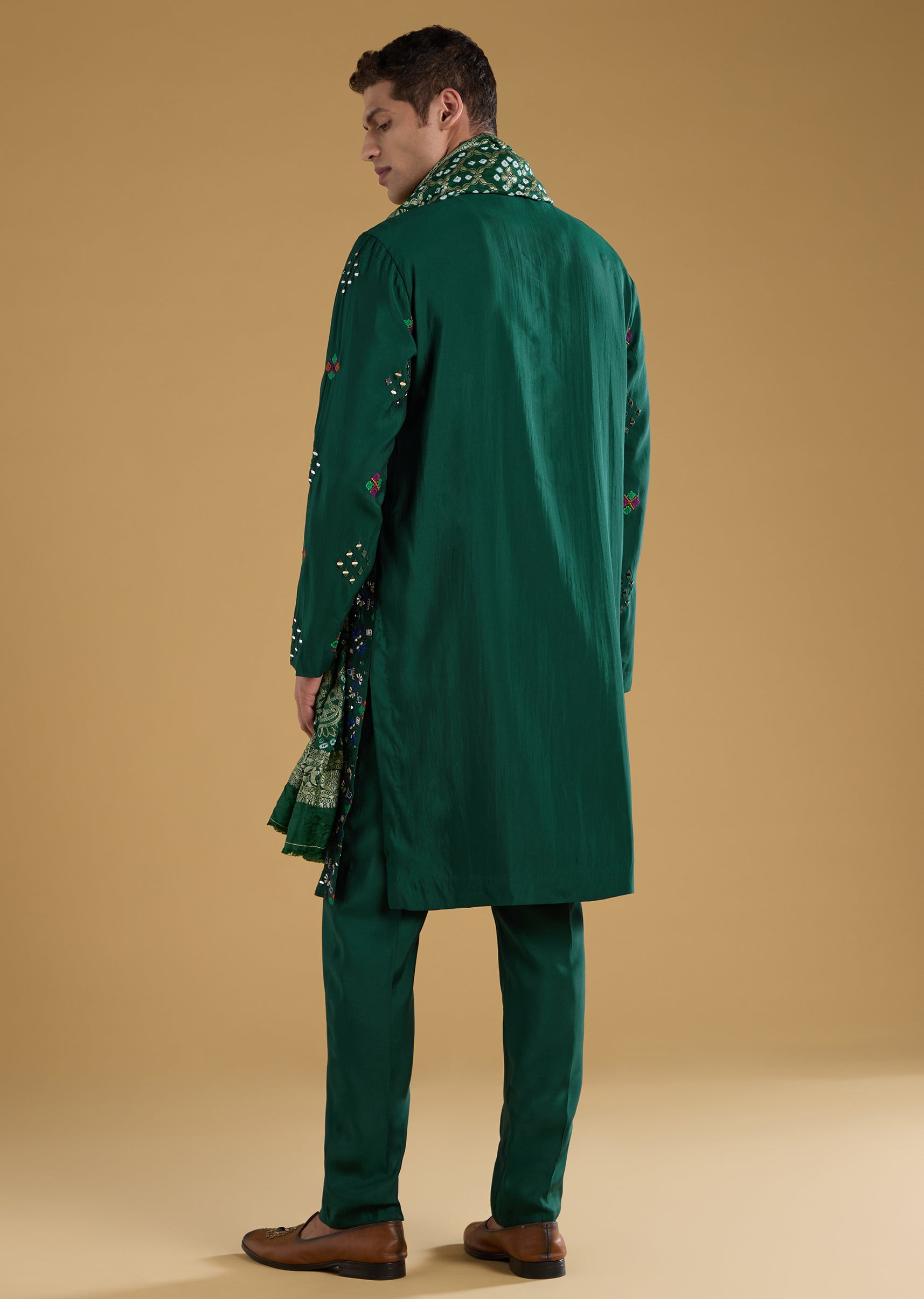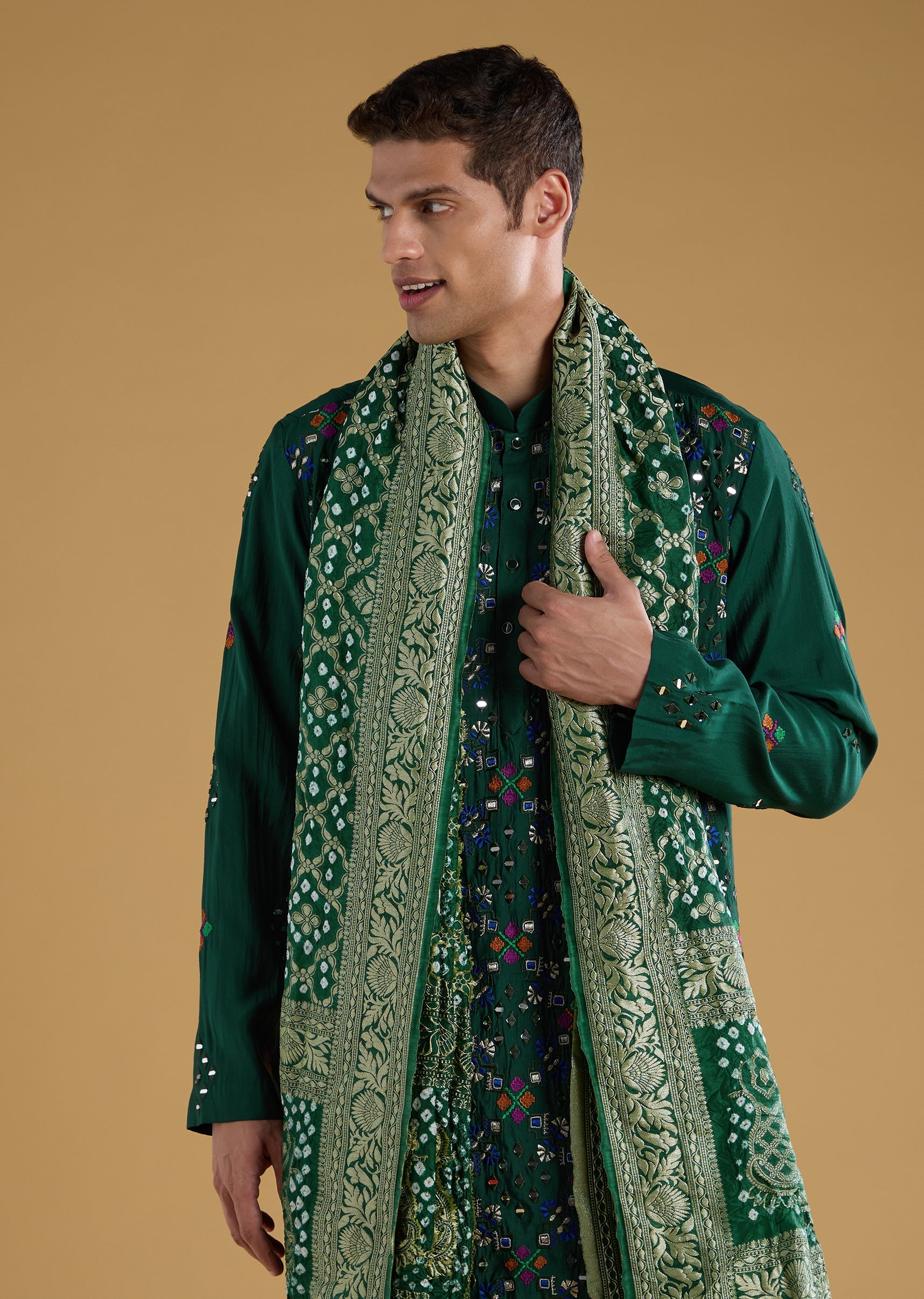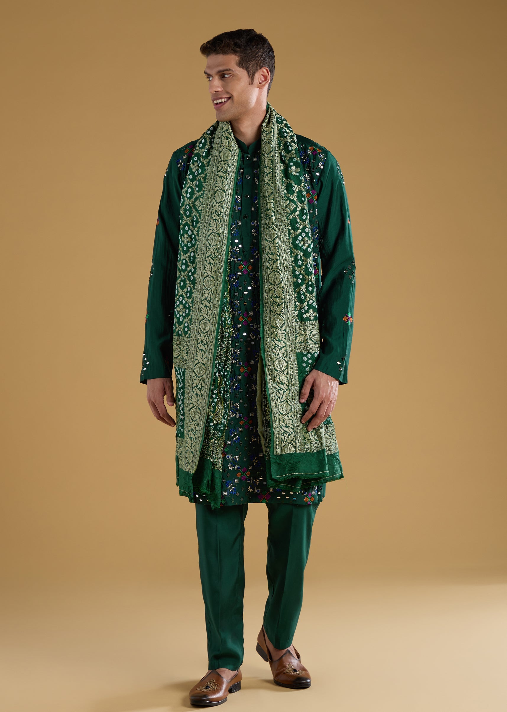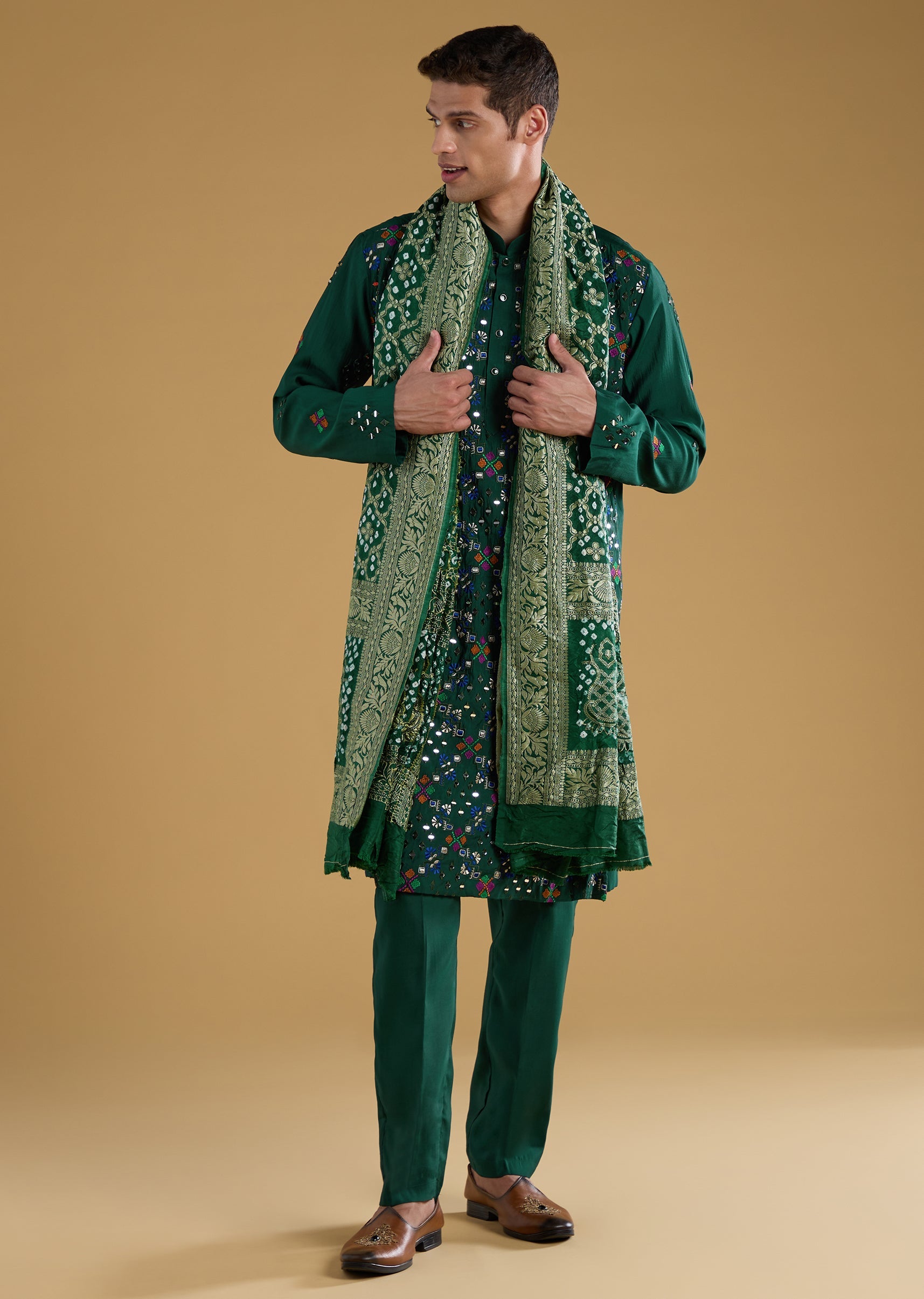 Green Silk Thread Work Men's Kurta Set with Dupatta