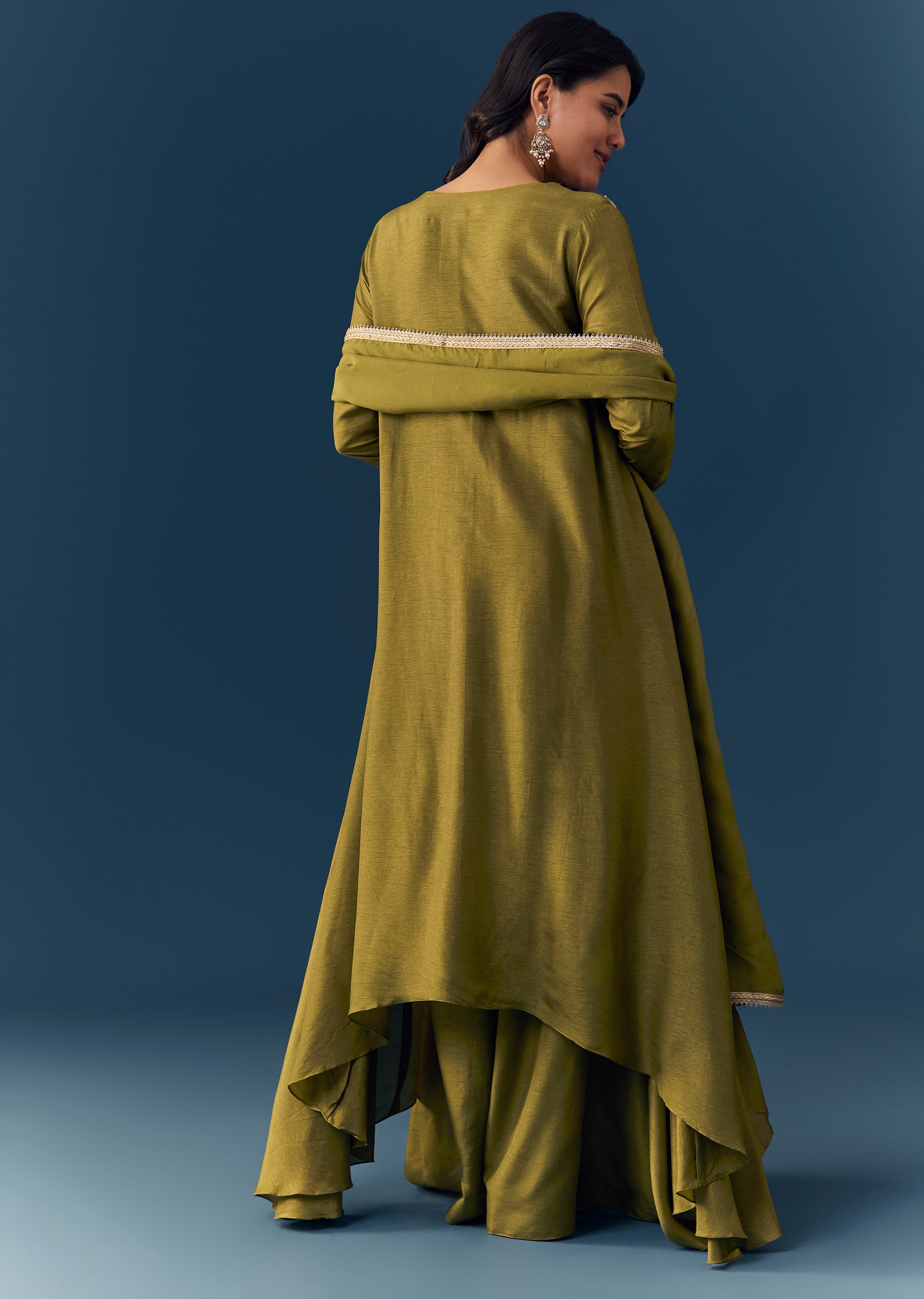 Make a graceful festive statement in this green silk kurta, adorned with rich zardosi and resham embroidery that adds depth, texture, and regal shine. The full sleeves and notched neckline... More Product Details