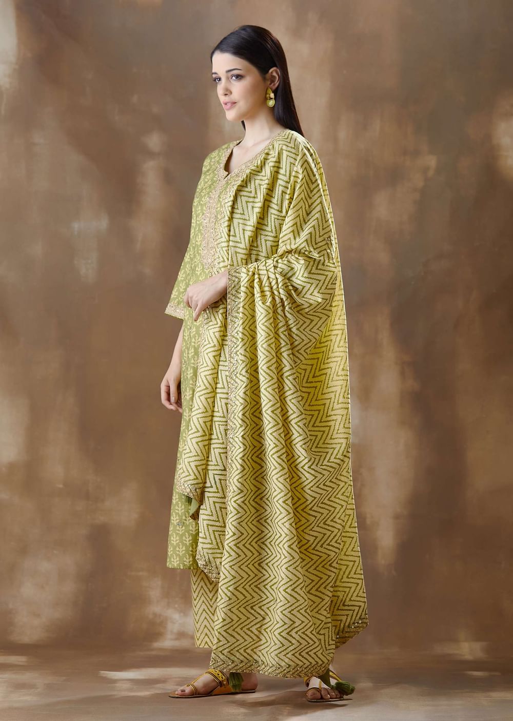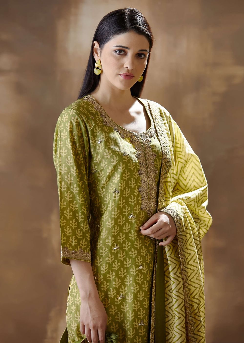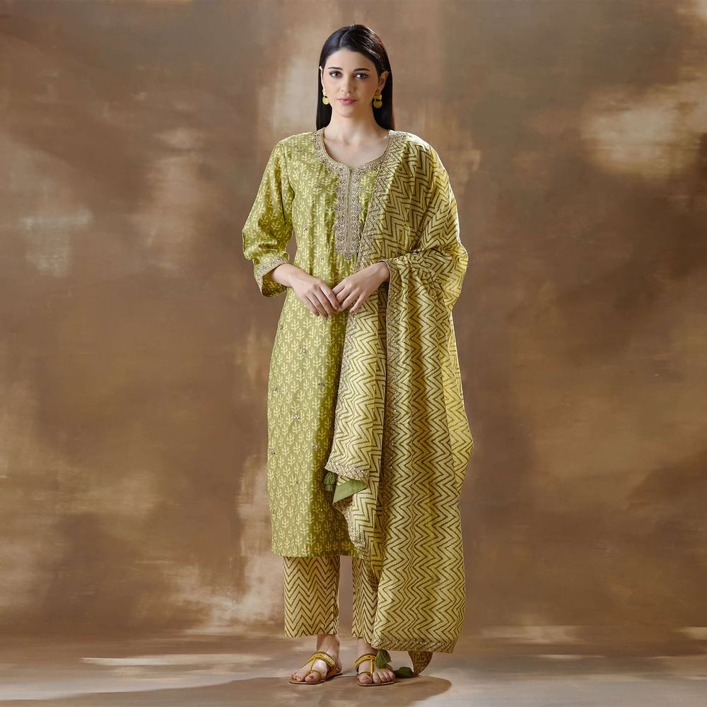 Green Daboo Print festive straight cut suit in silk with printed round neck embroidery along the neckline. It is paired with printed straight cut pant and a graceful dupatta with... More Product Details