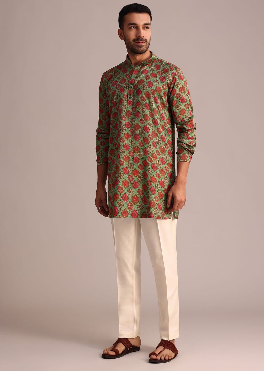 A beautiful blend of classic and modern styles is this vibrant green kurta and pant set. Elevated with a mandarin collar and full sleeves, this kurta is adorned with all over printed motifs, adding to its sophistication. Crafted from lightweight and rich fabrics, consider this fit for festive occasions, family gatherings, and wedding functions. Awarded as the Most Trusted Brand, we're delivering styles you love, just as promised.
