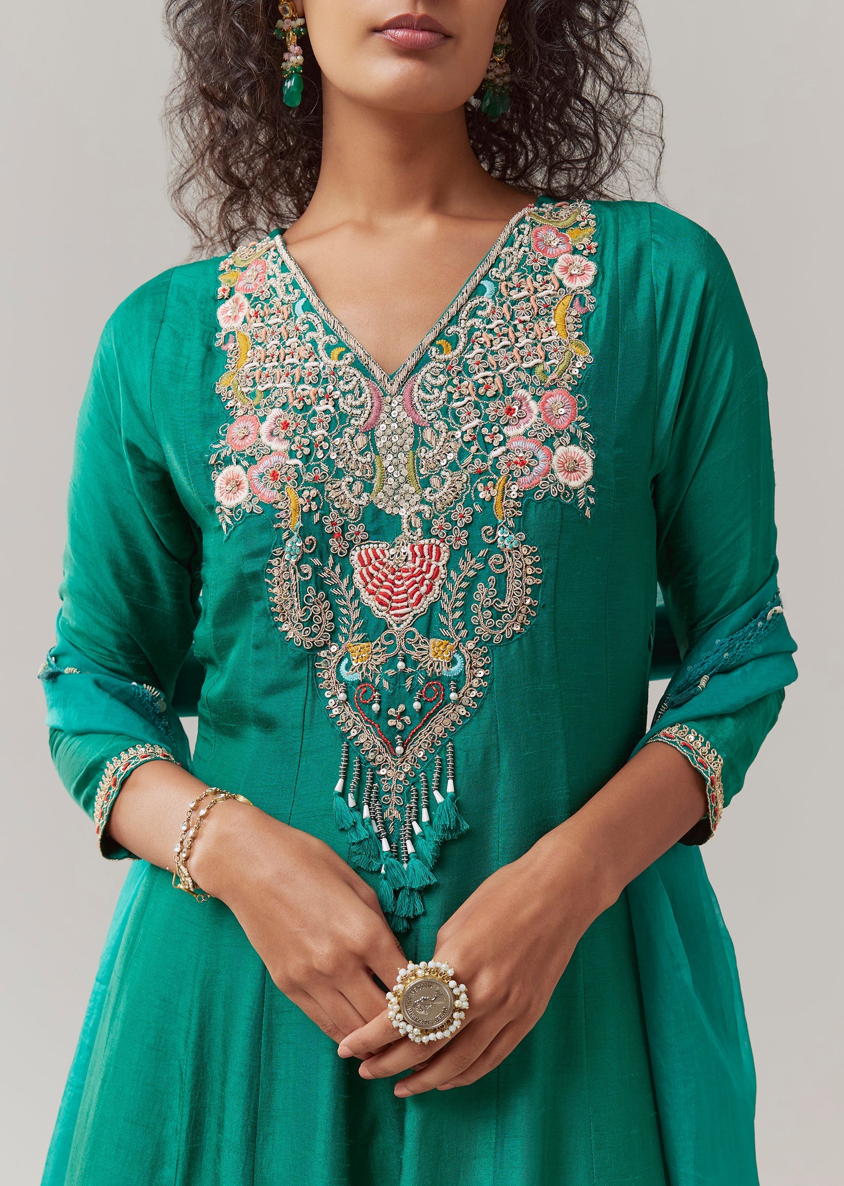 Gracefully refined with a touch of heritage, this silk anarkali showcases intricate zari and cut dana work that adds depth and subtle shimmer. The round neckline and full sleeves lend... More Product Details