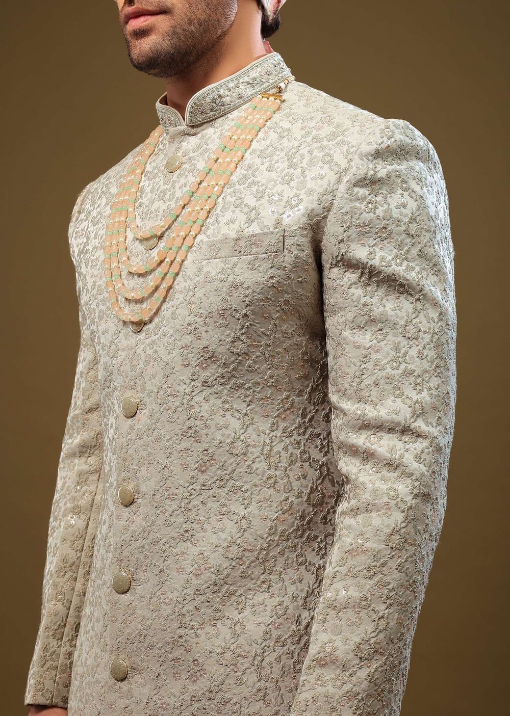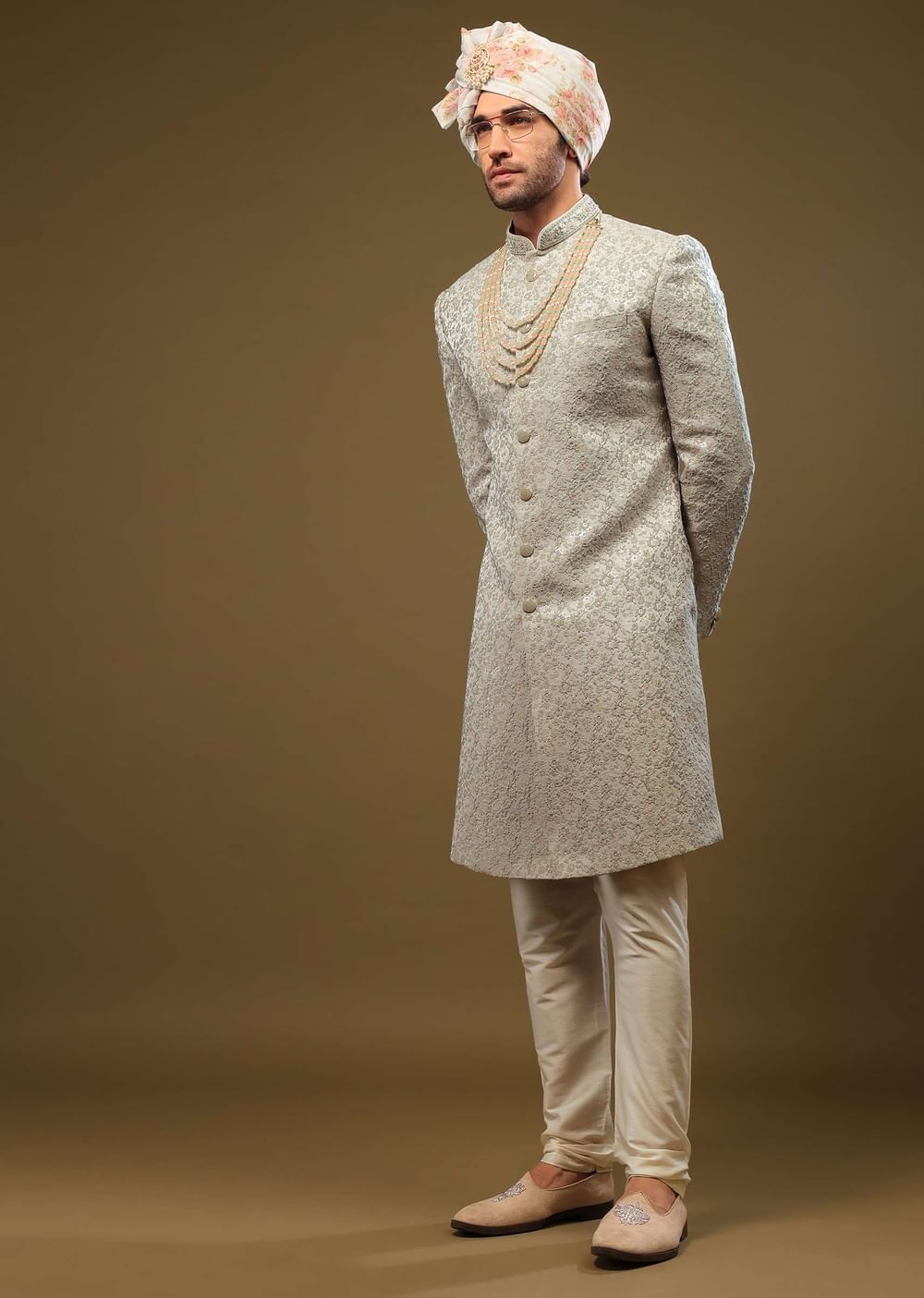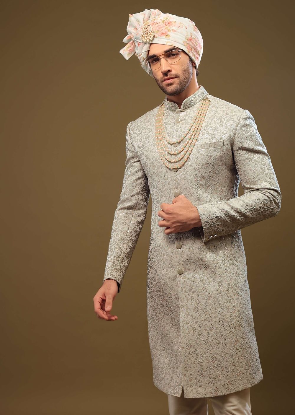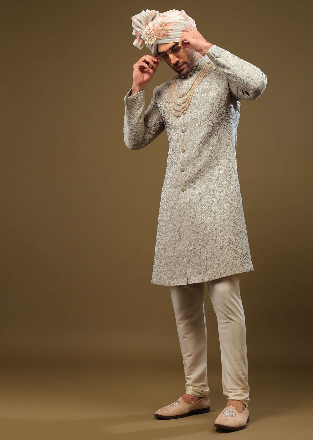 Powder Green Thread Embroidered Sherwani Set In Emboss Fabric