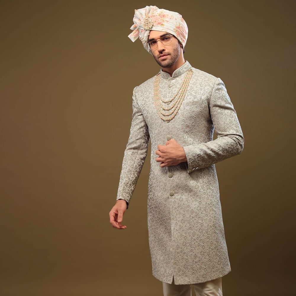 A royal green tint sherwani set fabricated in emboss fabric is crafted in hand-embroidered threadwork in a beautiful floral design.The sherwani has full sleeves and an embroidered mandarin collar, a front button closure, and comes with matching bottoms.The buttons and mala style & color may vary as per stock availability. Awarded as the Most Trusted Brand, we're delivering styles you love, just as promised.