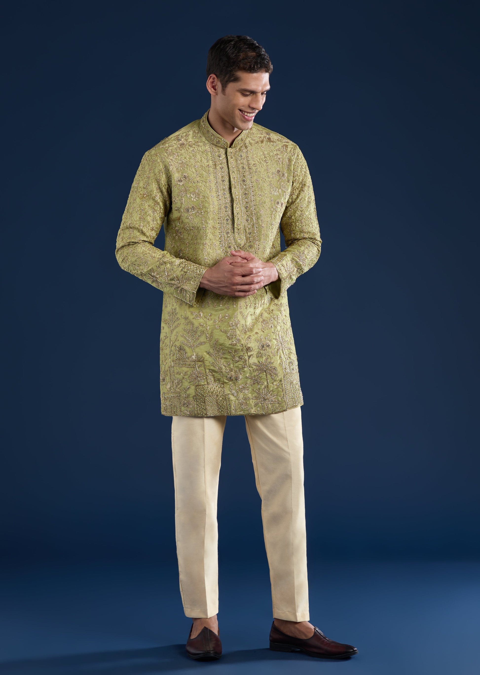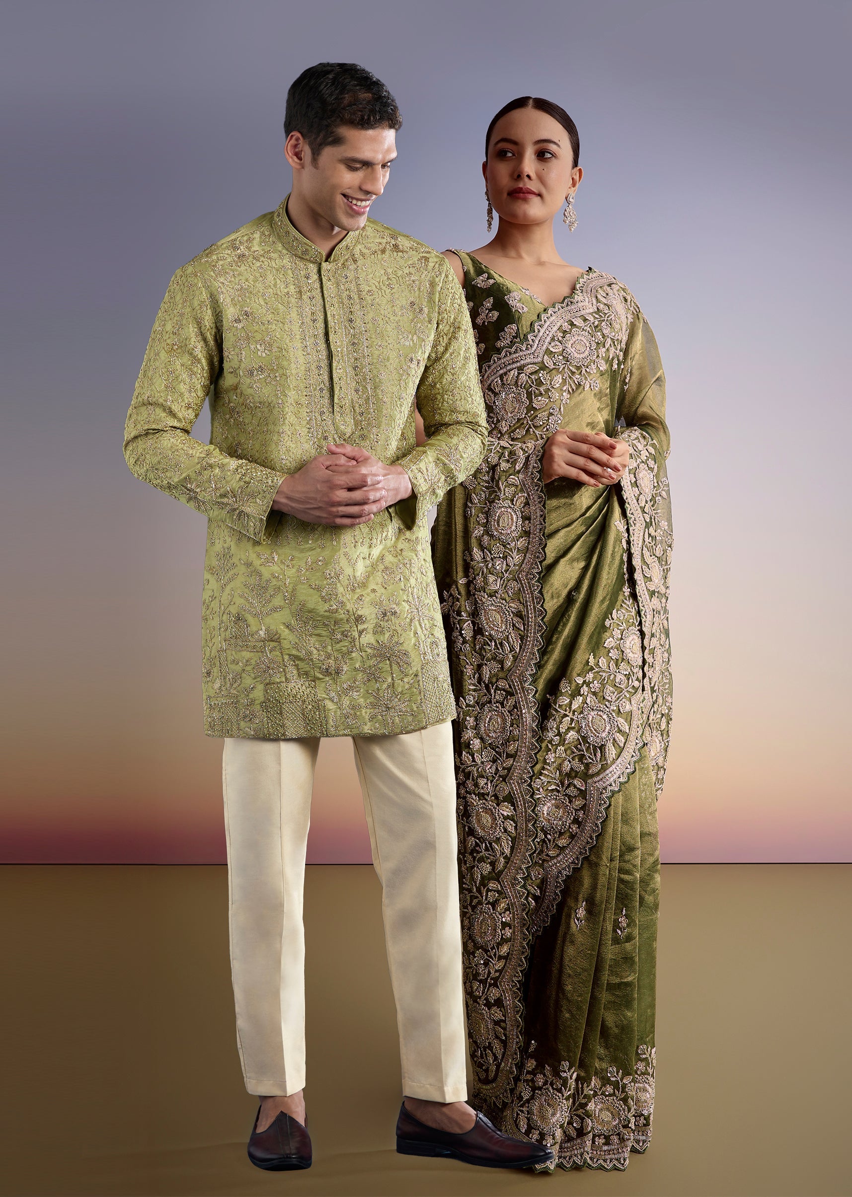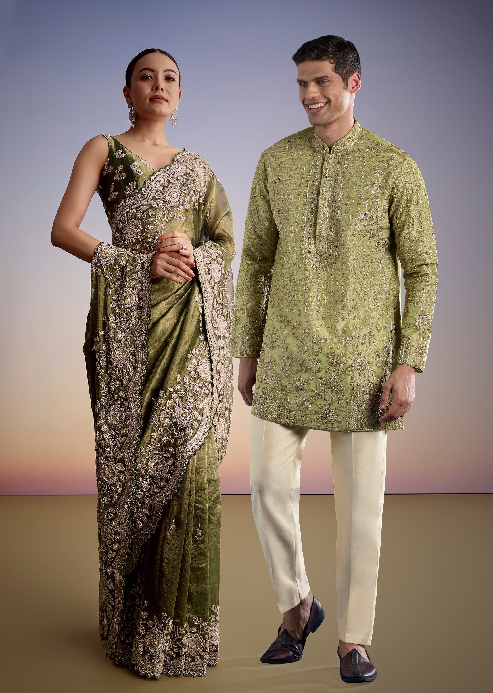 Float into festivities with this olive green tissue saree, meticulously crafted with a scallop embroidered border that brings luxe texture and shimmer to every step. Embellished with zardosi, beads, and sequins, the airy tissue fabric strikes the perfect balance between lightweight grace and rich celebration energy — ideal for sangeet evenings, cocktail receptions, and wedding guest dressing. For Him - This green tissue kurta set brings a refined festive edge to his wardrobe with luminous tissue fabric and subtle zari detailing. Designed with a clean silhouette and traditional mandarin collar, it’s perfect for haldi, mehendi, engagement events, and wedding celebrations where he wants to look polished yet effortlessly comfortable throughout the day.