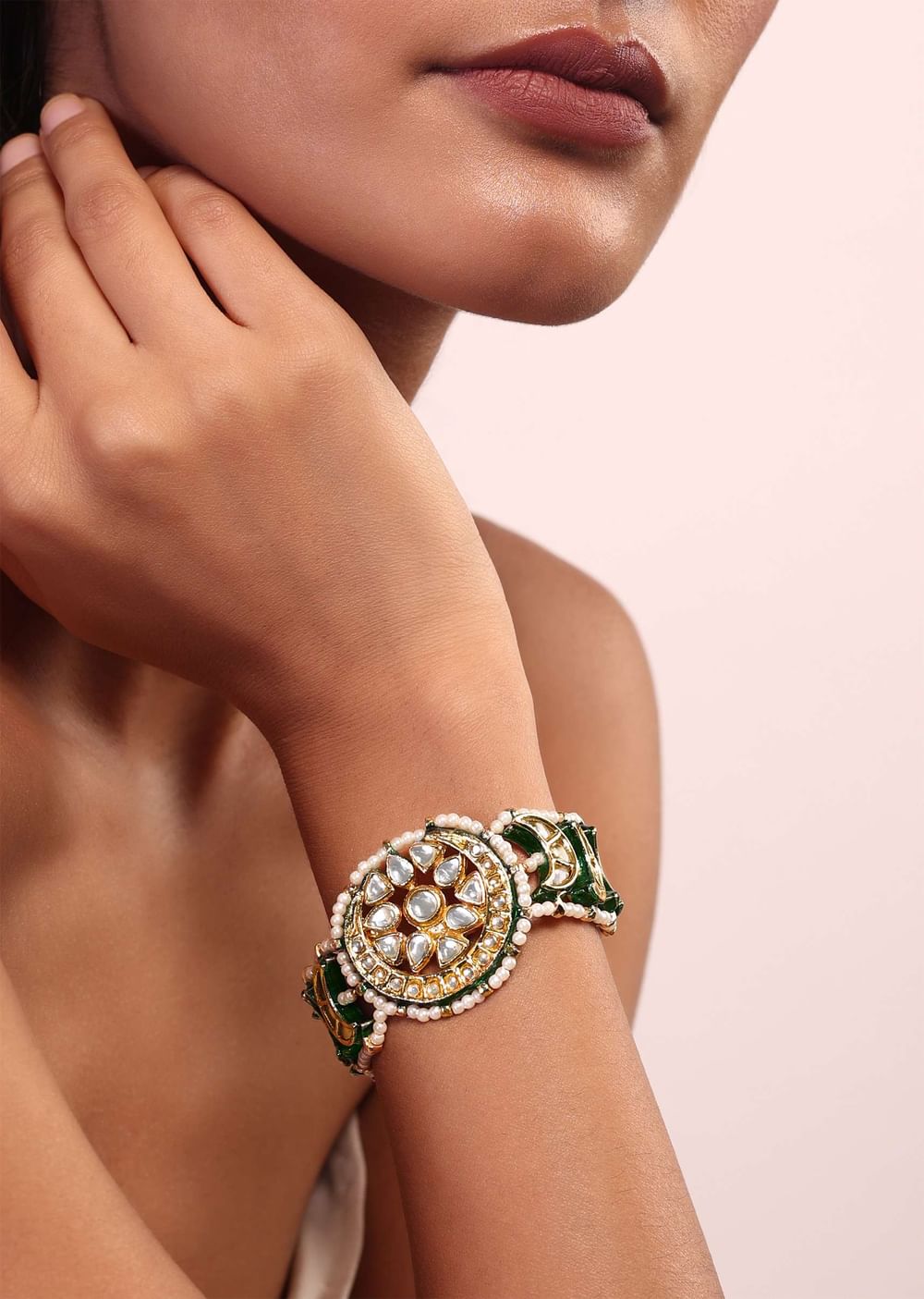 An exclusive gold and green enamel bracelet with kundan stones. The semi-precious kundan stones and pearls in this bracelet are paired beautifully that will surely adorn your wrist. The bracelet is handcrafted using the best quality material. This jewellery piece is polished and anti-tarnish. It comes with an adjustable closure at the back. Avoid contact with water, chemicals, harsh liquids, perfumes, etc. Do not wear this piece of jewelry while showering, gymming, swimming, etc. Hard contact must be avoided completely. Please keep the product away from moisture and humidity when not in use. Baroque pearls and Natural stones can range from minor aberrations to distinctly ovoid, curved, pinched, or lumpy shapes. Awarded As The Most Trusted Brand We'Re Delivering Styles You Love Just As Promised.