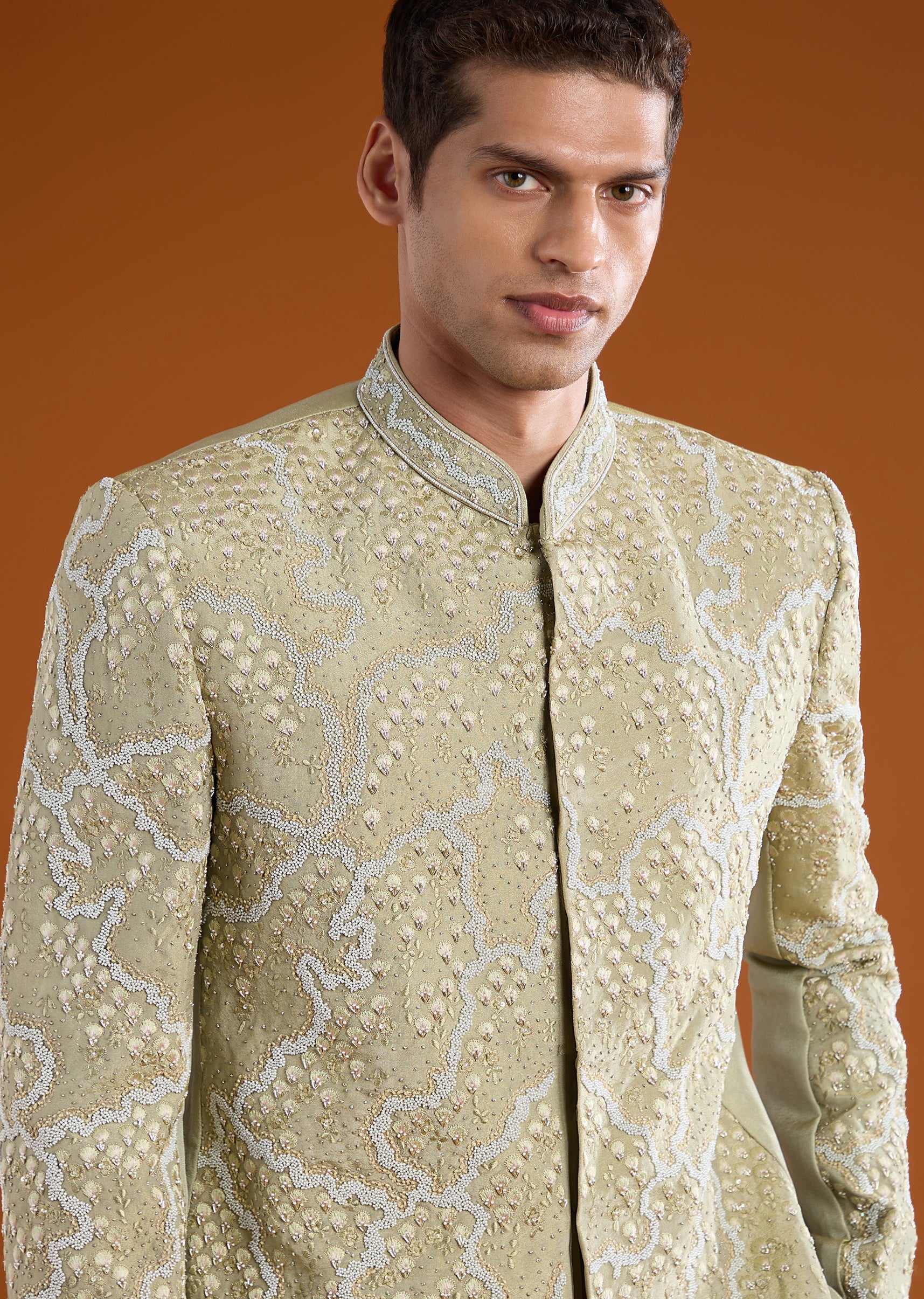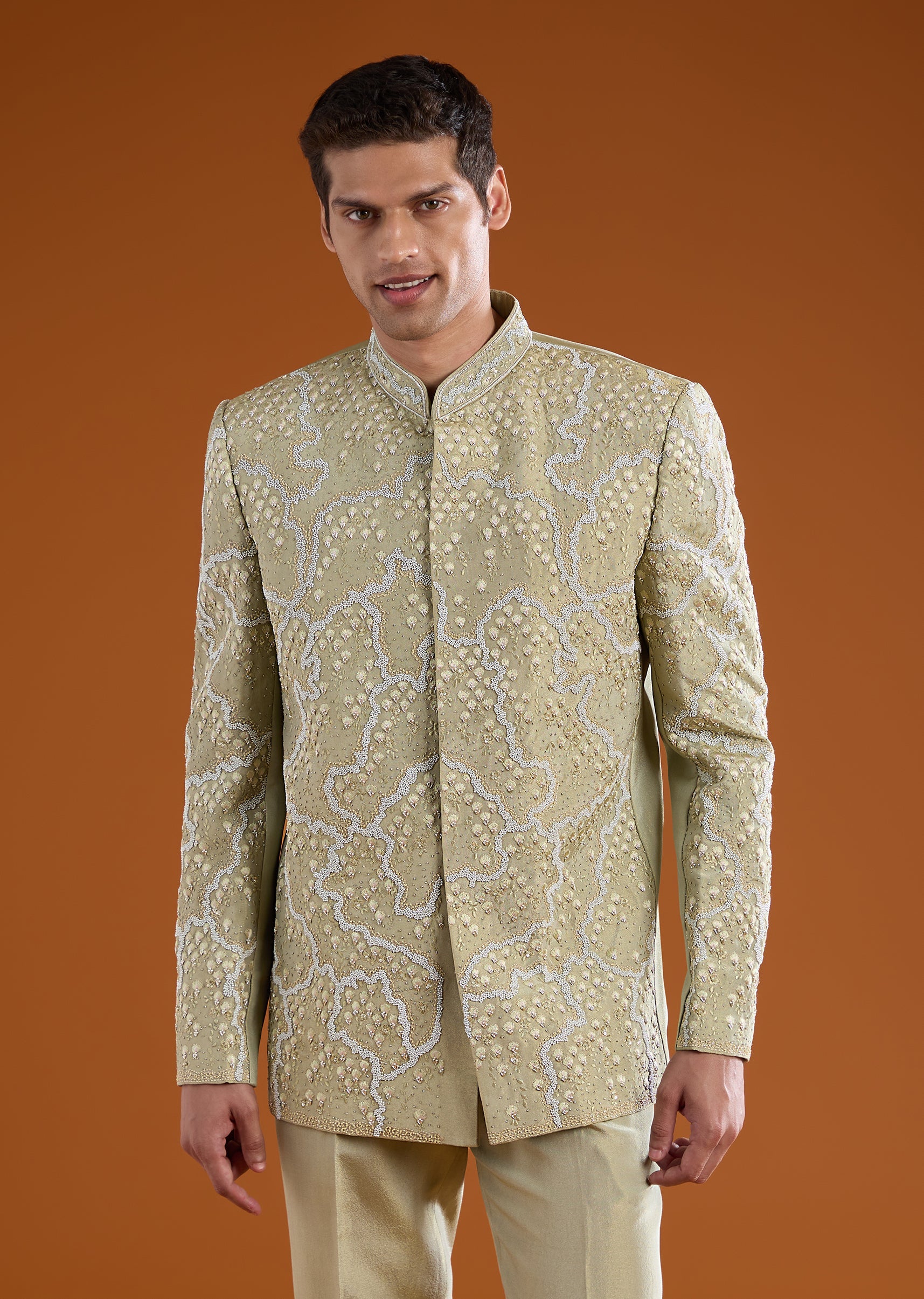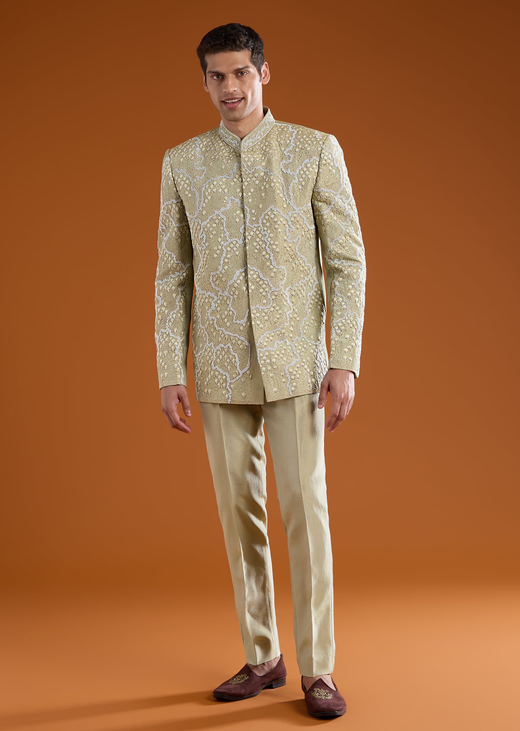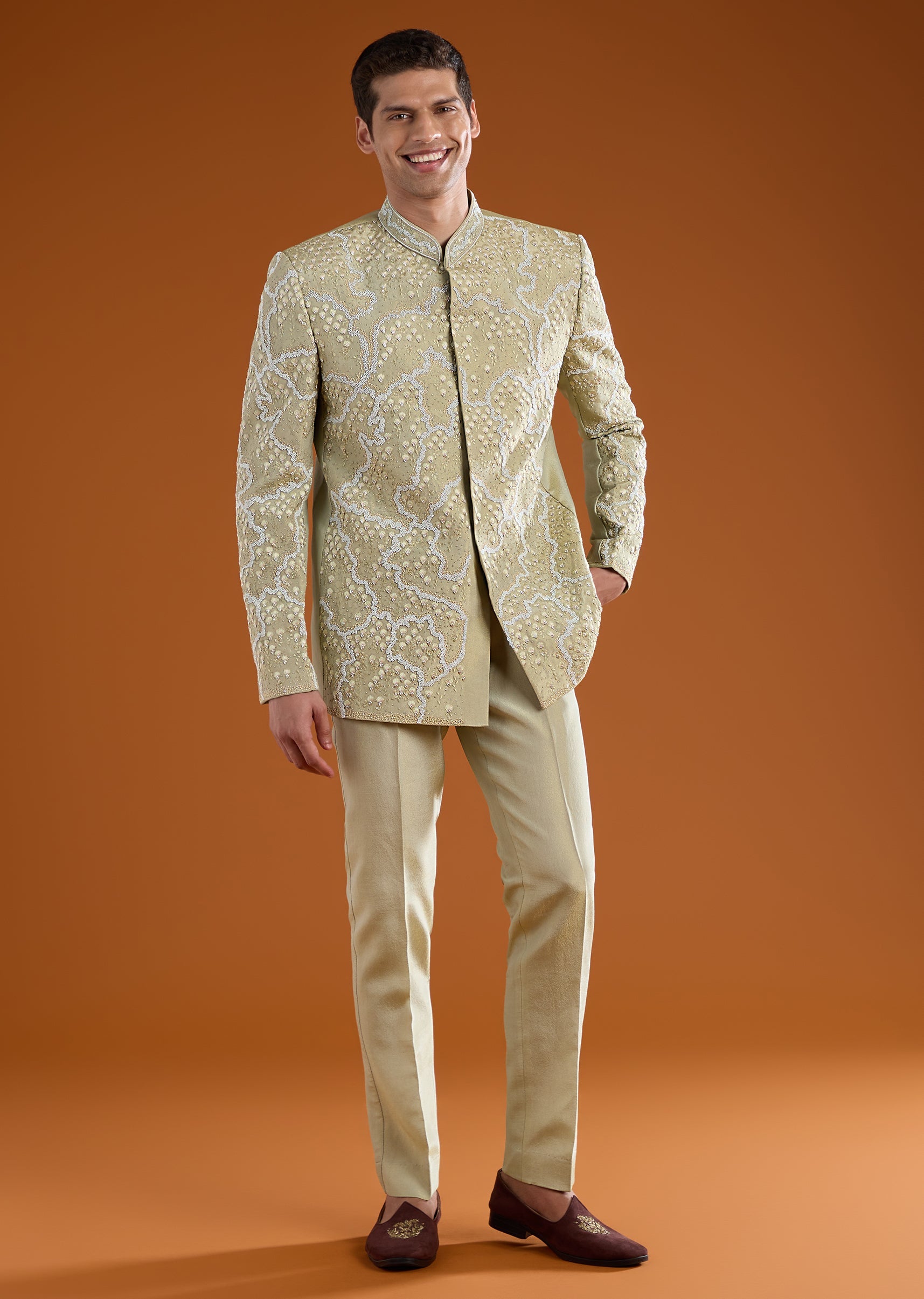 Distinctive and refined, this tussar jodhpuri pants set is crafted for elevated traditional dressing. The natural texture of tussar is enriched with intricate thread and resham embroidery, highlighted by moti, sequin, and cut dana work for a subtle festive sheen. Full sleeves and a mandarin collar lend a commanding, structured silhouette rooted in classic jodhpuri style. Ideal for weddings, festive ceremonies, and formal cultural occasions. Awarded as the Most Trusted Brand, we're delivering styles you love, just as promised.