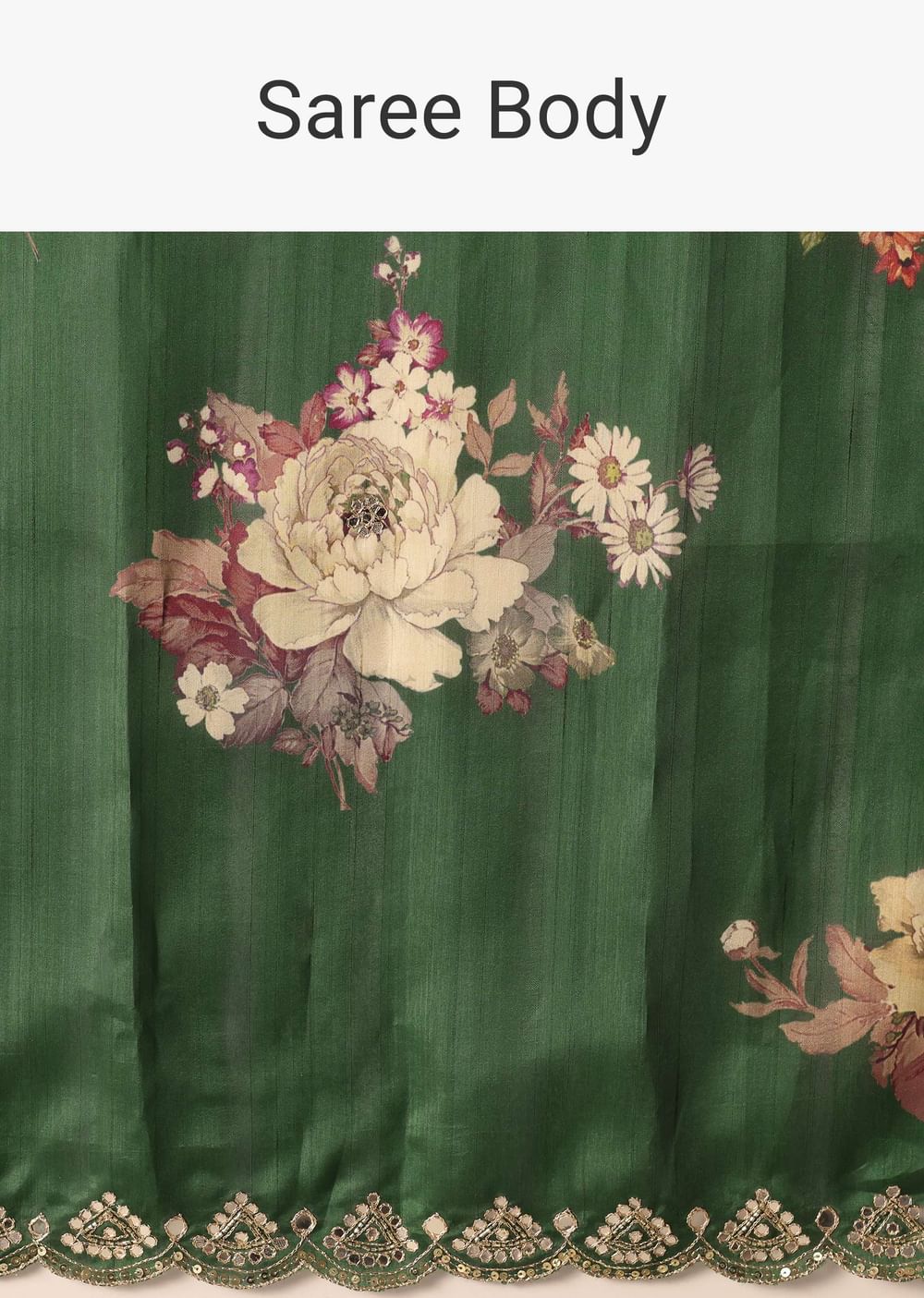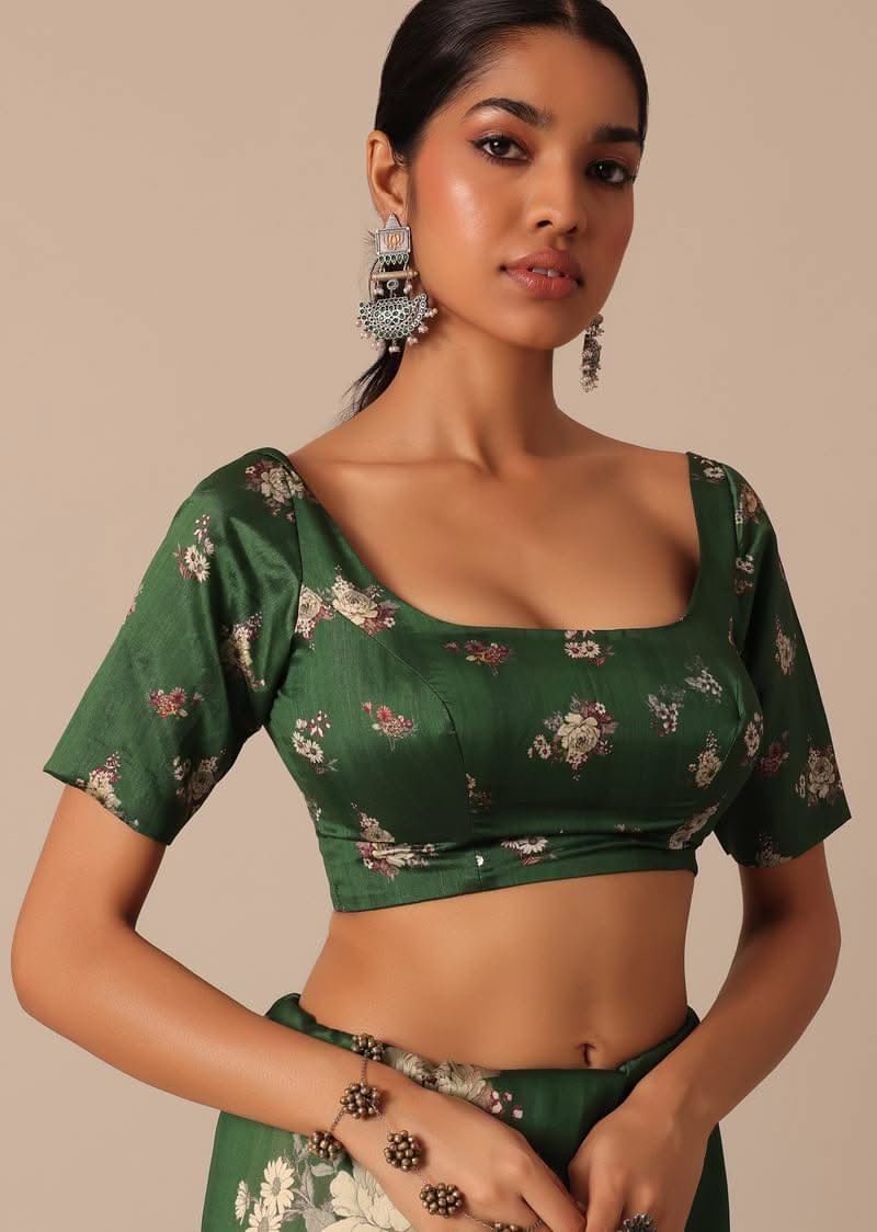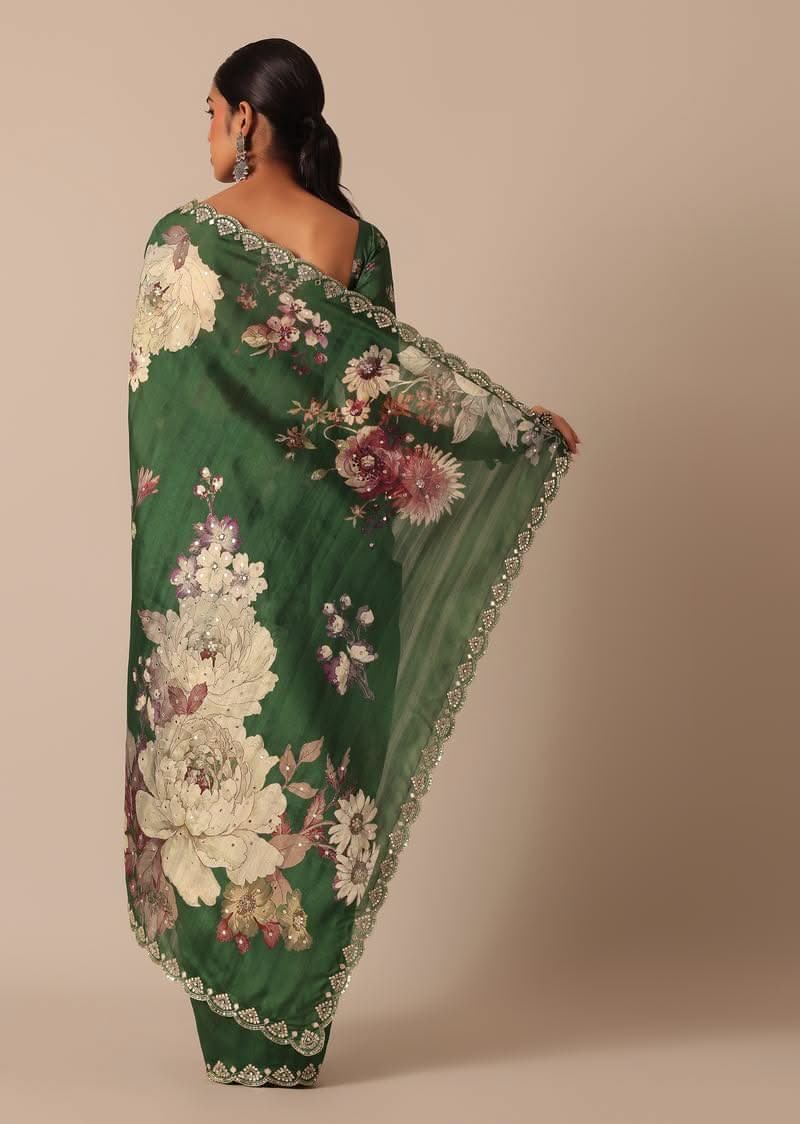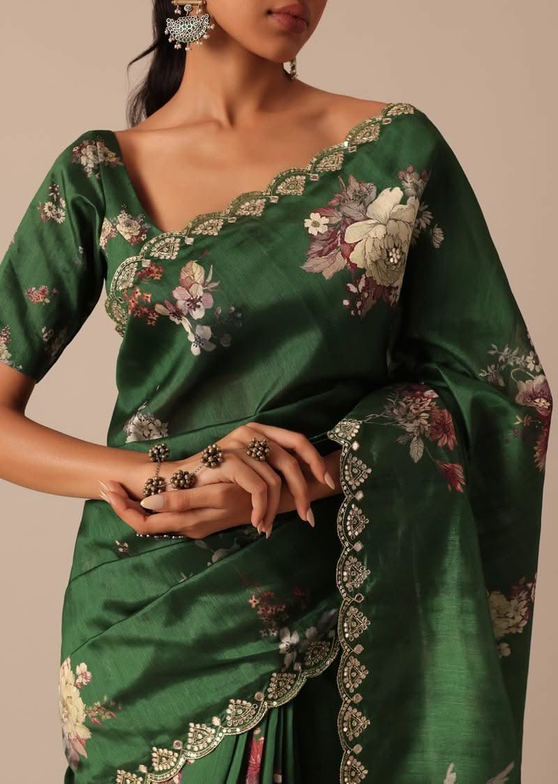 A beautiful blend of gorgeous swirl of colors and captivating prints this glamorous green saree is a festive musthave. Fashioned using highquality tussar silk fabric it features pretty floral motif prints. Showcasing a scallop cutwork border it is further decked with glistening mirror work. Paired with an unstitched blouse piece this drape makes for a stunning addition. Awarded As The Most Trusted Brand We'Re Delivering Styles You Love Just As Promised.