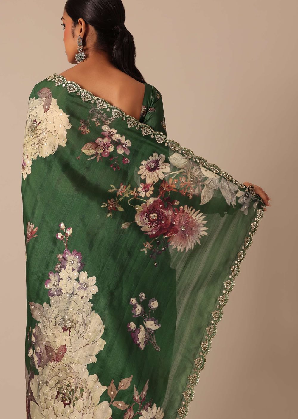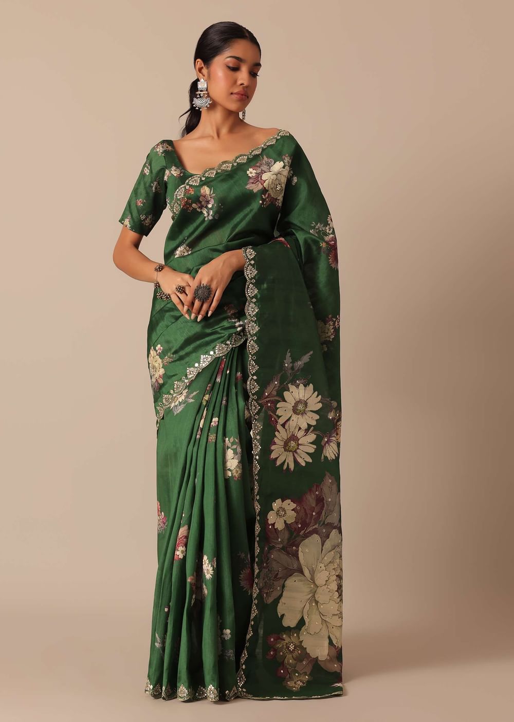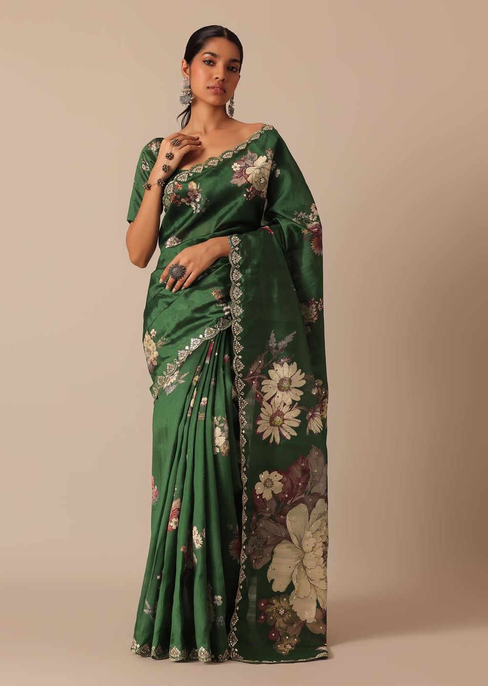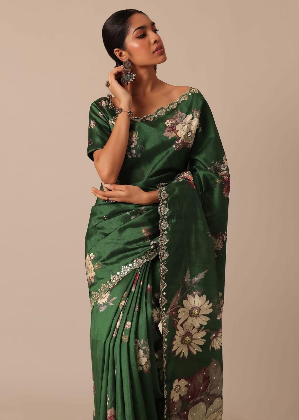 A beautiful blend of gorgeous swirl of colors and captivating prints this glamorous green saree is a festive musthave. Fashioned using highquality tussar silk fabric it features pretty floral motif prints. Showcasing a scallop cutwork border it is further decked with glistening mirror work. Paired with an unstitched blouse piece this drape makes for a stunning addition. Awarded As The Most Trusted Brand We'Re Delivering Styles You Love Just As Promised.