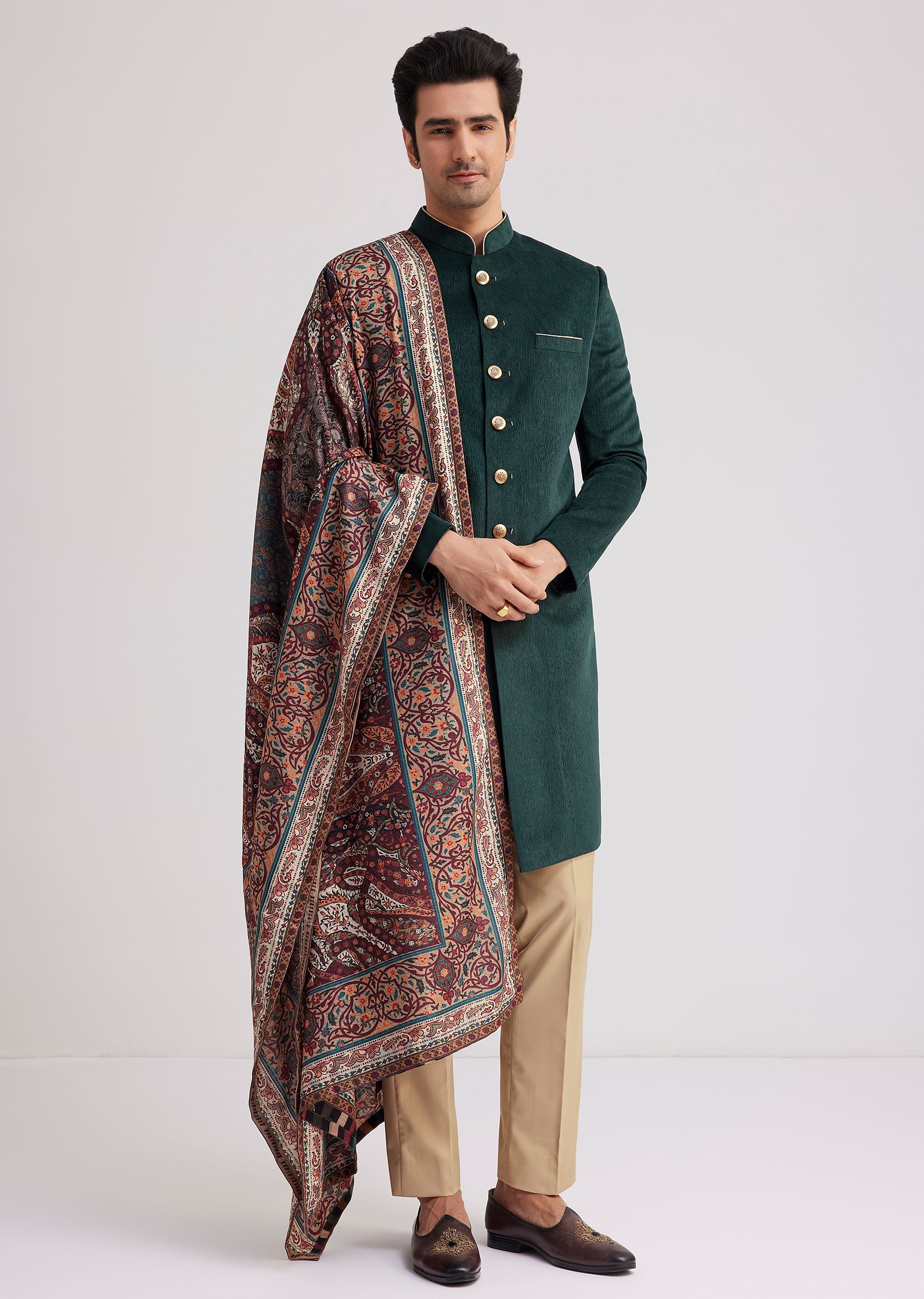 Green Velvet Nawabi Set With Printed Pashmina Dupatta