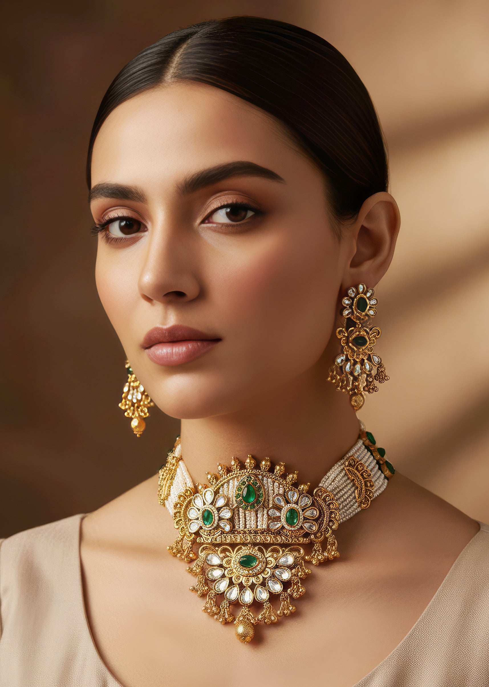 This green and white necklace set features delicate kundan craftsmanship that adds a subtle sparkle and polished charm to your look. The intricately designed necklace paired with matching earrings enhances the neckline while adding an elegant and sophisticated touch to your ensemble. Lightweight and balanced, it pairs beautifully with lehengas, sarees, and indo western outfits, making it a versatile accessory for bridesmaids and mothers who appreciate classic style with refined detailing.