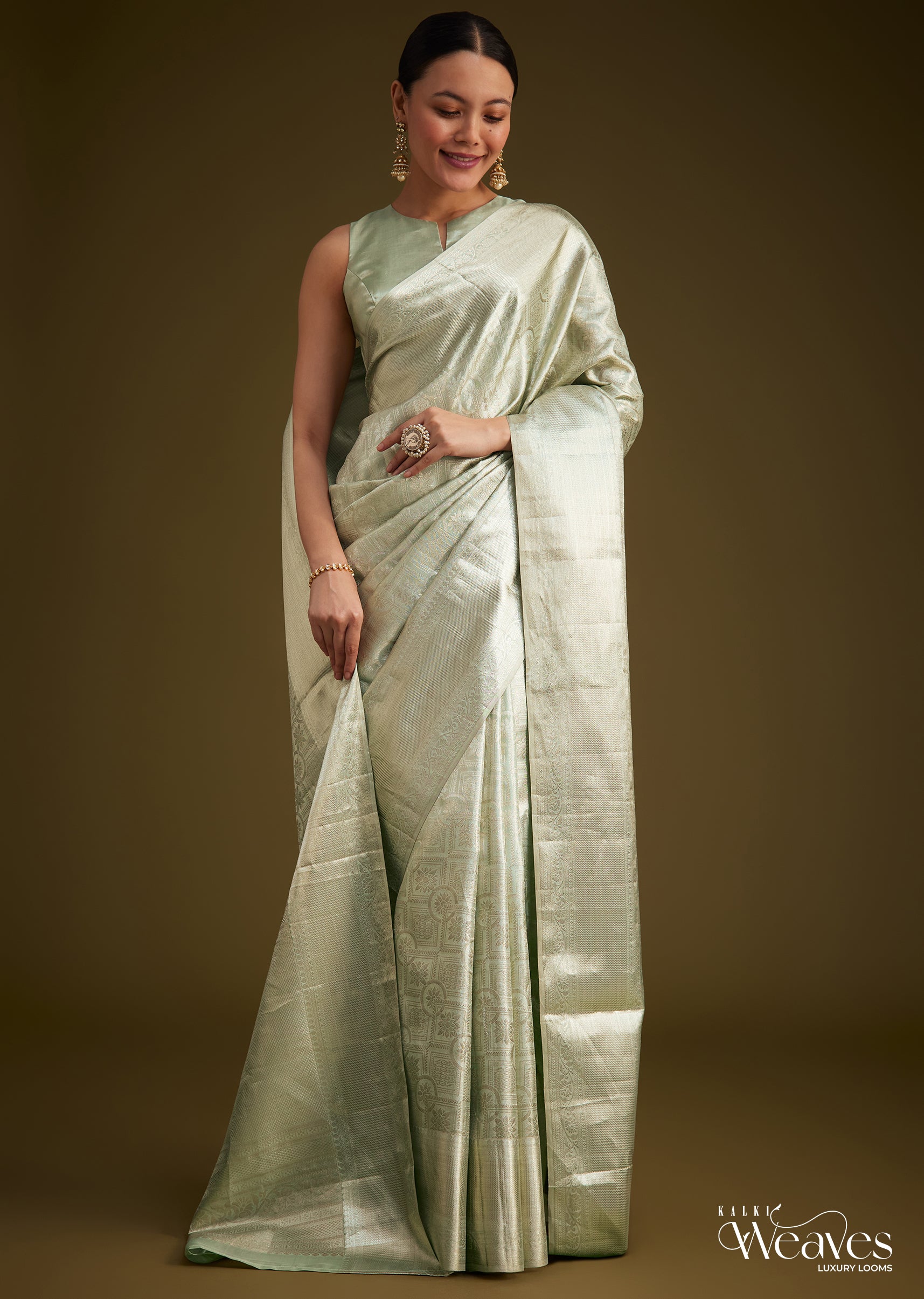 - Elevate Your Wardrobe With This Greenish Silver Kanjivaram Silk Saree A Masterpiece Of Elegance And Tradition.