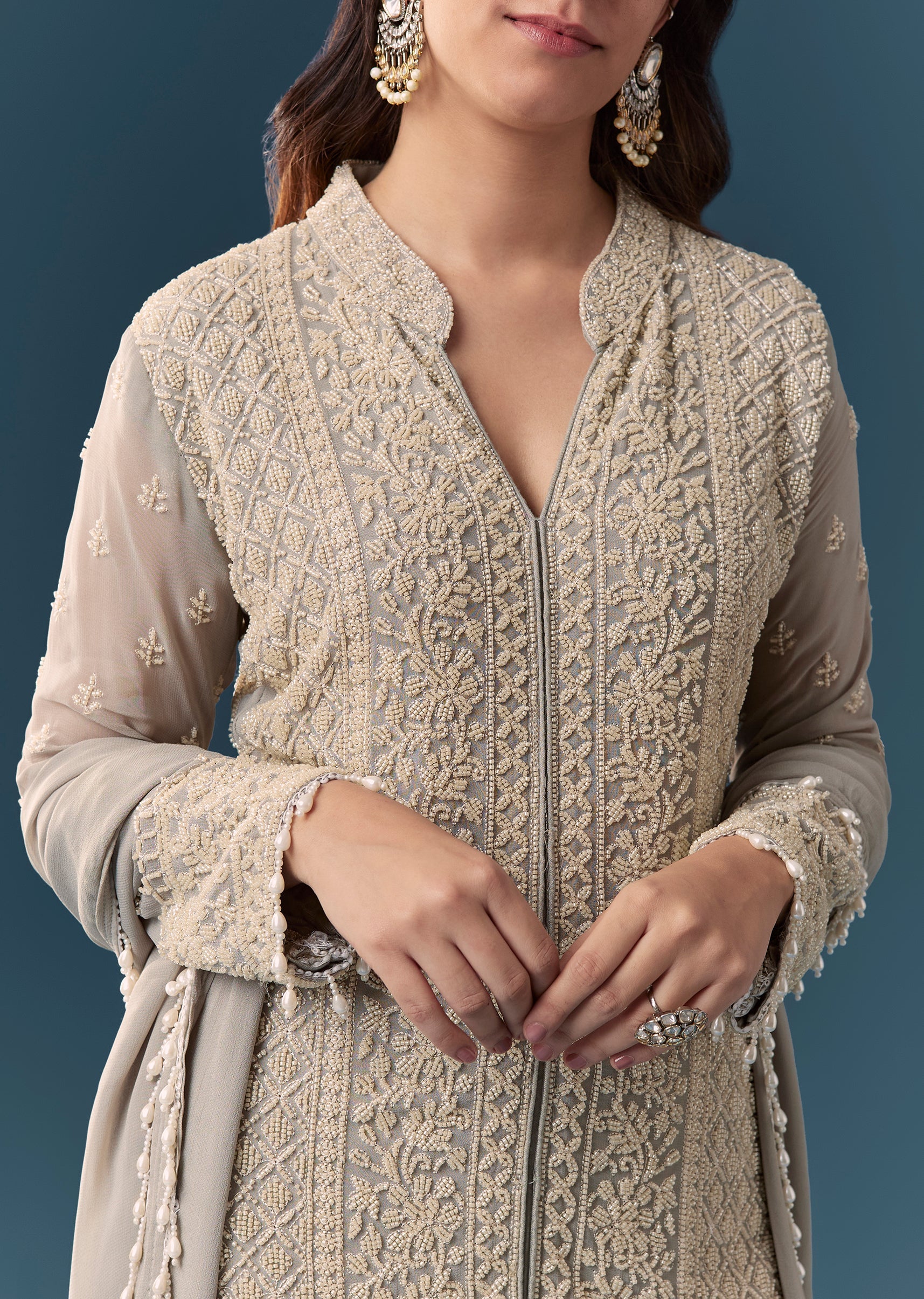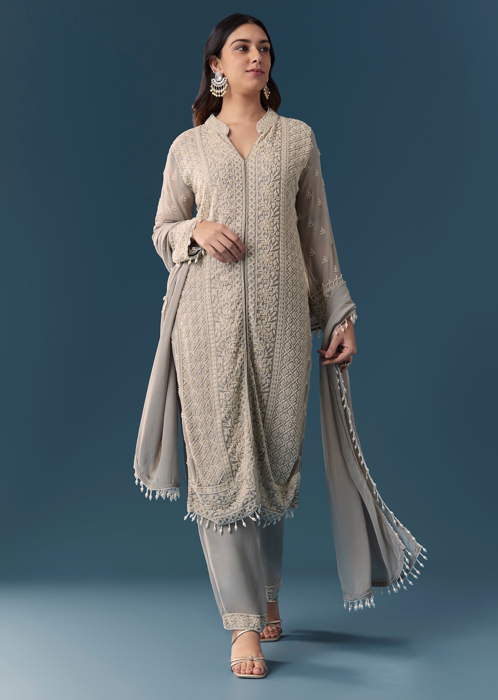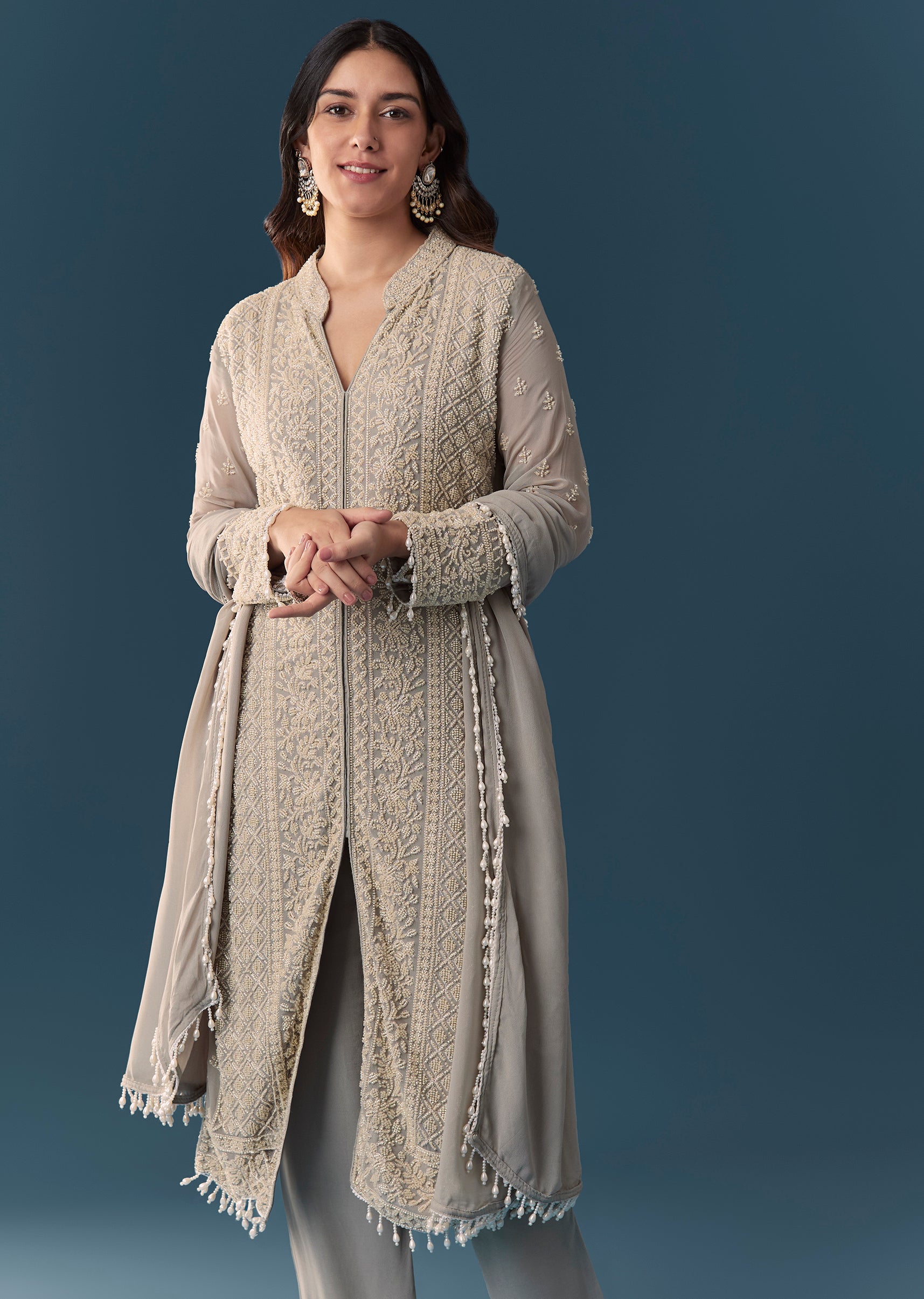Grey Beaded Kurta Set With Pant And Dupatta