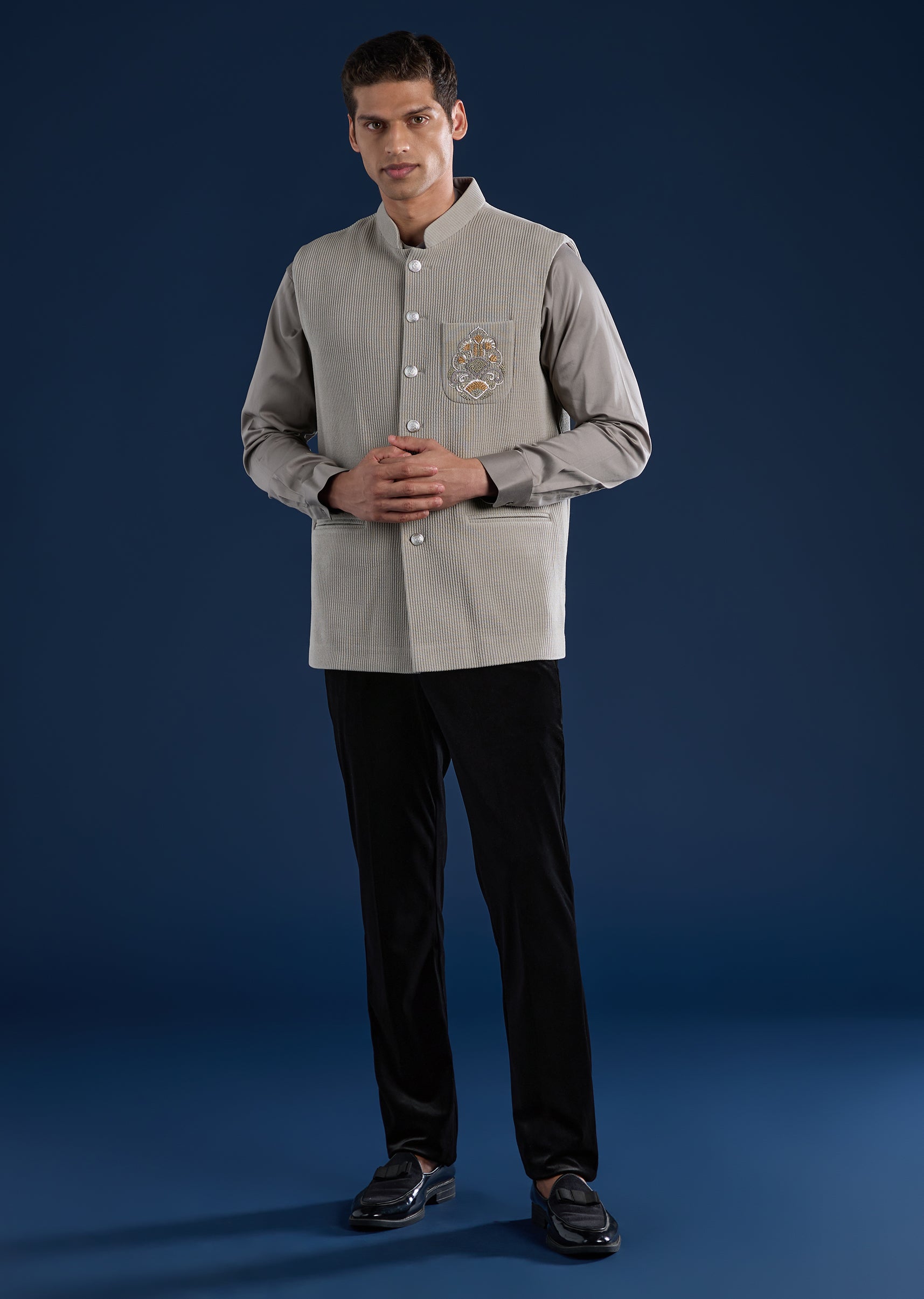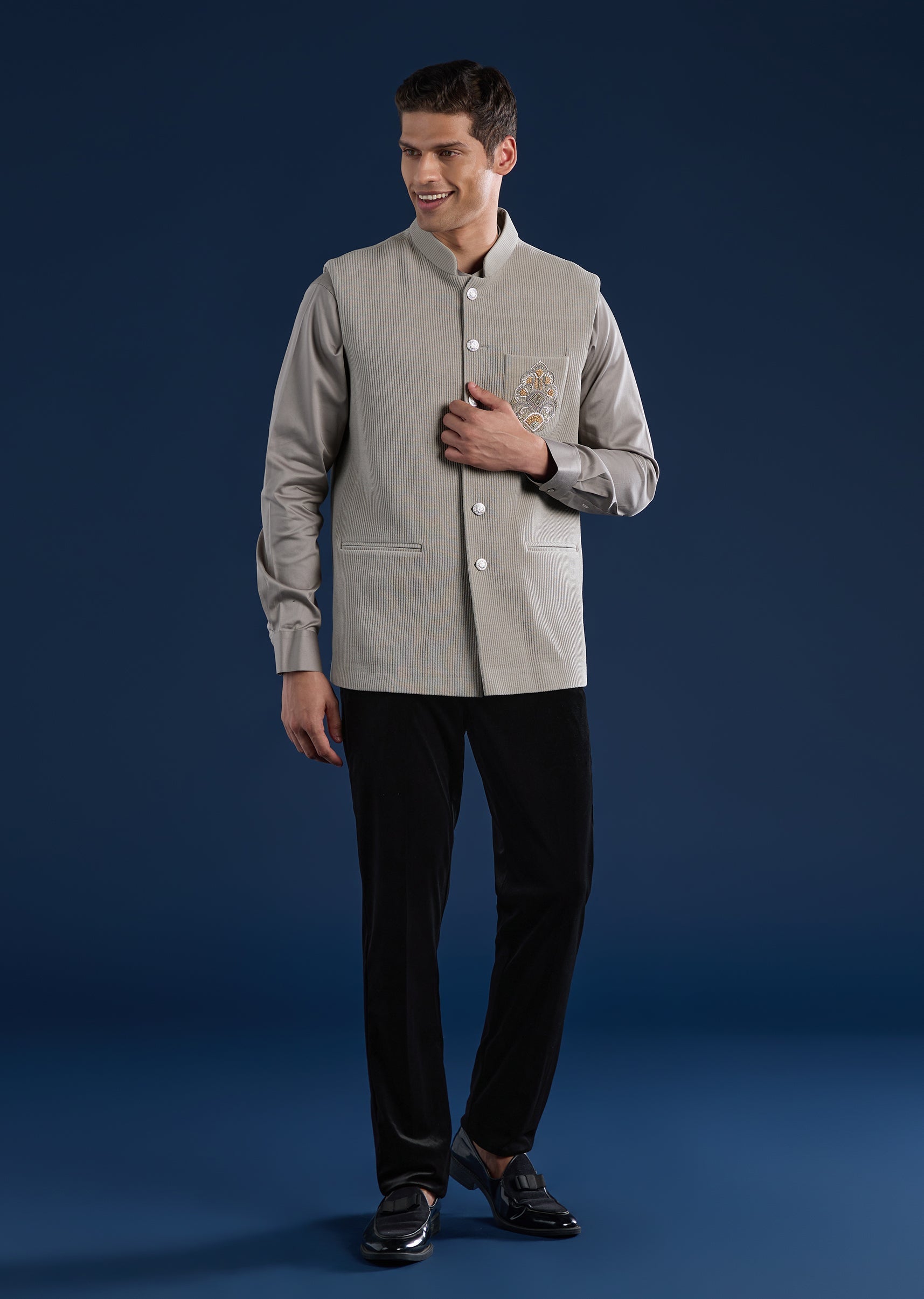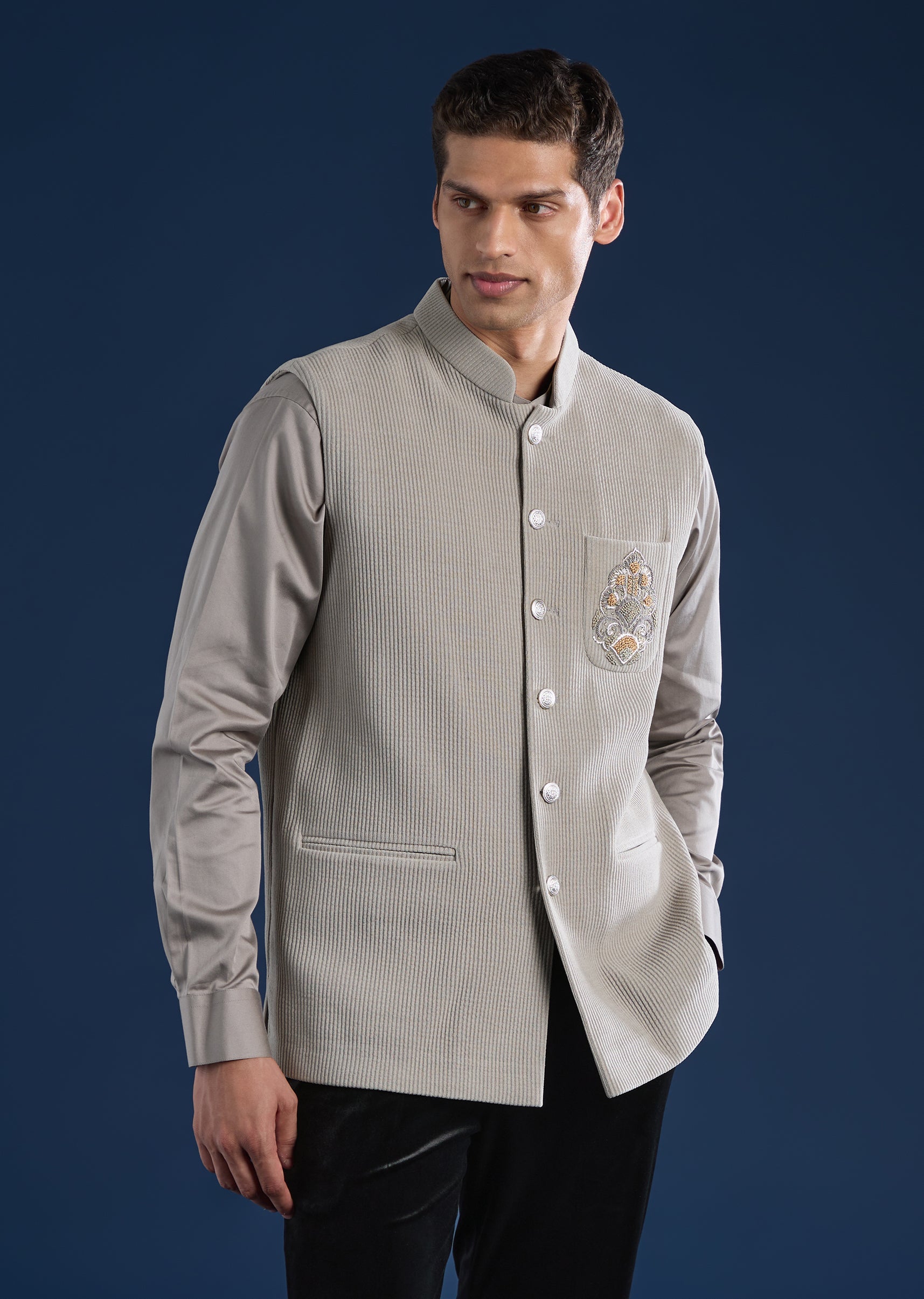 Textured and contemporary, this grey kurta jacket set is crafted in rich corduroy for a refined festive look. Featuring a mandarin collar and full sleeves, the kurta is paired with a corduroy jacket detailed with subtle resham thread work for a modern traditional appeal. Ideal for festive gatherings and evening celebrations. Awarded as the Most Trusted Brand, we're delivering styles you love, just as promised.