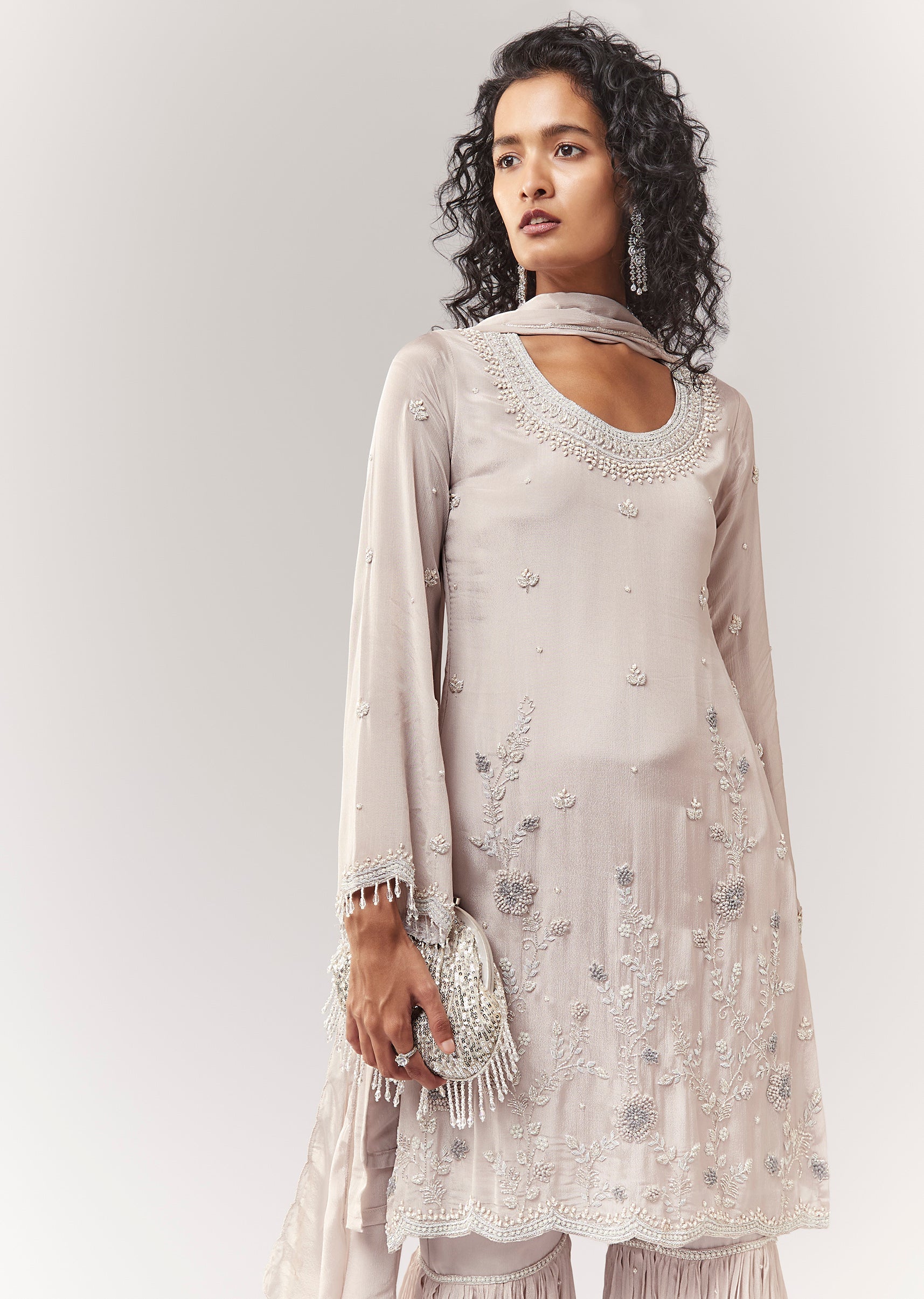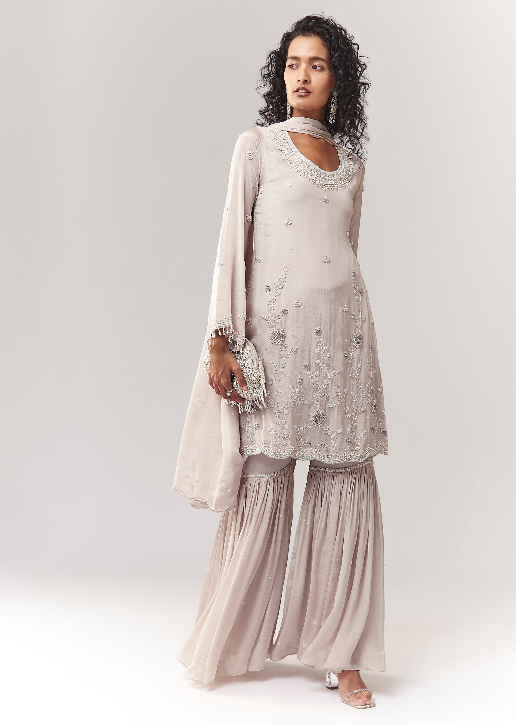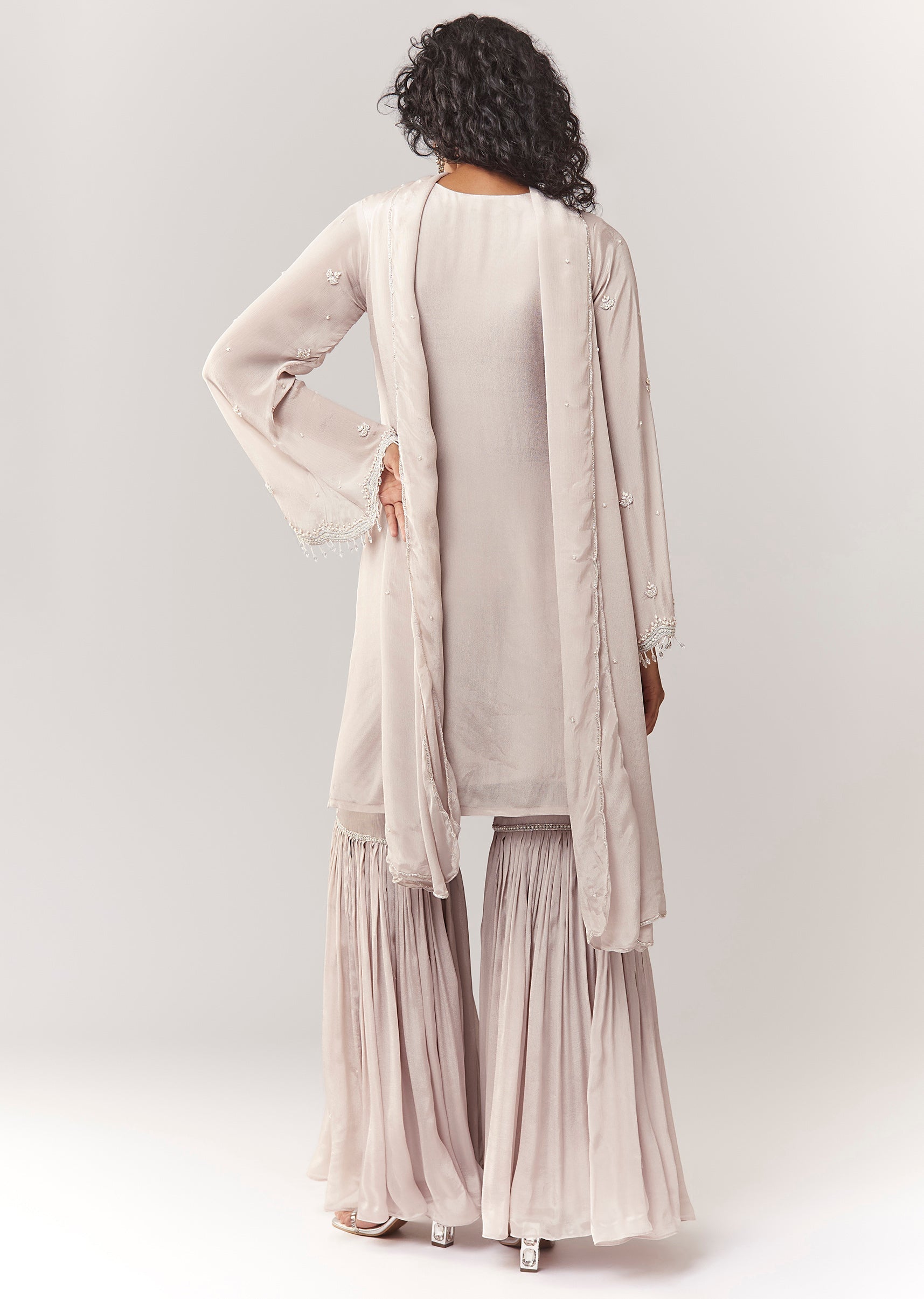 Grey Cutdana And French Knot Kurta Sharara Set With Dupatta