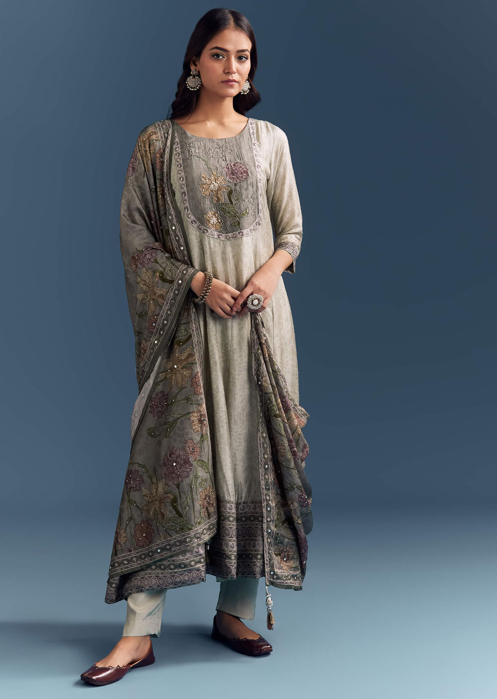 Easy to wear and easy to style, this grey dola silk anarkali suit pairs a fluid drape with a clean floral print. Light embroidery adds definition that reads crisp in... More Product Details