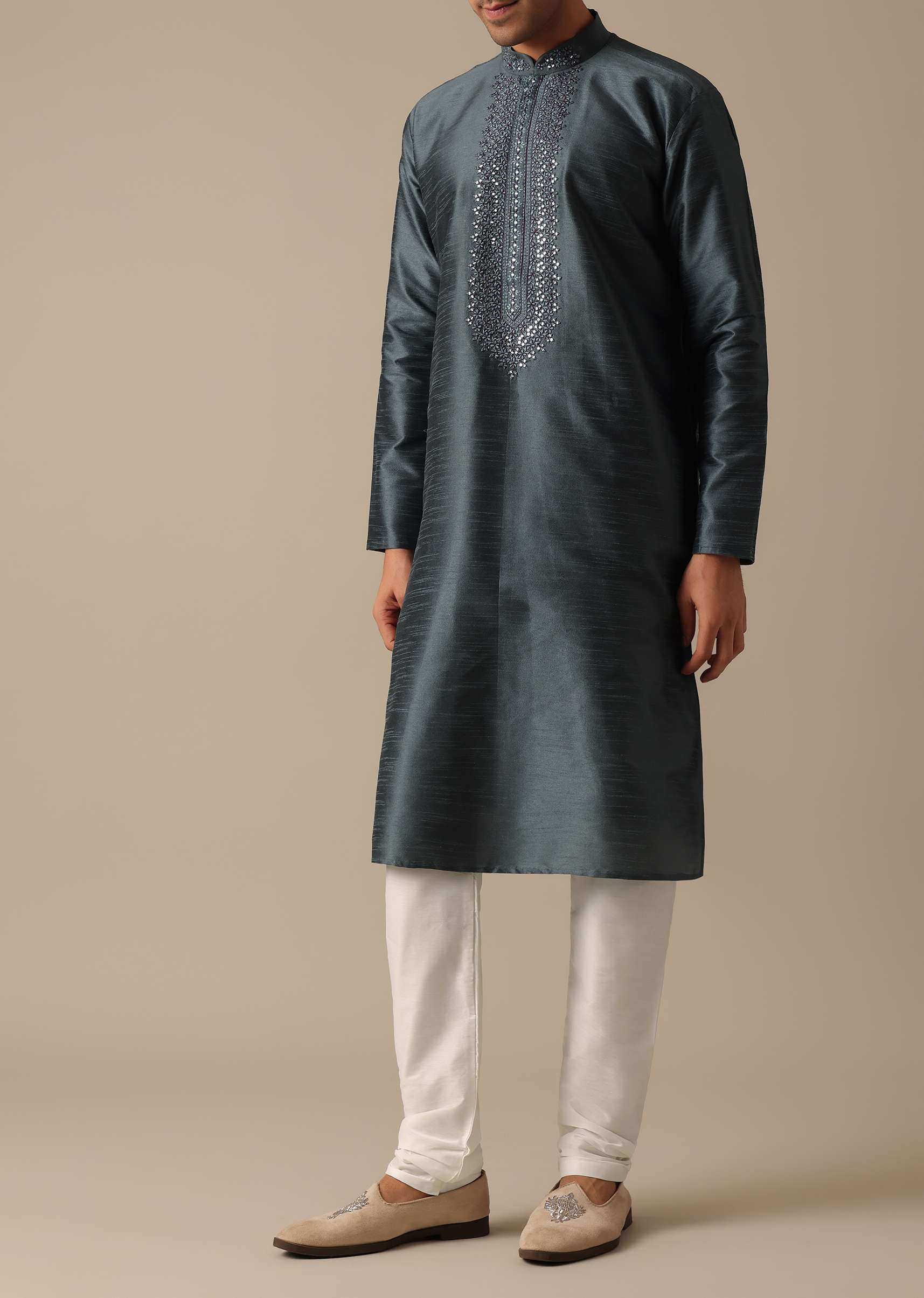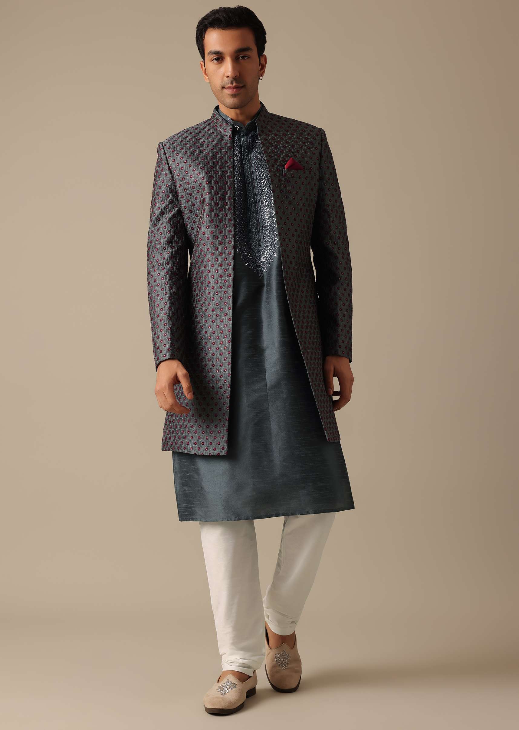 Grey Dupion Silk Sherwani Set With Mirror Work