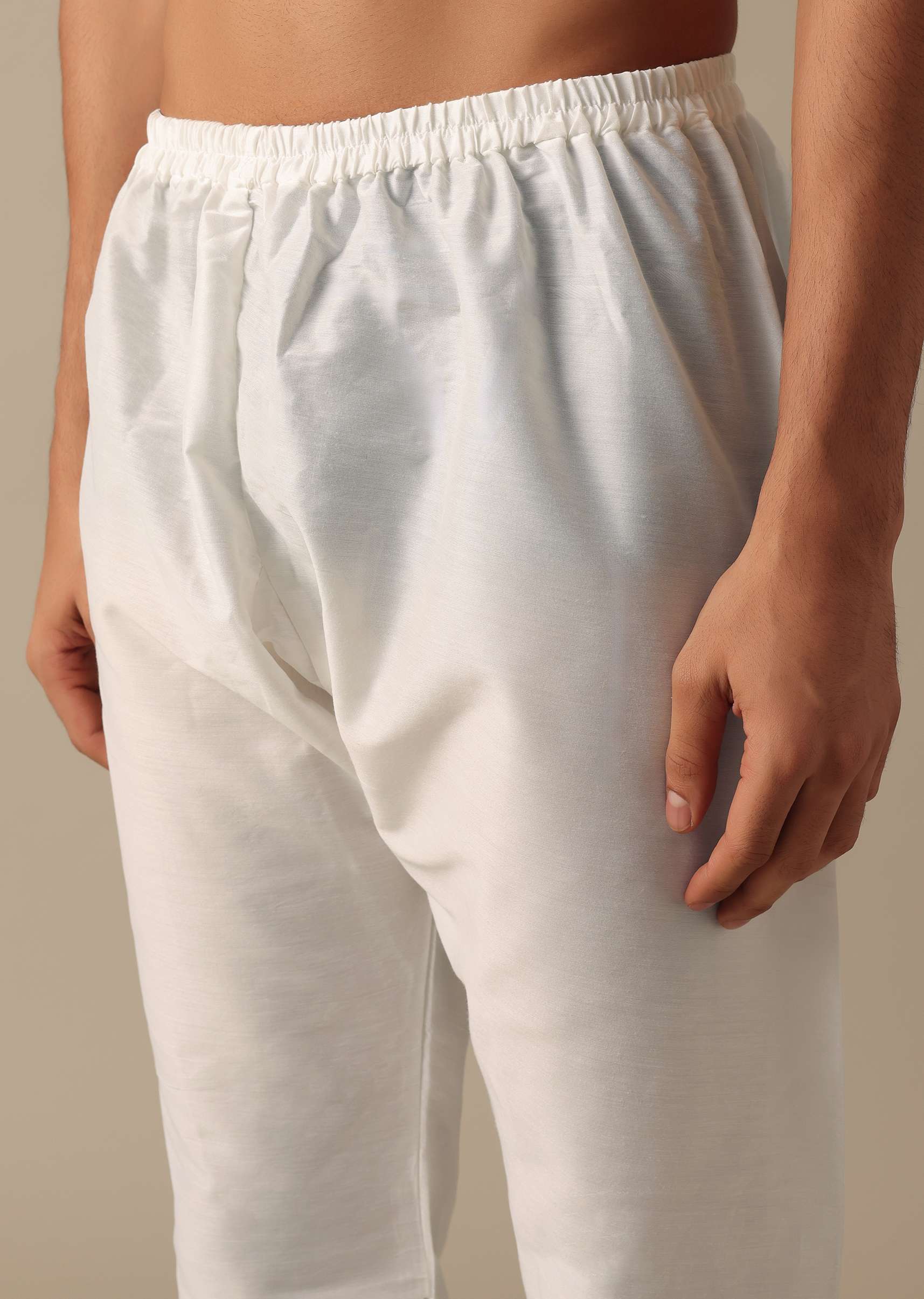 Step out in this stylish sherwani set at the next big wedding to leave a lasting impression. Enhanced with sparkly mirrors, the open front sherwani features detailed thread work. Crafted in Dupion silk, it is paired with a complementing kurta and churidar. Providing a stylish fit, this set of three will help you steal the spotlight. Awarded as the Most Trusted Brand, we're delivering styles you love, just as promised.