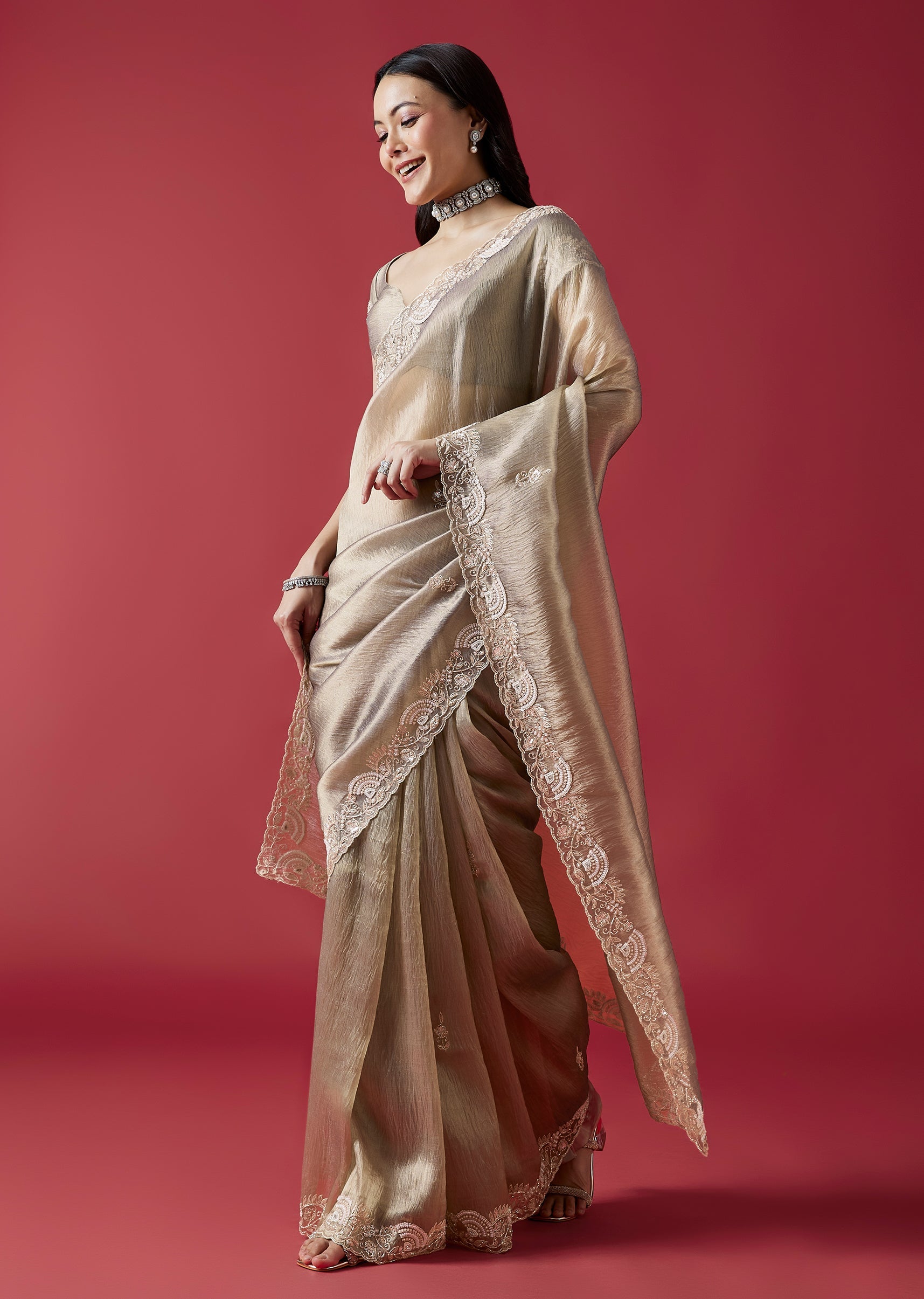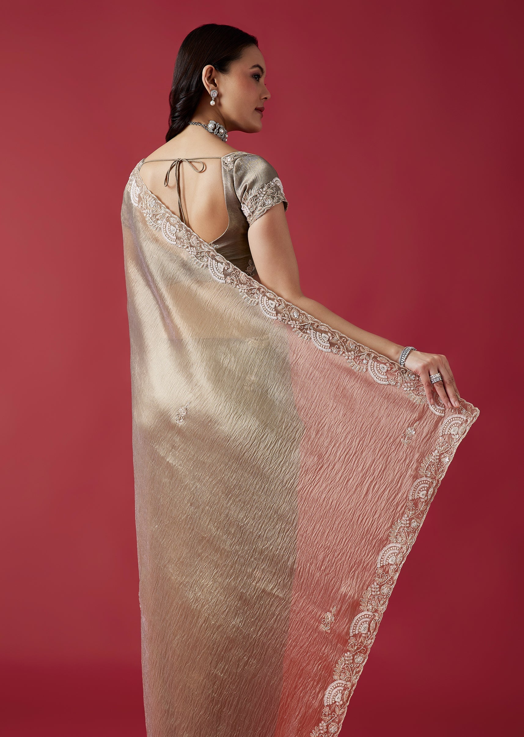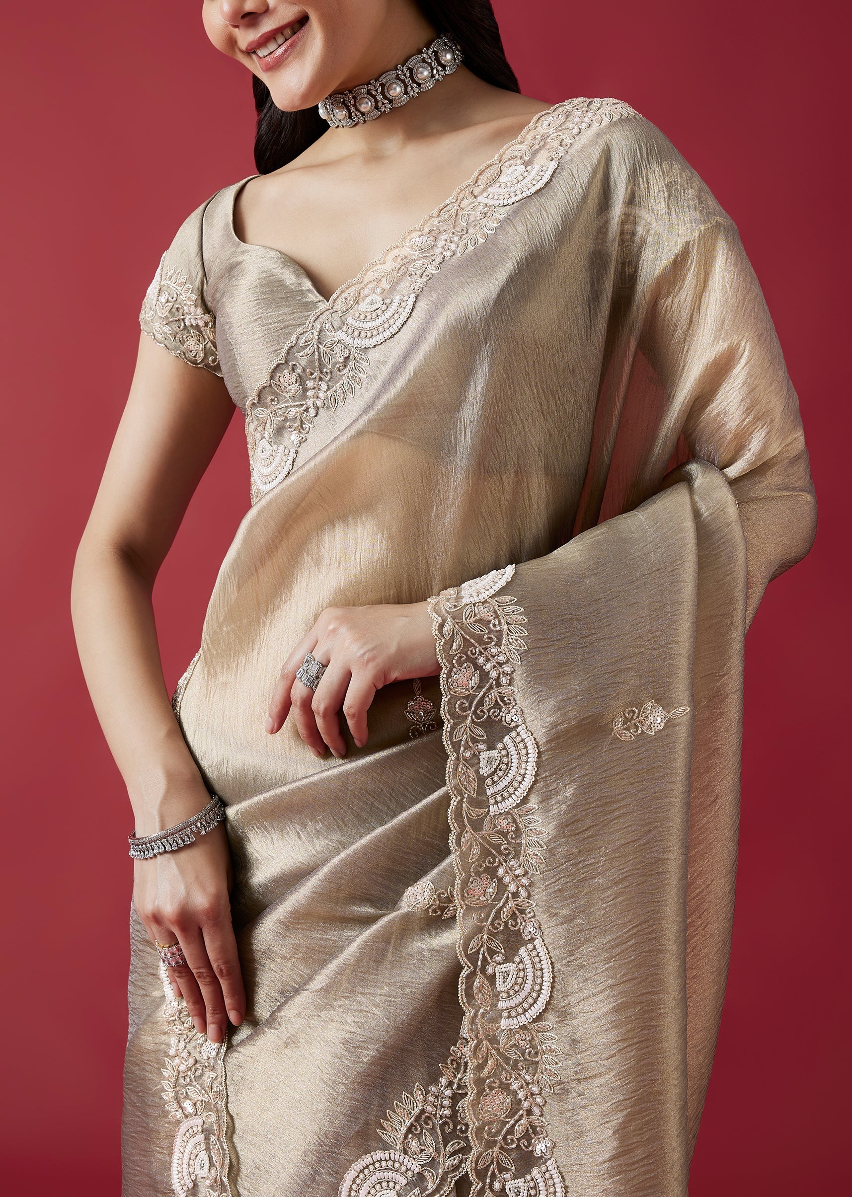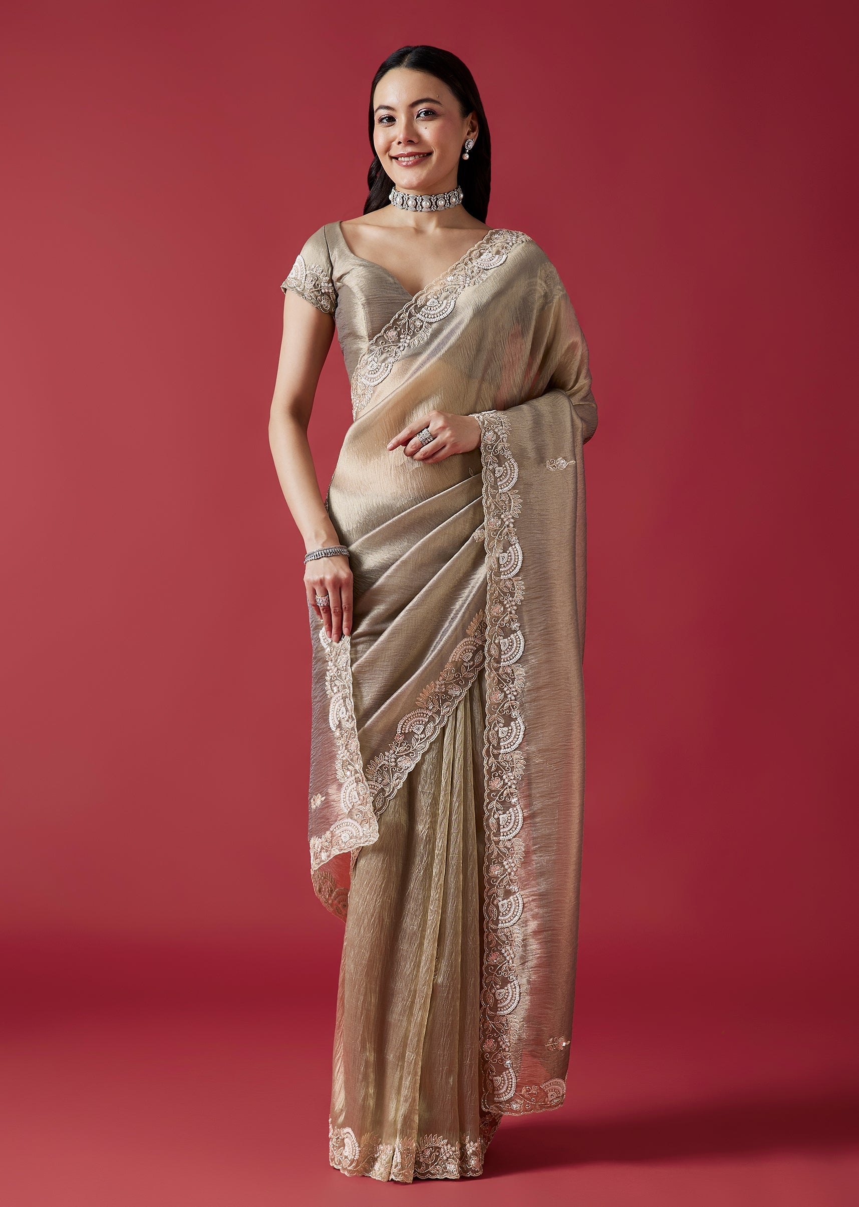 This elegant grey crush tissue saree features a detailed cutwork border and intricate embroidery with cutdana, sequins, beads and zardosi accents. The coordinated embroidered blouse fabric adds a refined wedding guest appeal. Awarded as the Most Trusted Brand, we're delivering styles you love, just as promised.