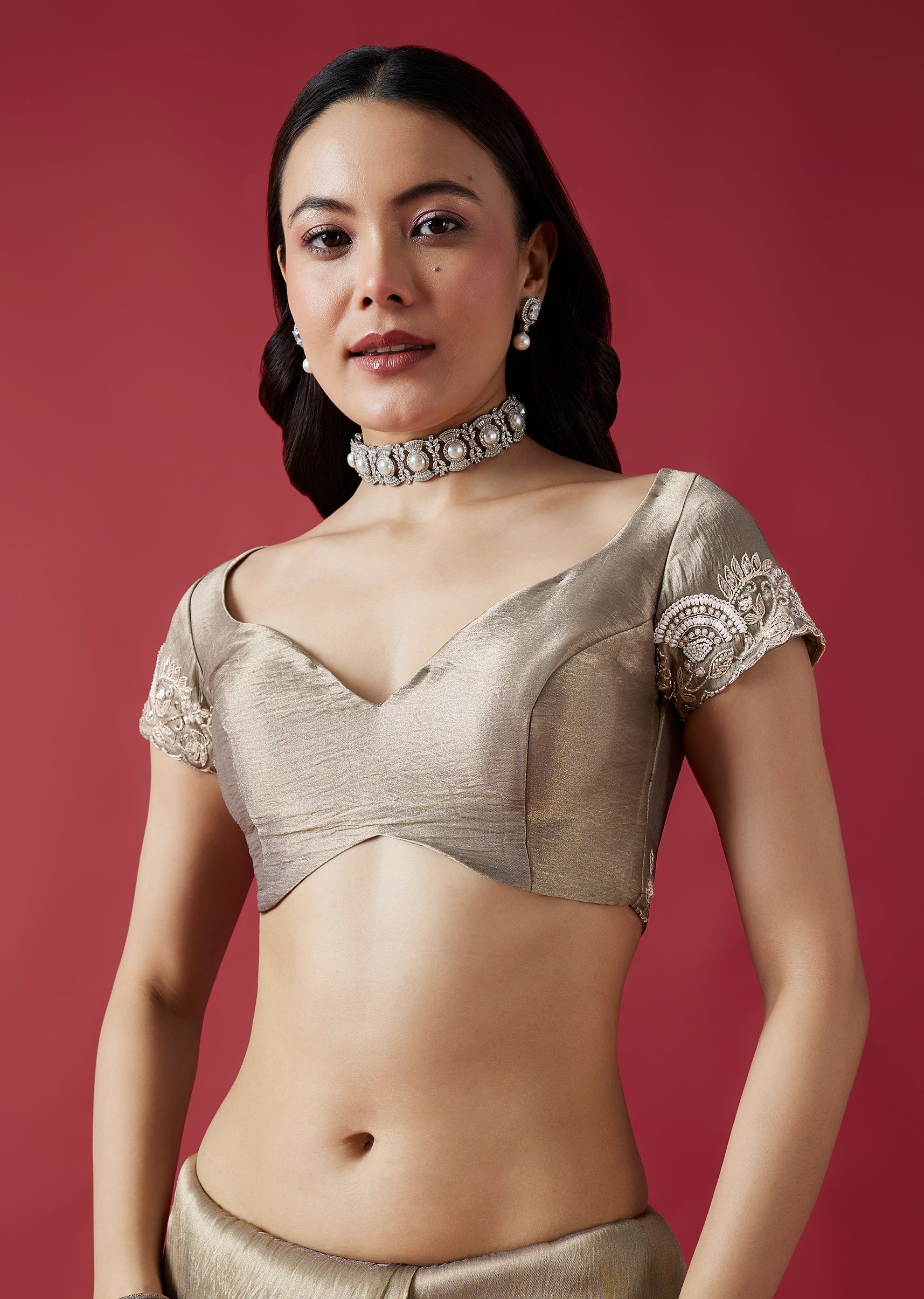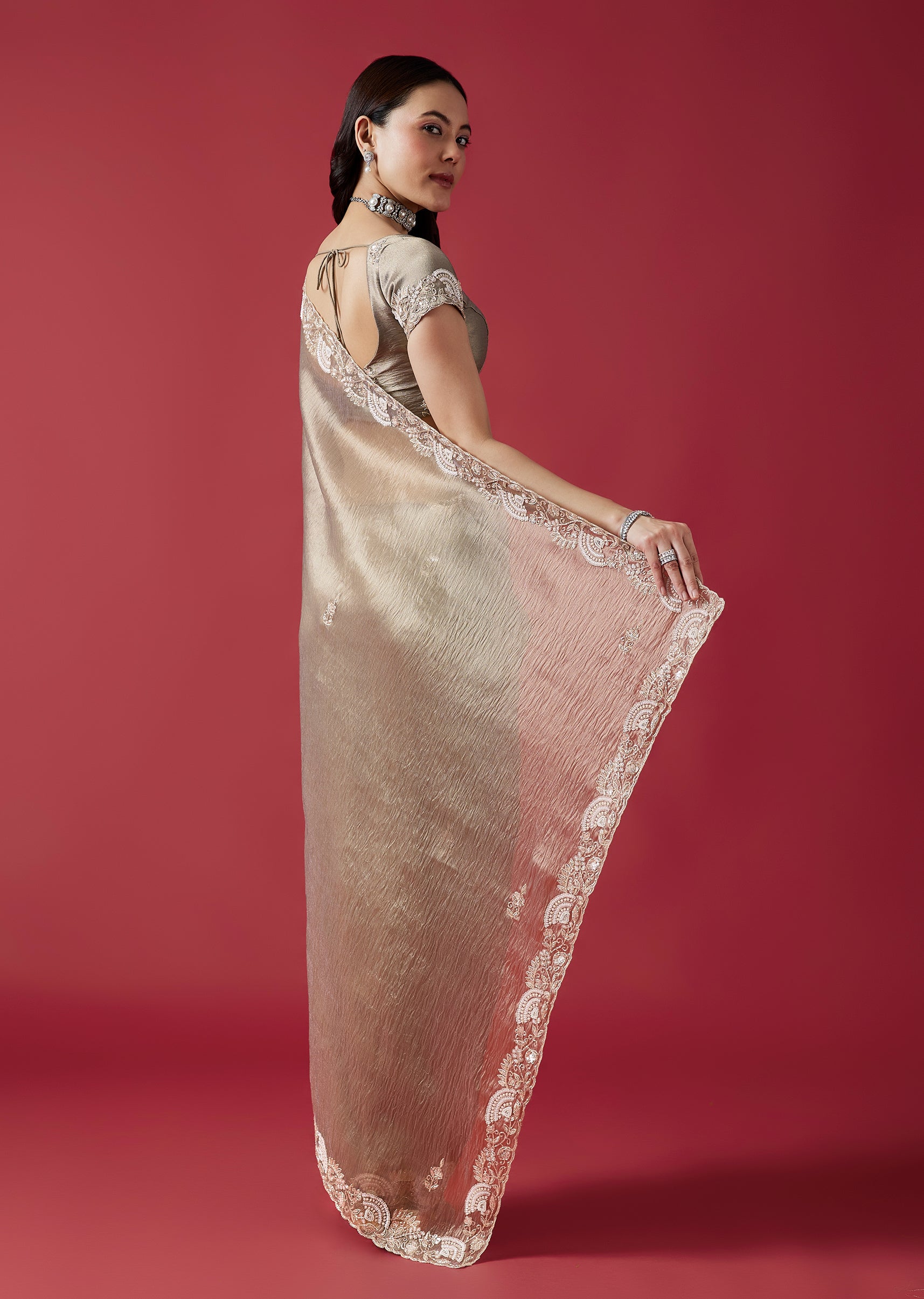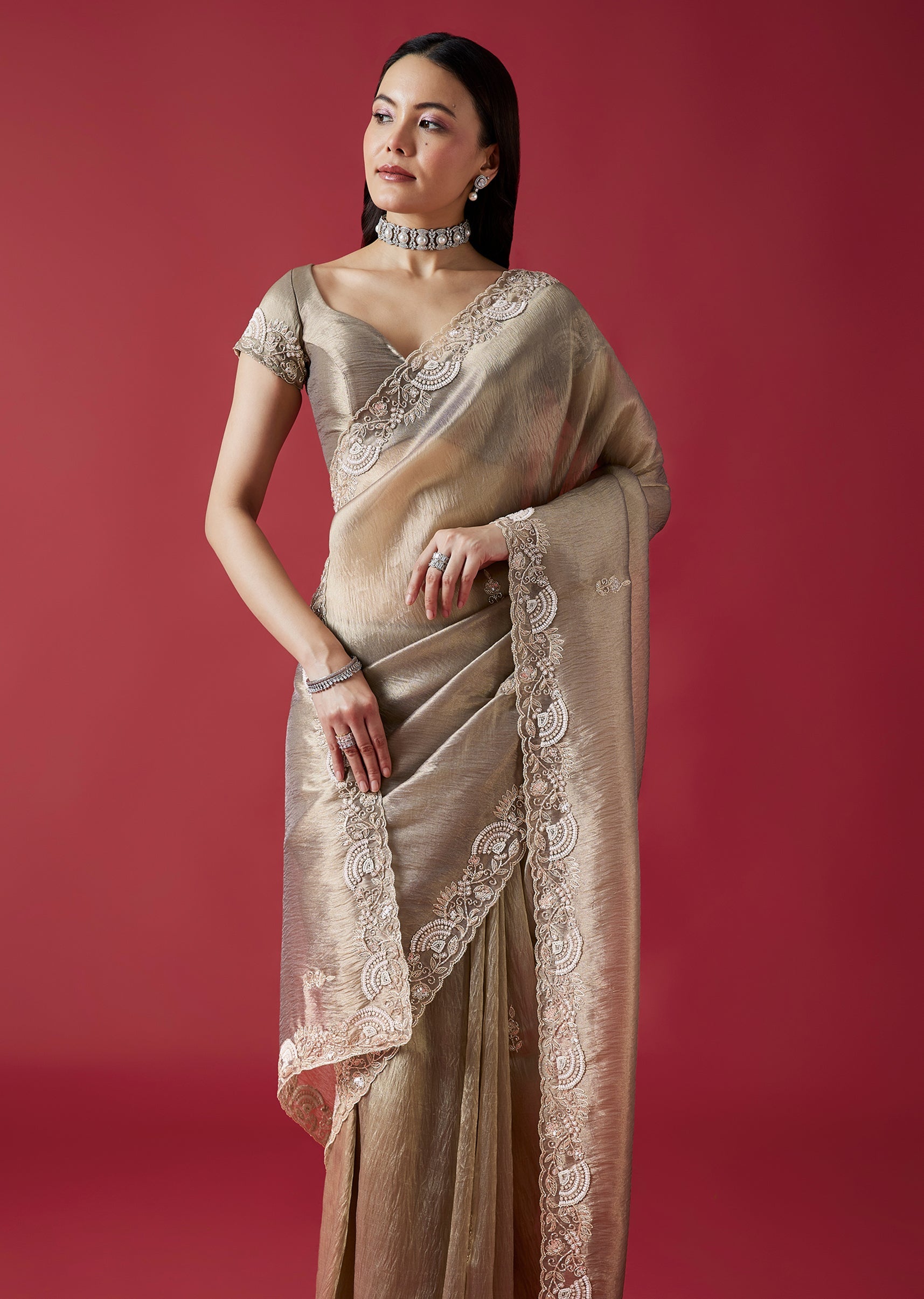 This elegant grey crush tissue saree features a detailed cutwork border and intricate embroidery with cutdana, sequins, beads and zardosi accents. The coordinated embroidered blouse fabric adds a refined wedding... More Product Details