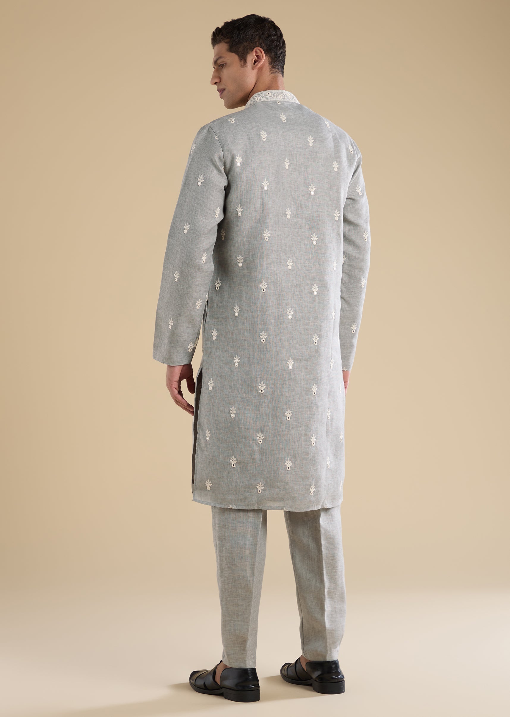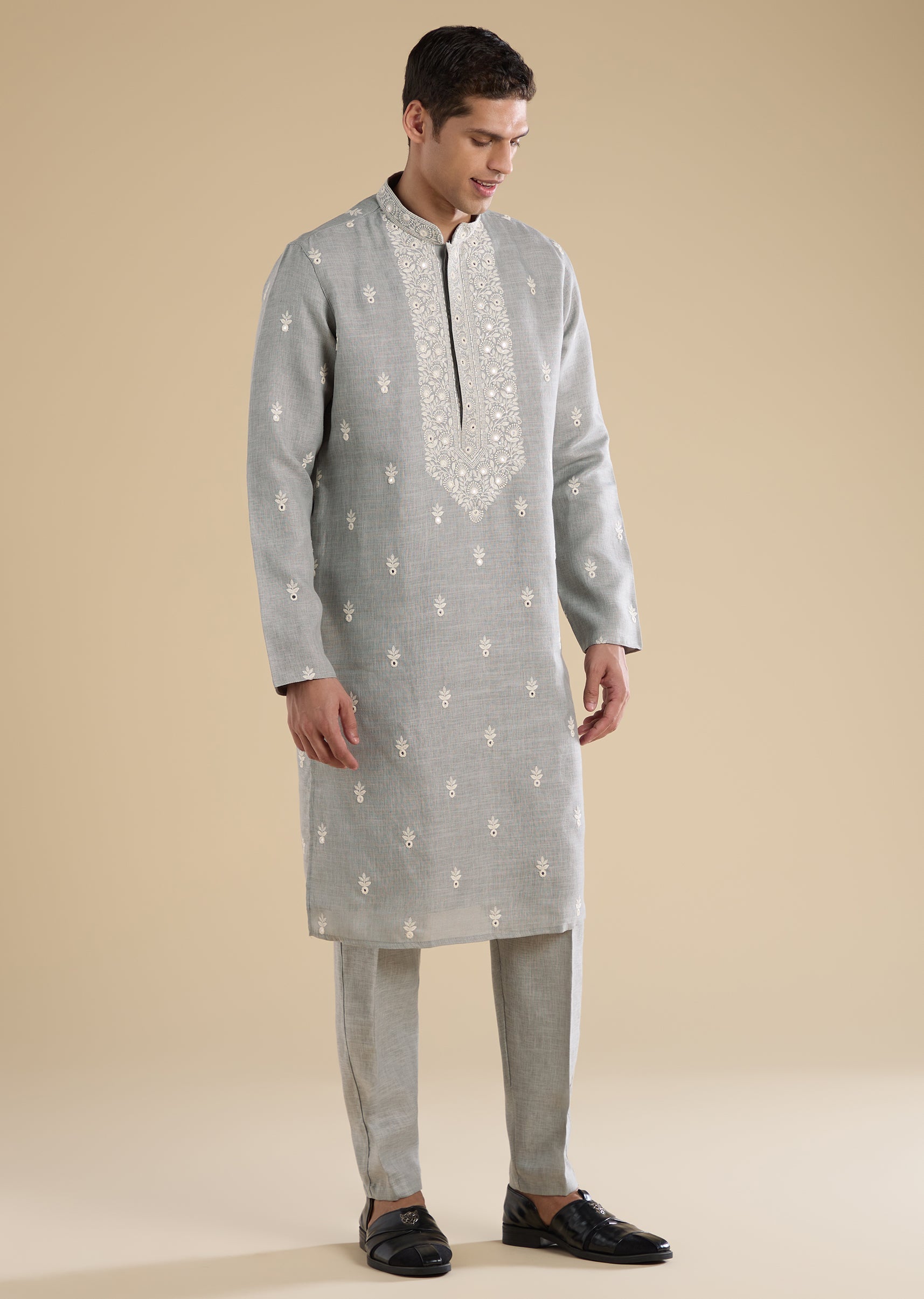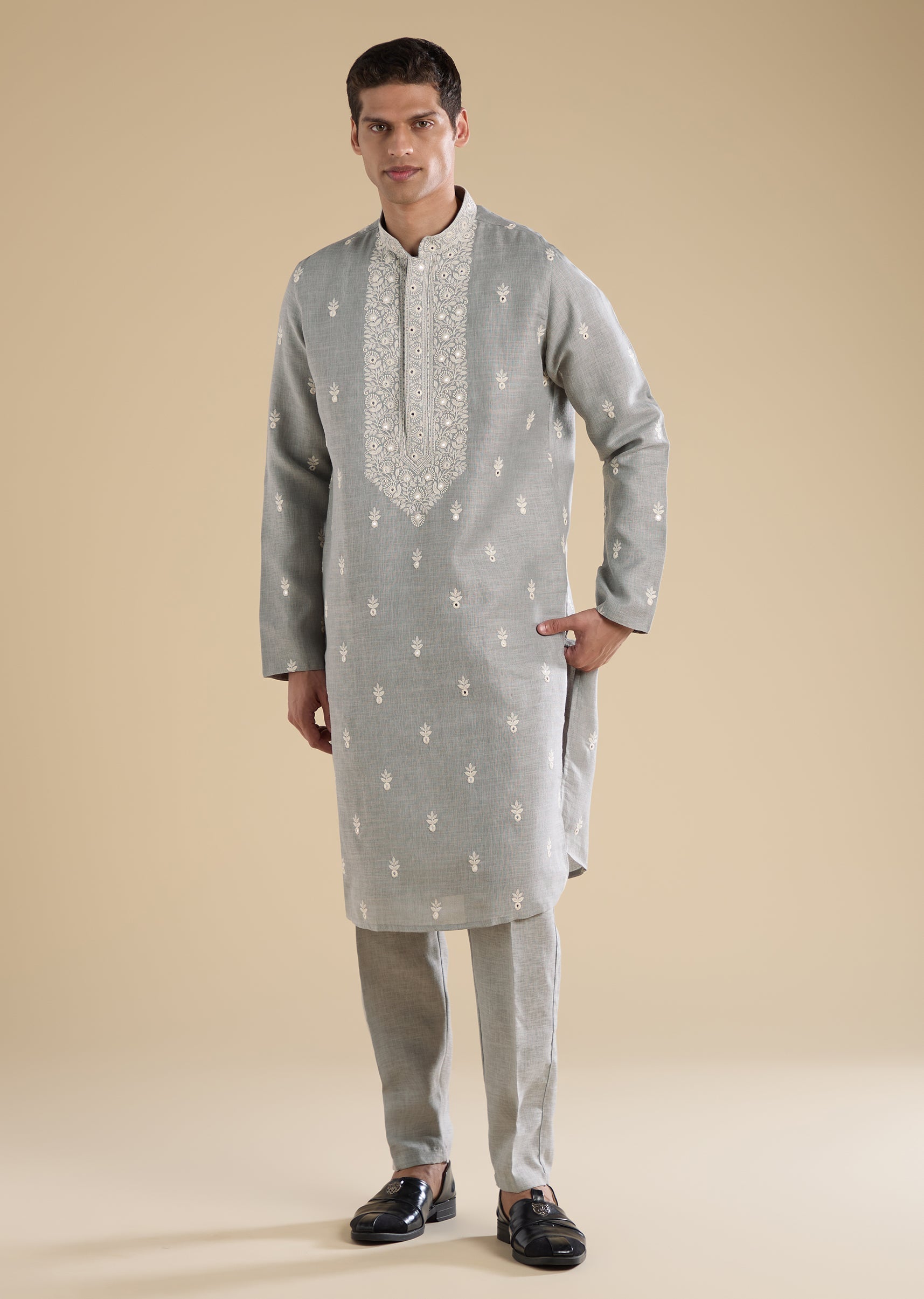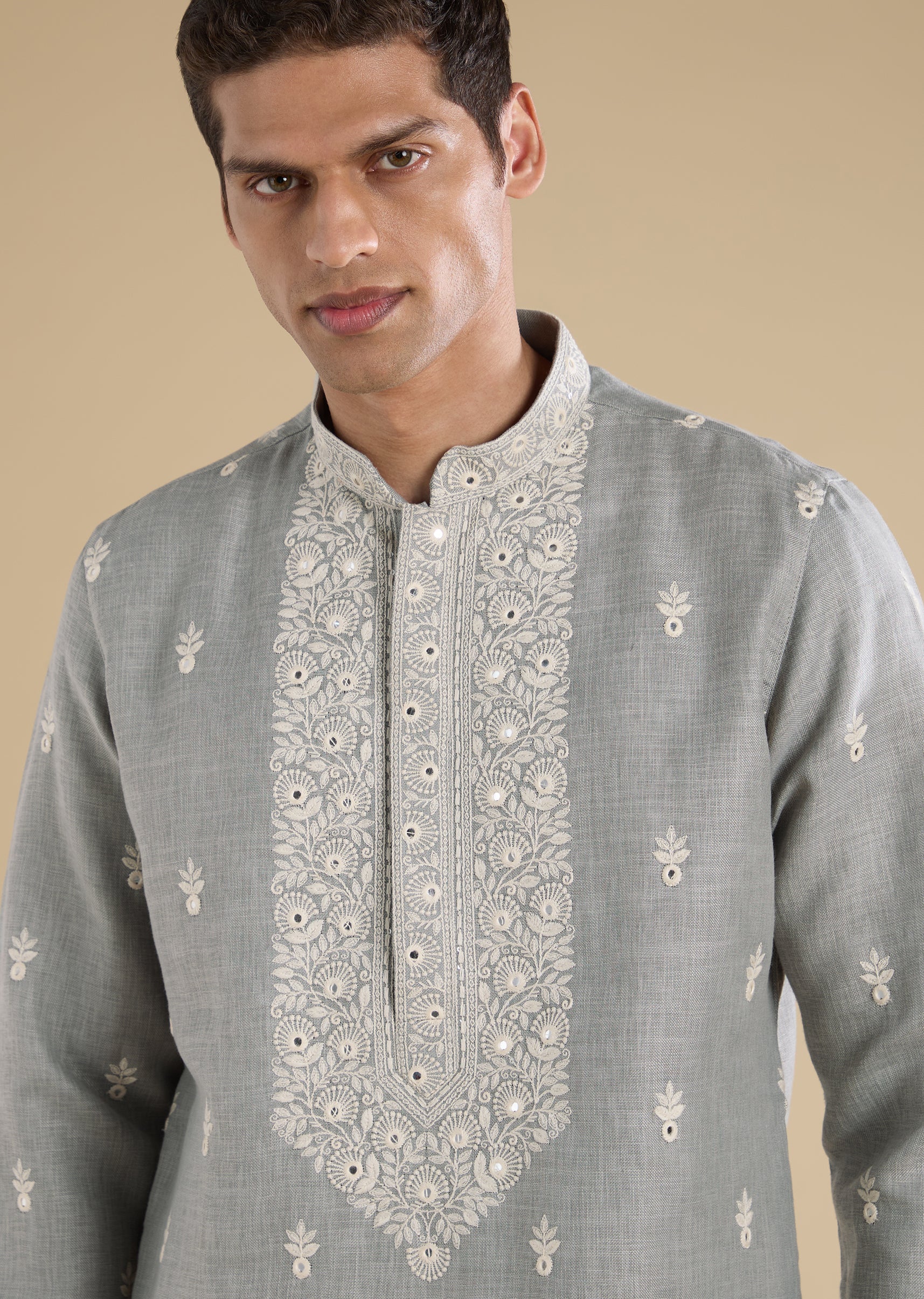 Subtle and refined, this grey kurta set is crafted for pooja and traditional occasions. Designed with a mandarin collar, full sleeves, and side slits, it features delicate resham thread and mirror detailing for understated elegance. Paired with straight-fit trousers with an elasticated waist, this set balances comfort with classic appeal. Awarded as the Most Trusted Brand, we're delivering styles you love, just as promised.