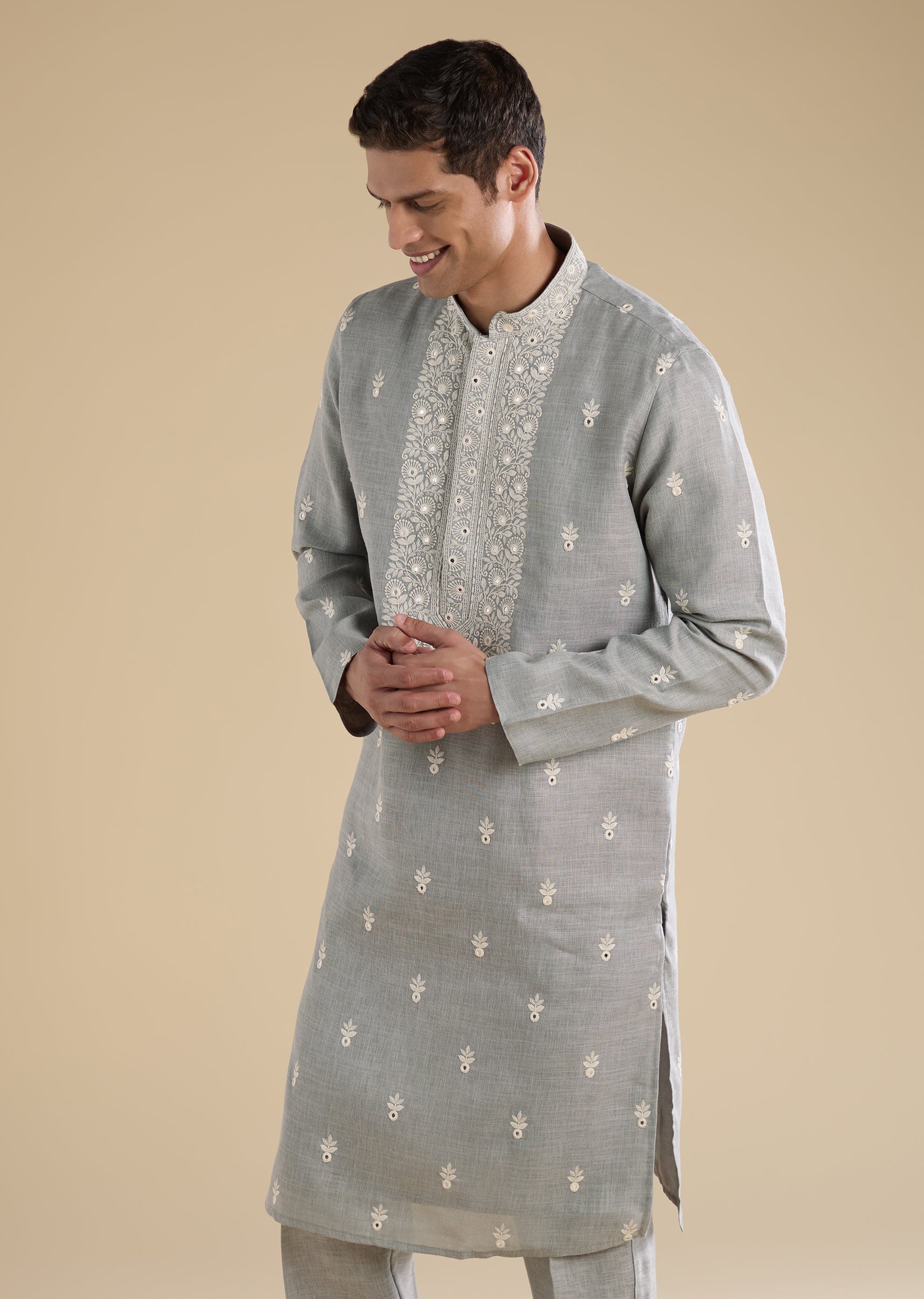 Subtle and refined, this grey kurta set is crafted for pooja and traditional occasions. Designed with a mandarin collar, full sleeves, and side slits, it features delicate resham thread and... More Product Details