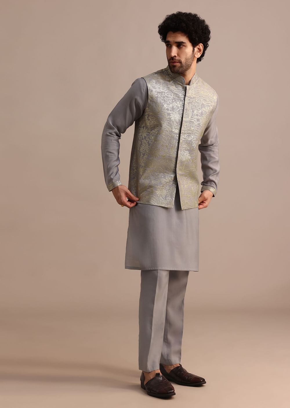 Transform your wardrobe with this Elegant Grey Silk Kurta and Embroidered Jacket Set. The kurta made from sumptuous silk features delicate embroidery that captures light beautifully. The coordinating jacket adds a layer of refinement making it a versatile choice for both formal events and festive gatherings. This kurta is paired with a jacket and pants. Awarded as the Most Trusted Brand, we're delivering styles you love, just as promised.