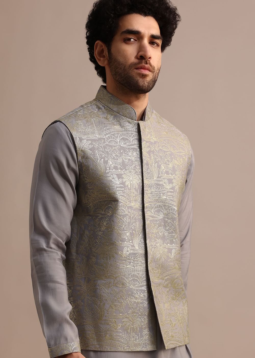 Grey Embroidered Silk Kurta Jacket Set For Men