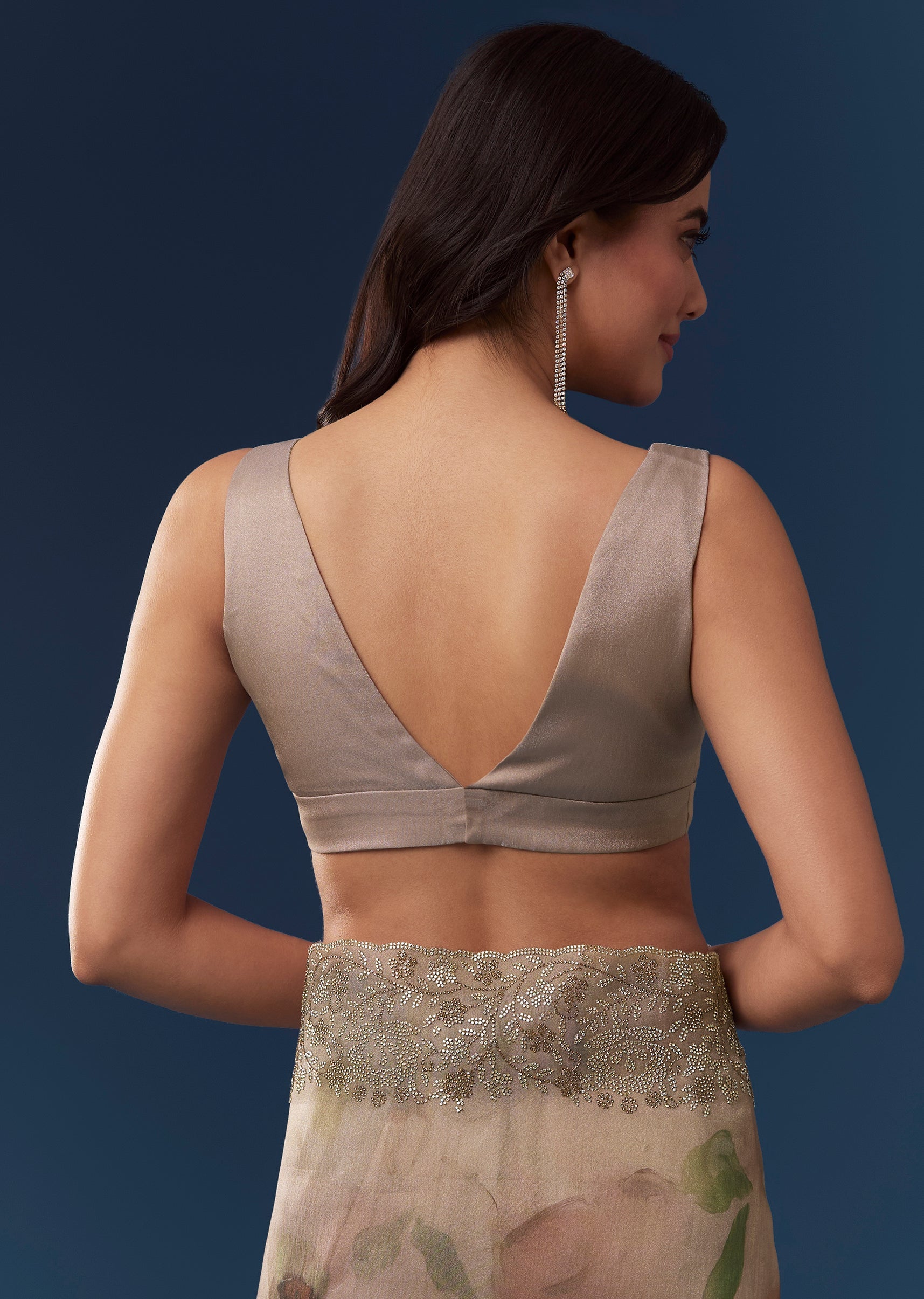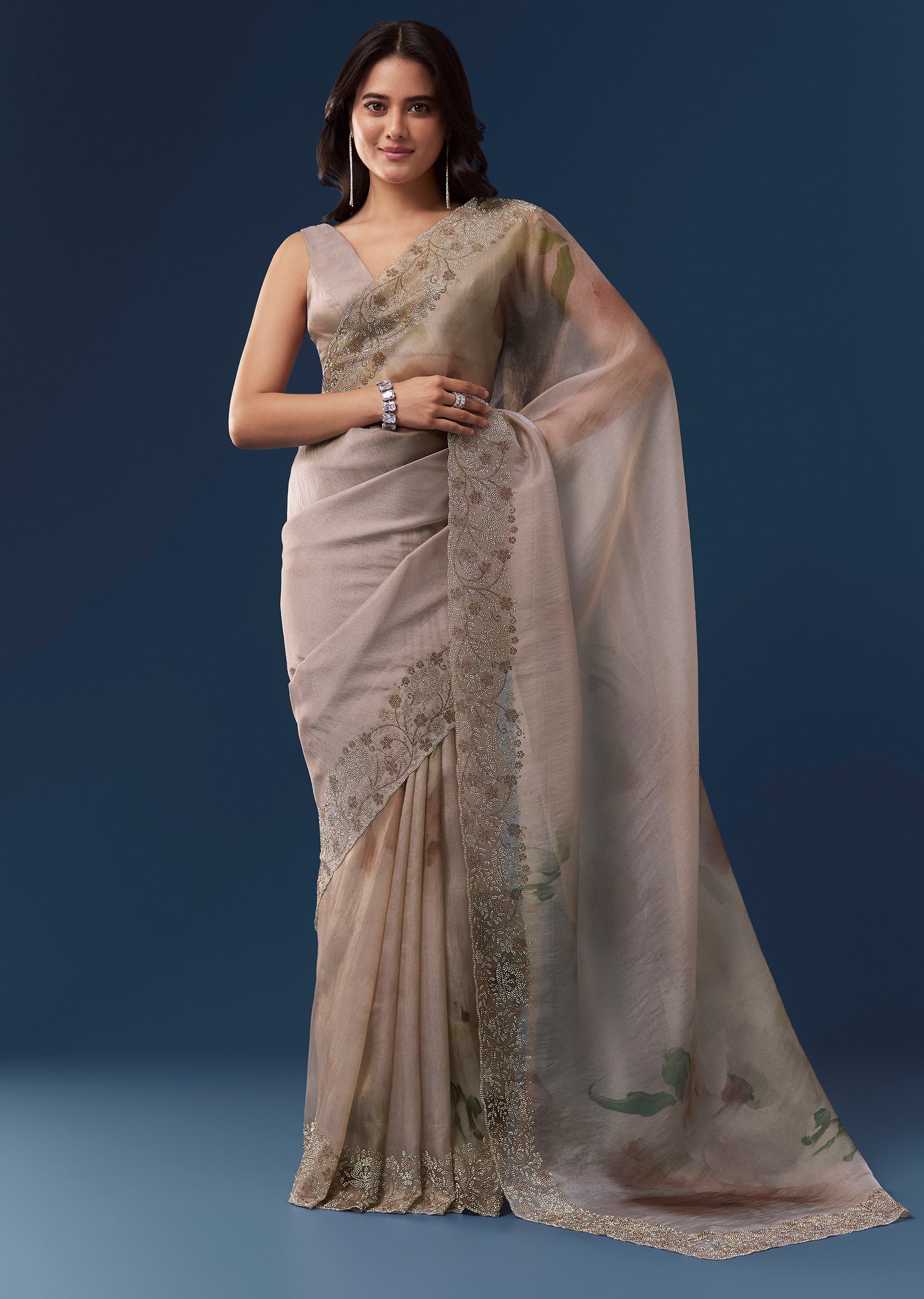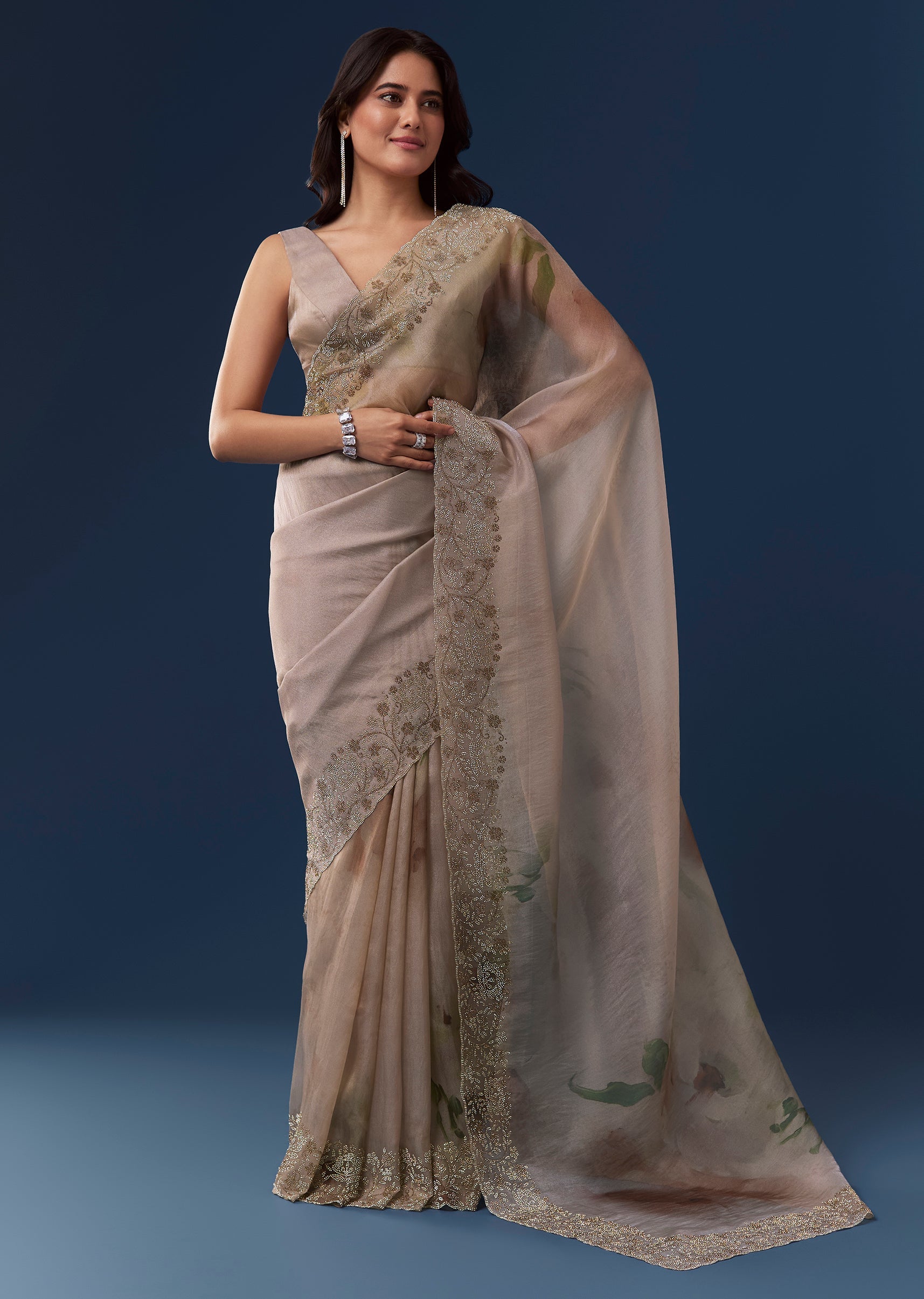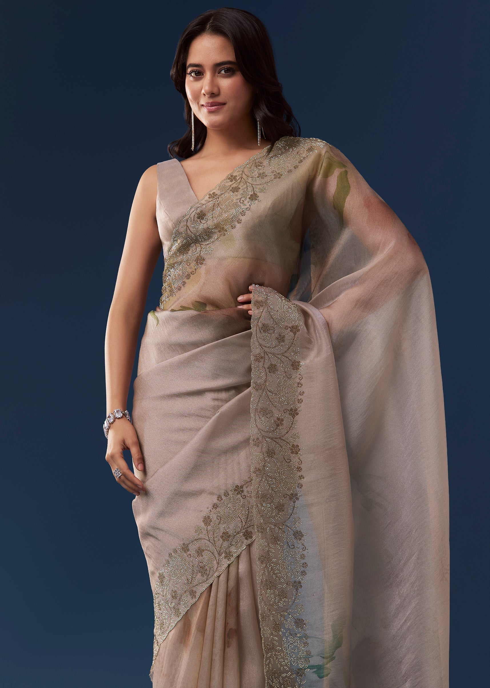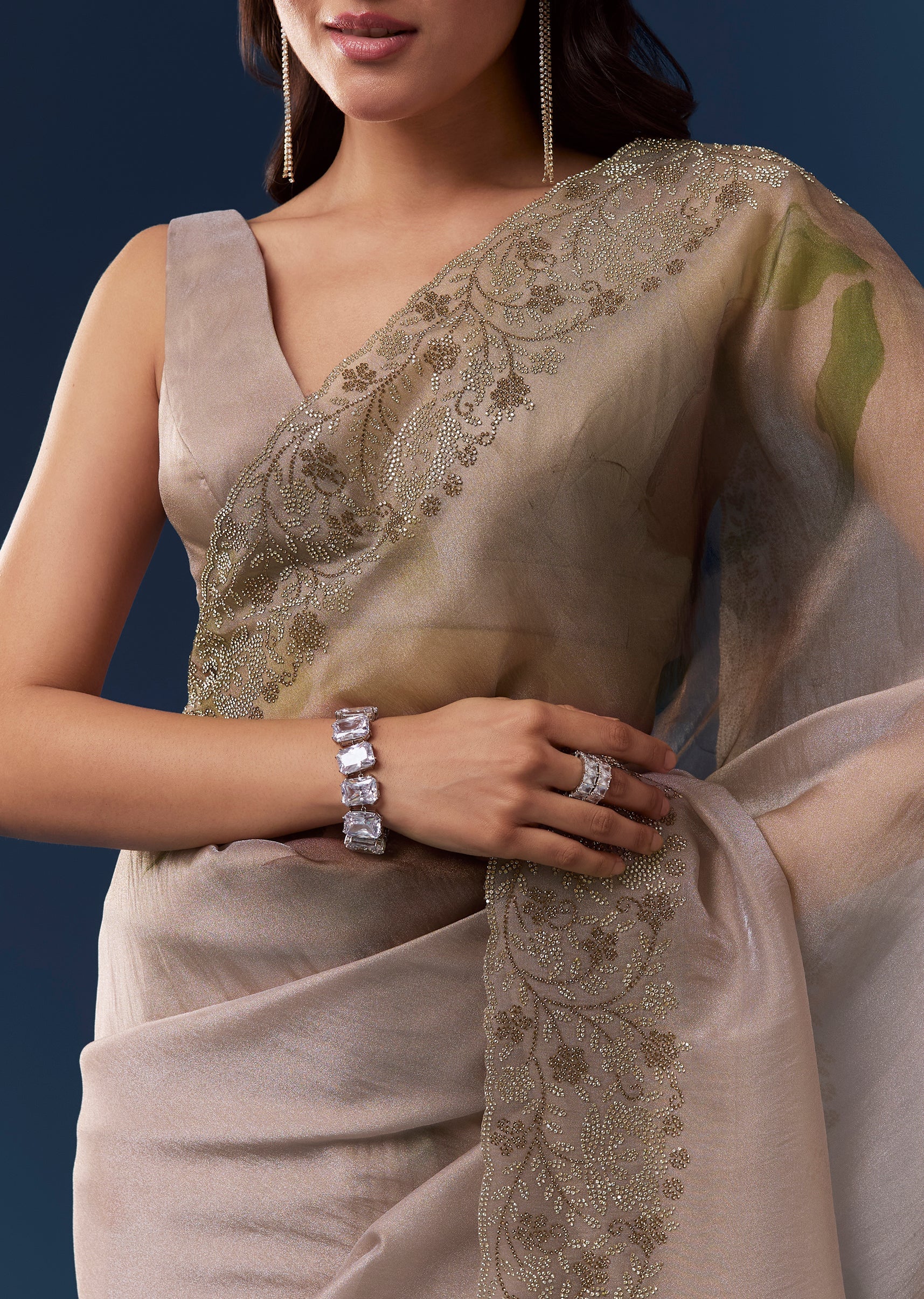 Grey Floral Printed Tissue Saree With Stone Embellished Border