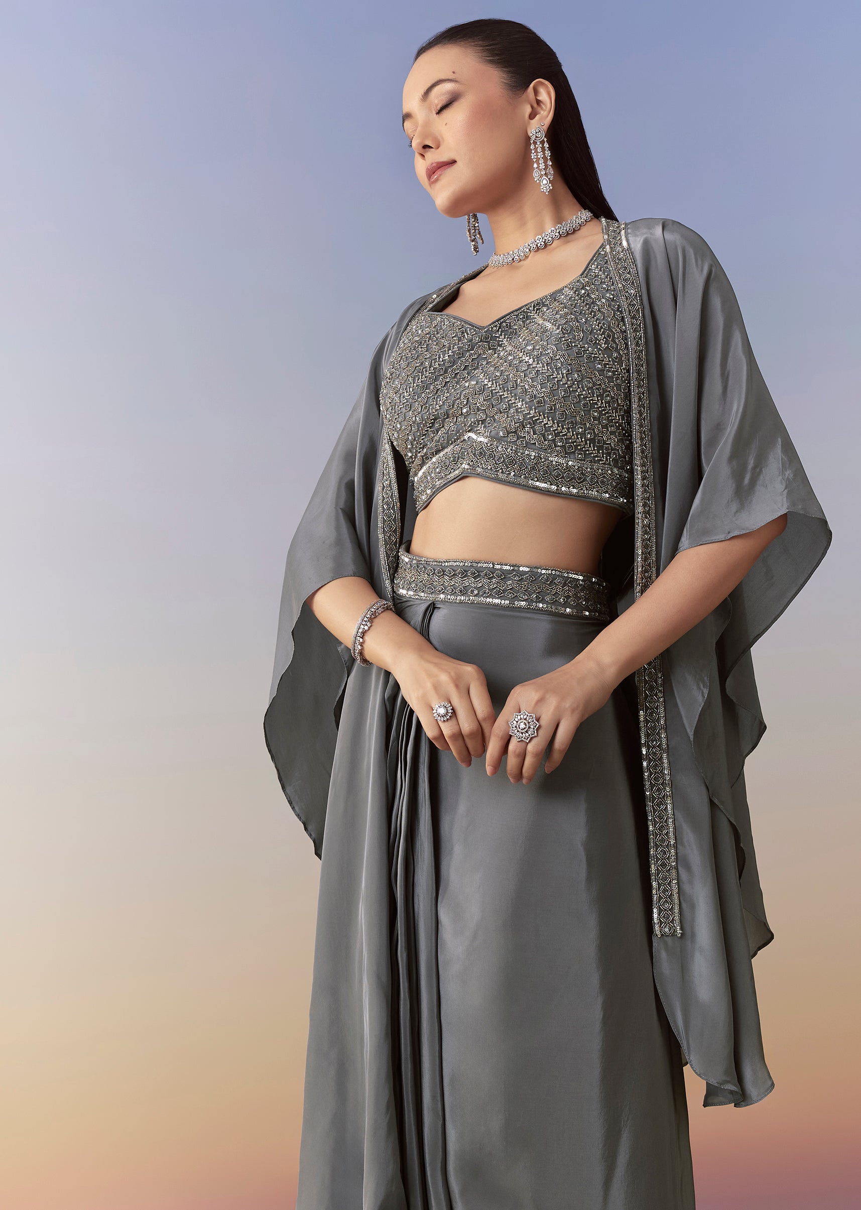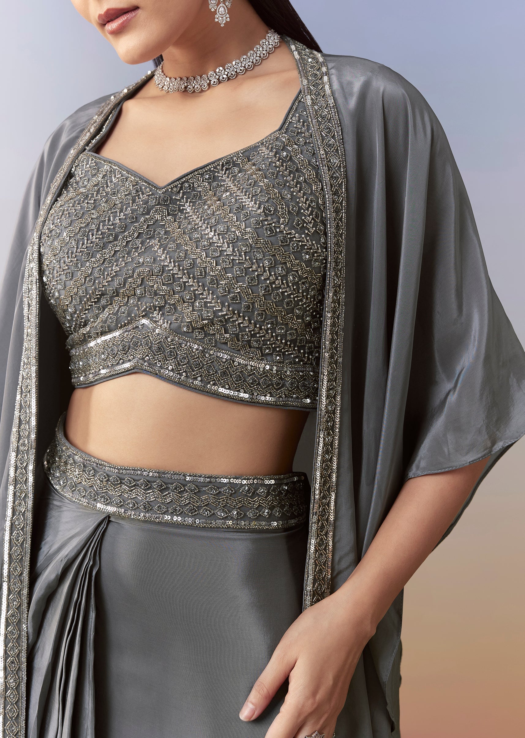 Grey Indo Western Embellished Crop Top Cape Set