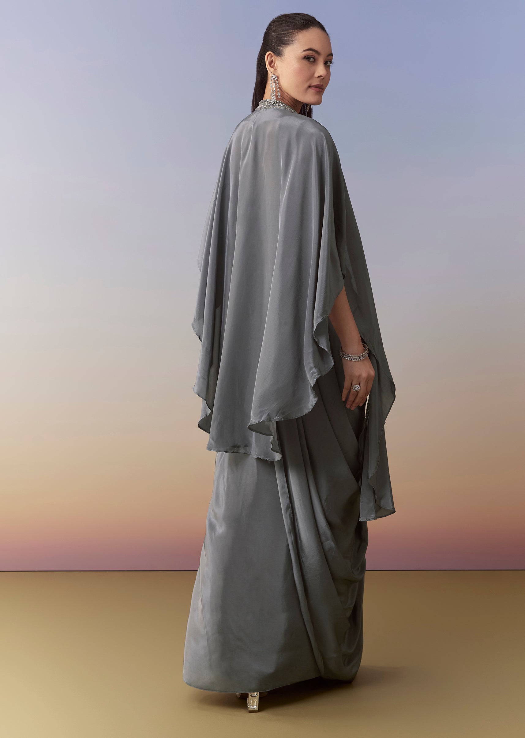 Pair with statement earrings and a sleek ponytail to highlight the cape’s flow and the crop top’s sparkle.