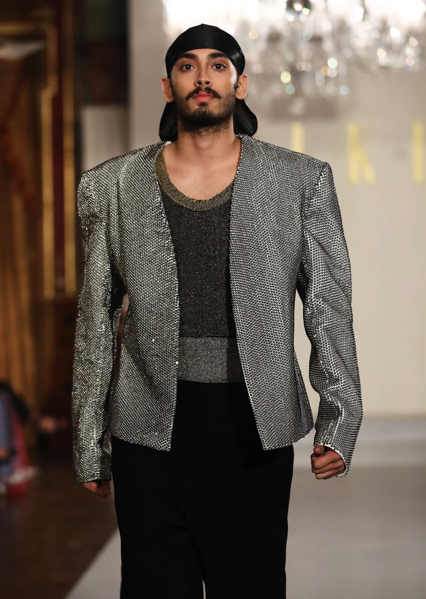 A tailored attitude lands instantly once this grey and black Indo-western men's suit in suiting fabric pairs bead accents with embroidery across the blazer. The coordinated waistcoat and ganji add... More Product Details